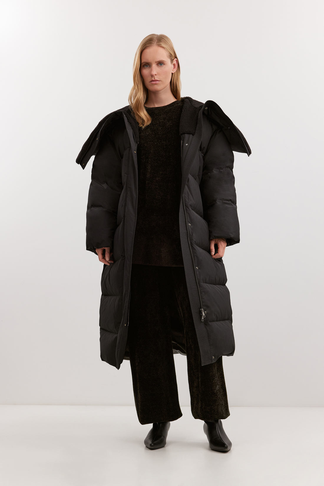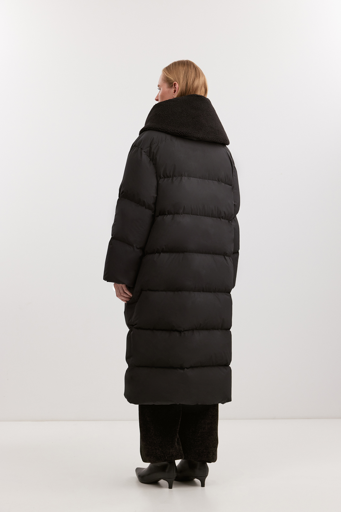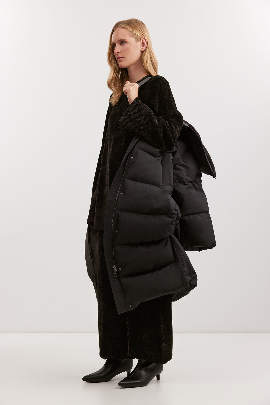 Женское удлинённое пуховое пальто-кокон BAON выполнено в свободном оверсайз-крое с заужением к низу и объёмом под проймой. Благодаря WR-пропитке и PUFFER-обработке ткань устойчива к влаге и ветру. Натуральный утеплитель (80/20 пух/перо, Fill Power 600) сохраняет тепло до –20 °C, делая модель универсальной для зимы и демисезона. Внутри — плечевые стропы для переноски и карман на молнии. Доступно в больших размерах, в классическом чёрном цвете.