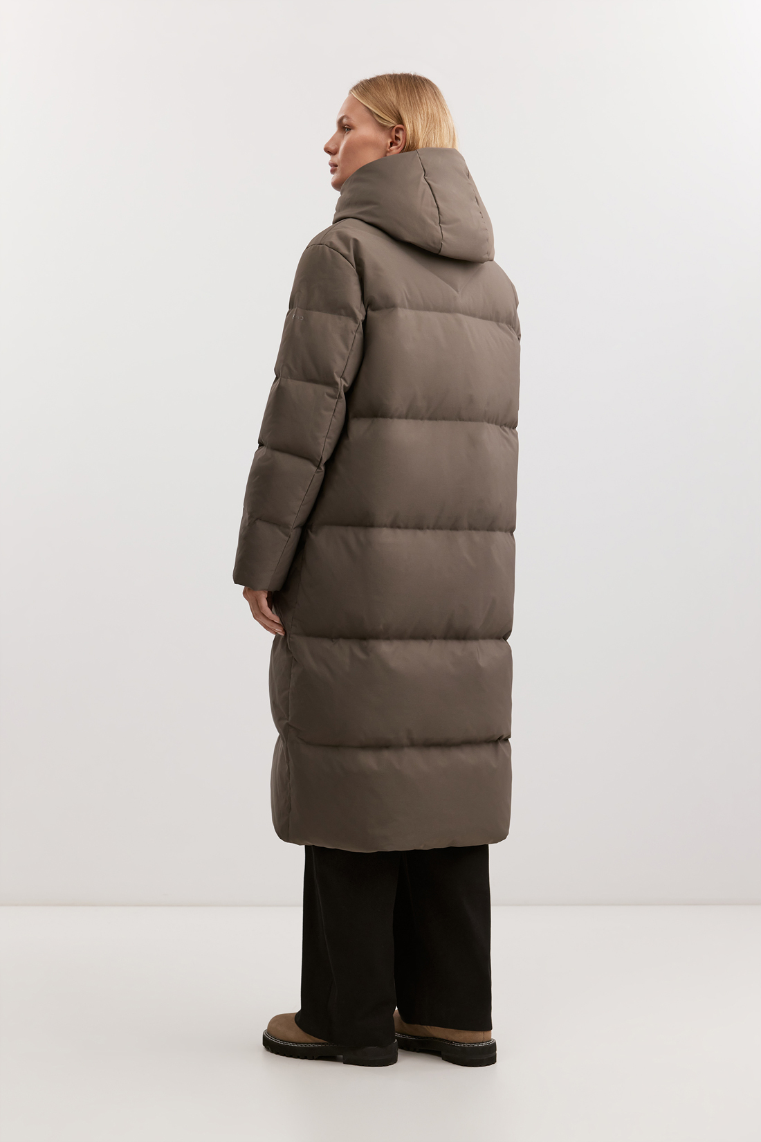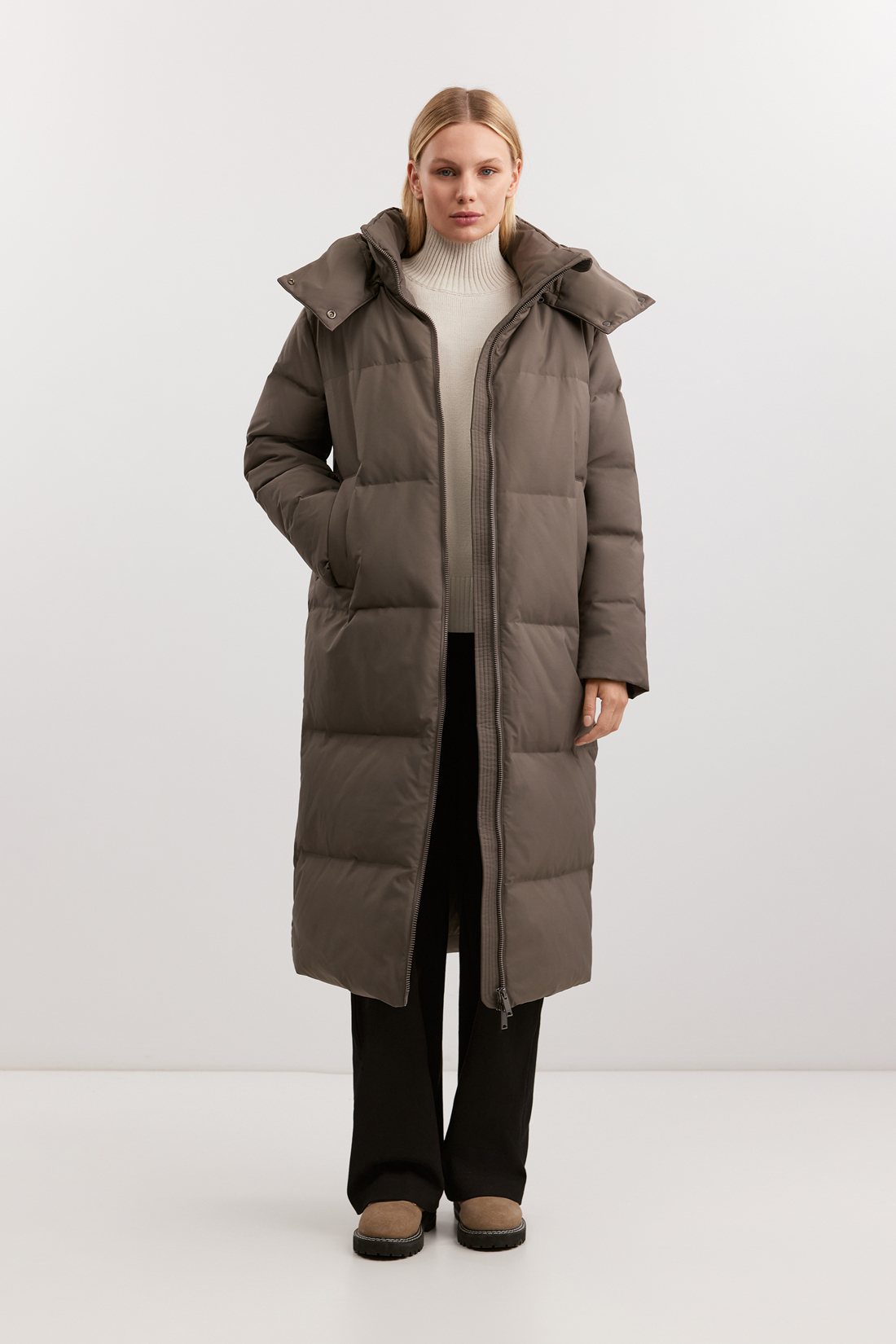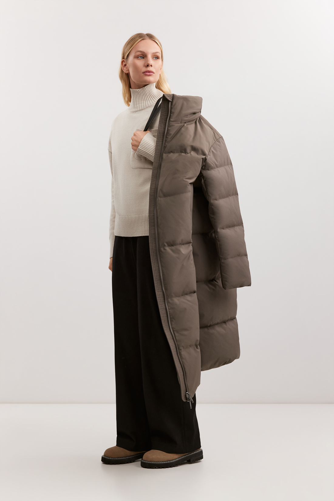 - Удлиненный прямой силуэт с горизонтальной стежкой равномерно распределяет тепло
