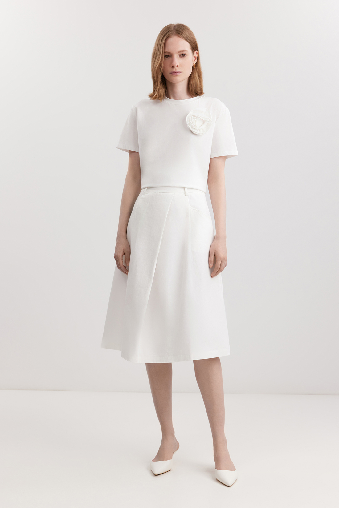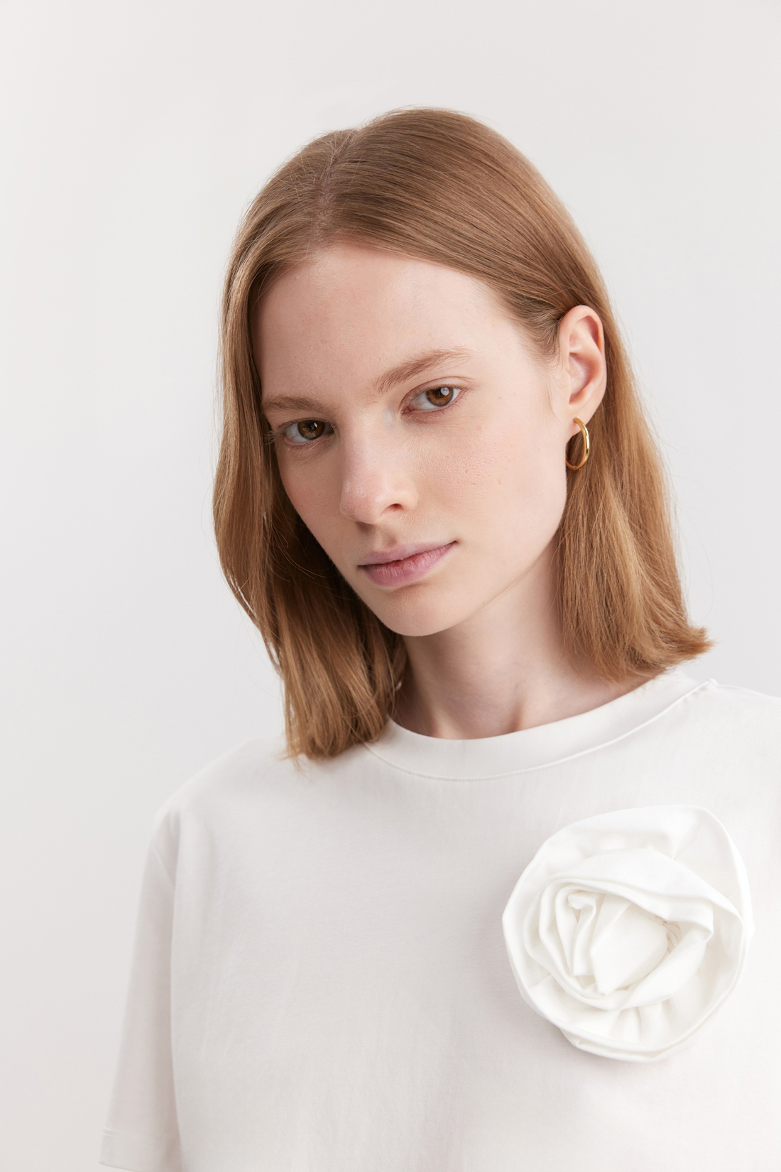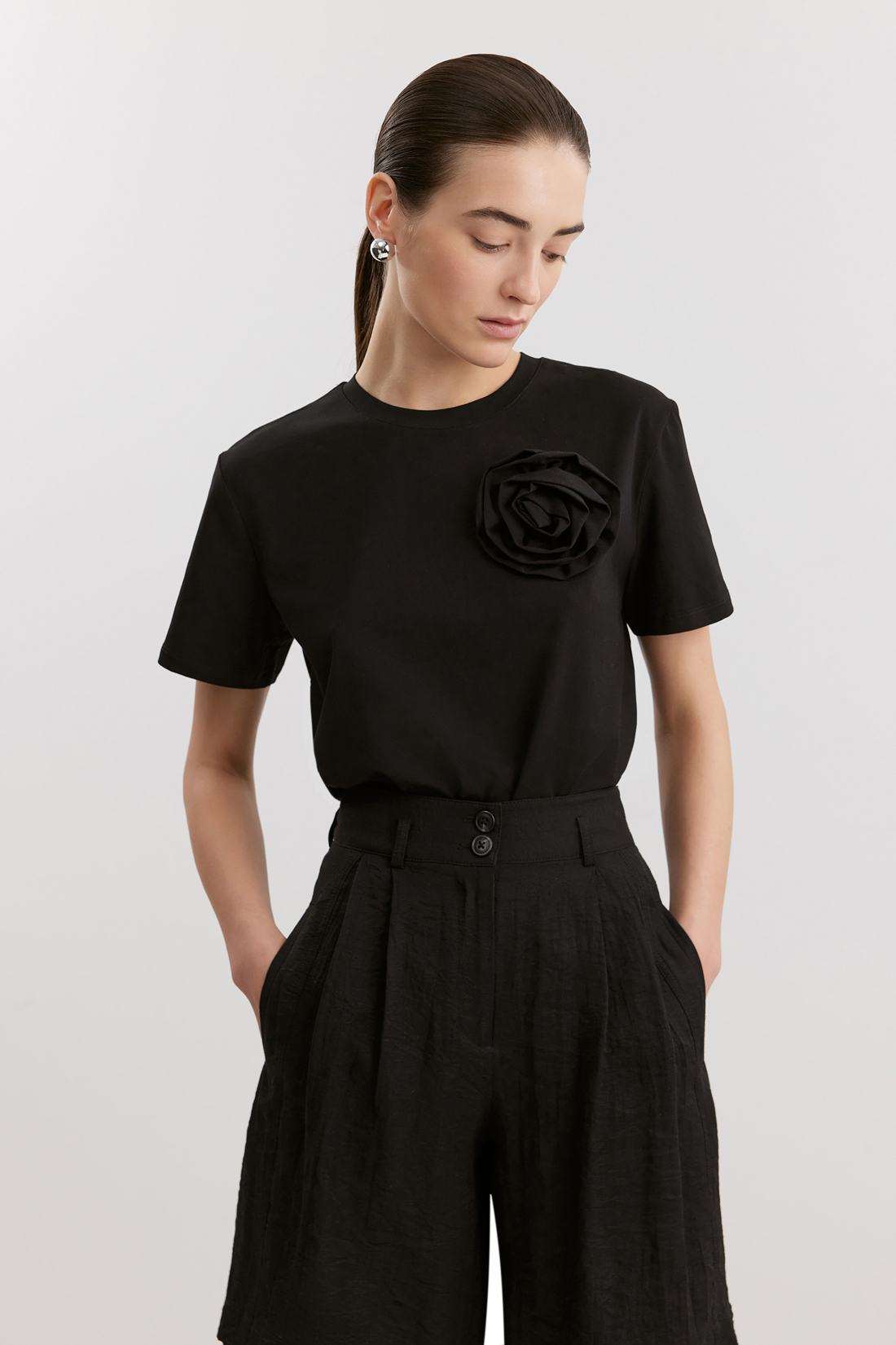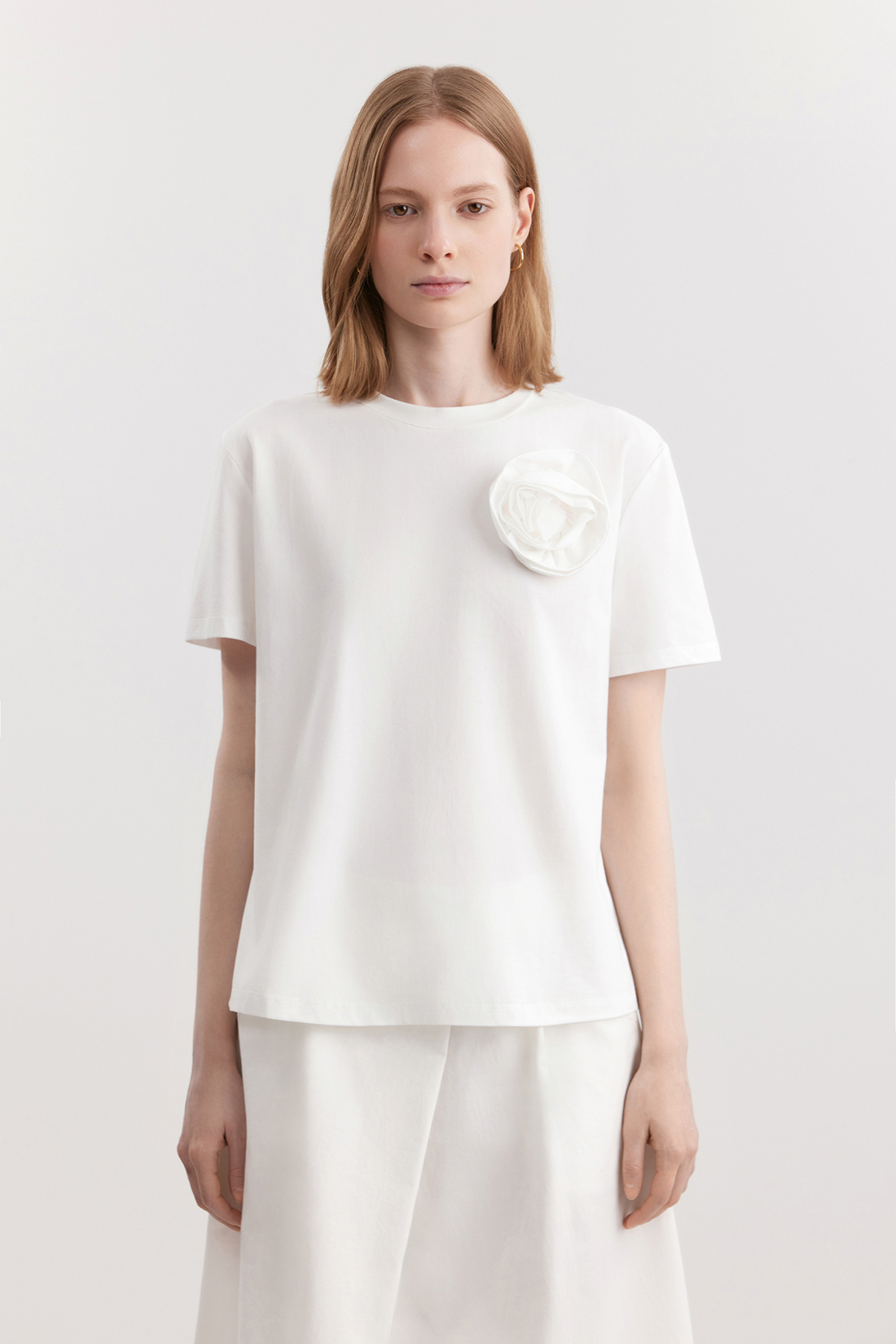 Женская трикотажная блузка-футболка из смесового материала, что делает её лёгкой, эластичной и дышащей. Эти качества идеально подходят для летних и весенних тёплых месяцев, обеспечивая комфорт даже в жару. Модель имеет прямой крой и длину до бедра, круглый вырез и короткие рукава. Особенность футболки — декоративная аппликация в виде цветка на передней части. Несъёмный цветок выполнен из ткани, изделие можно стирать вместе с декором.