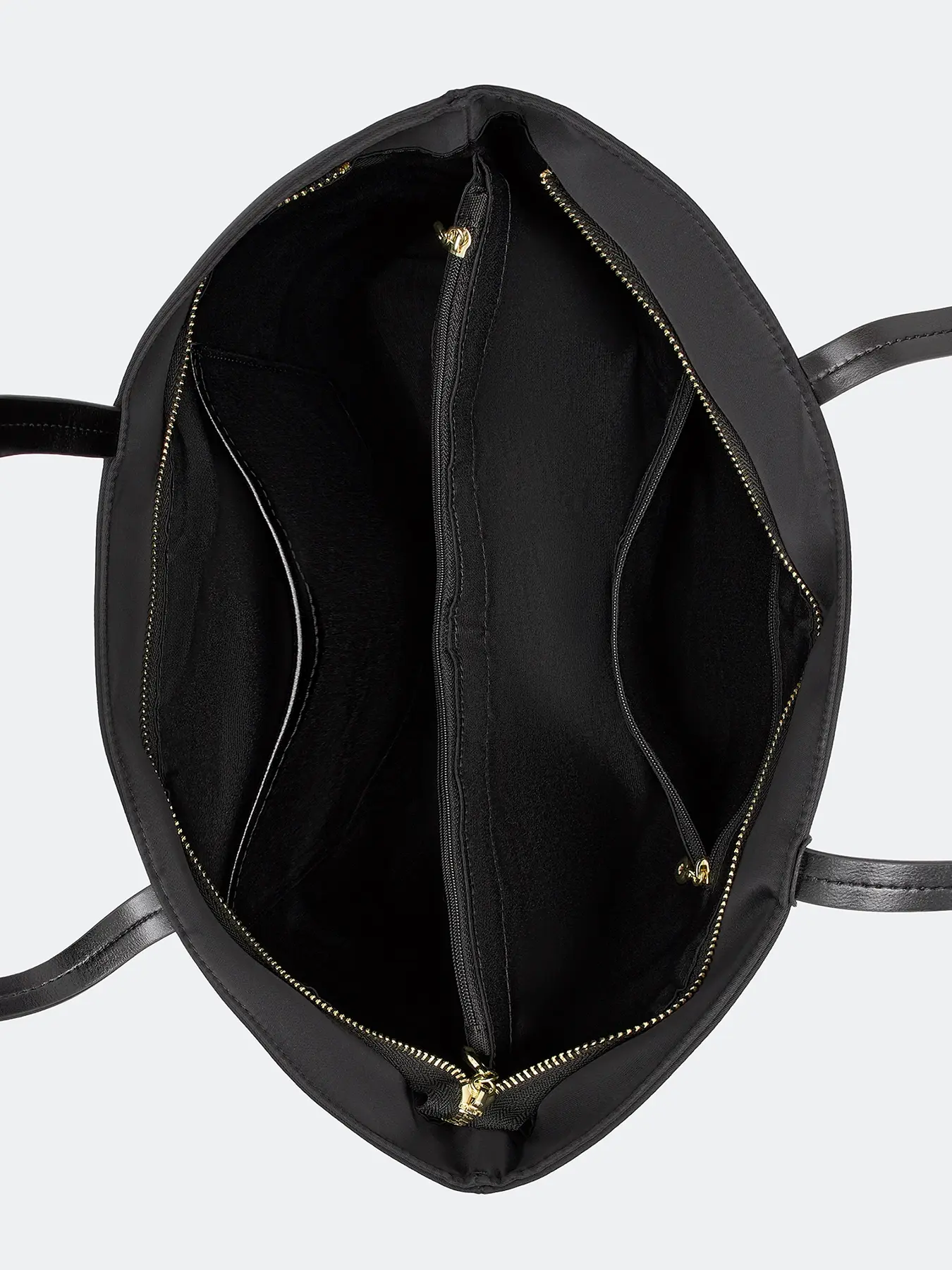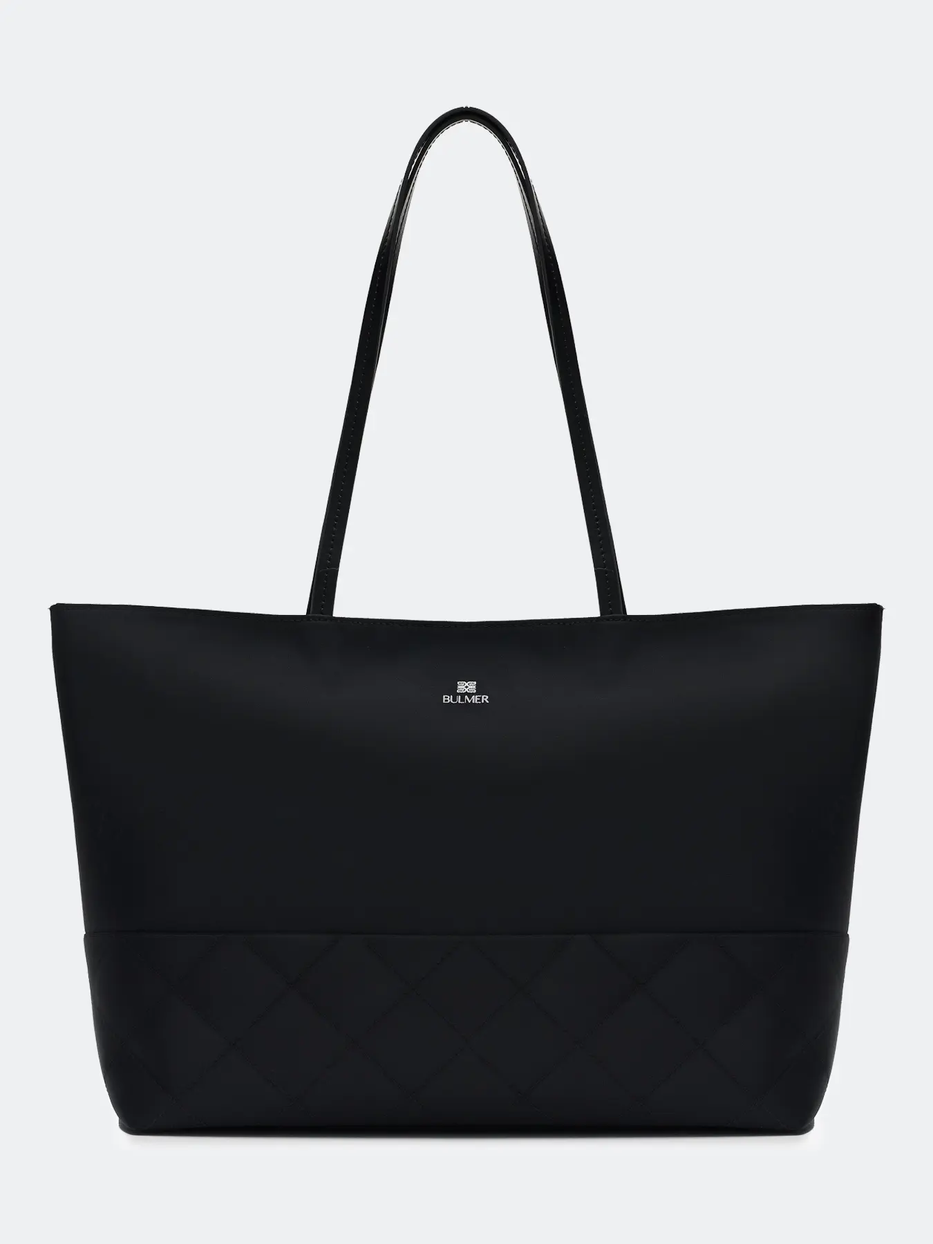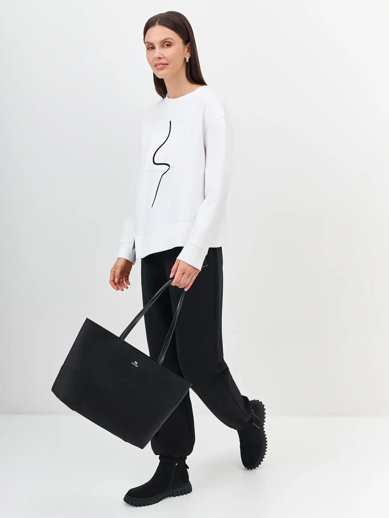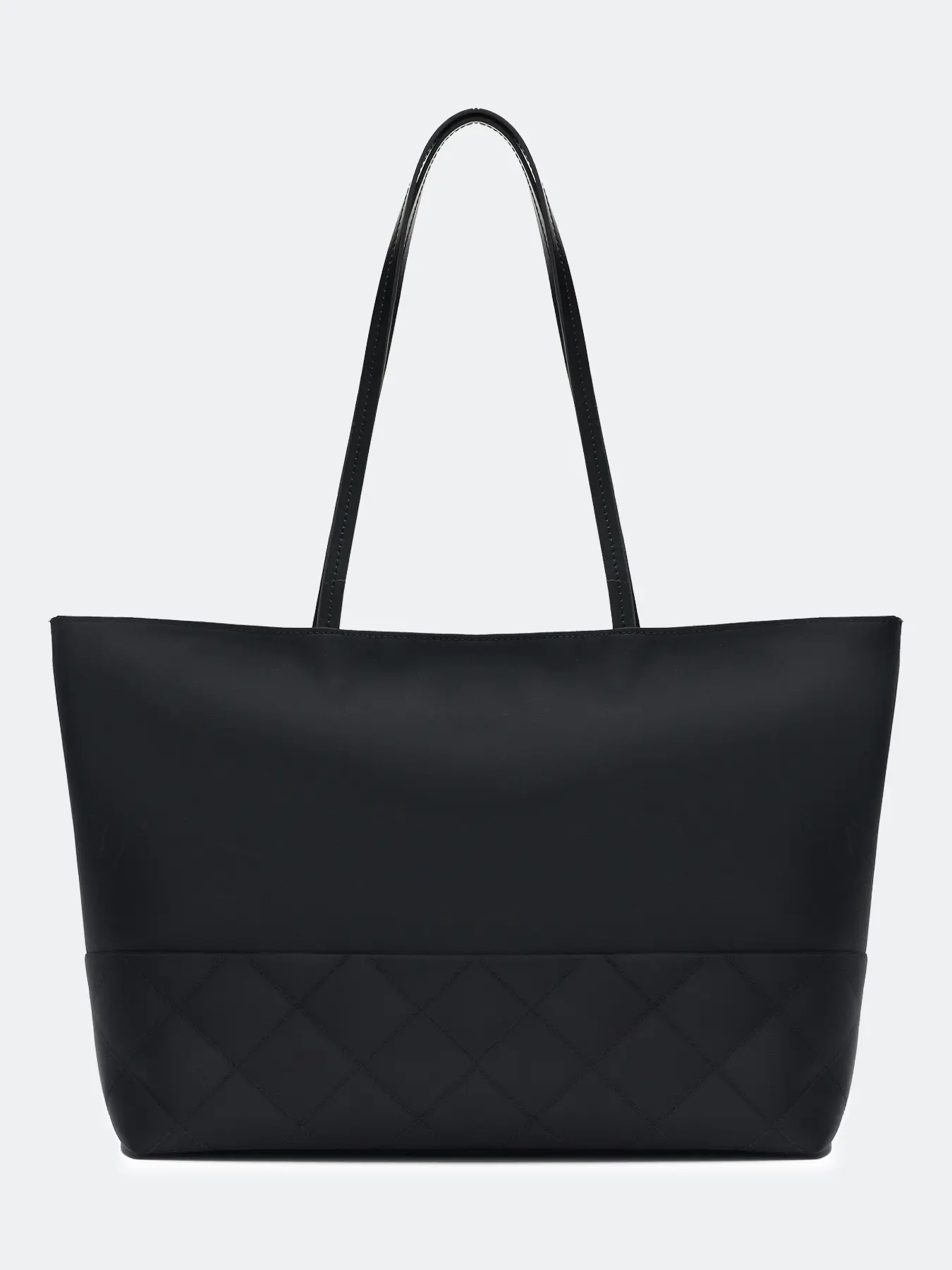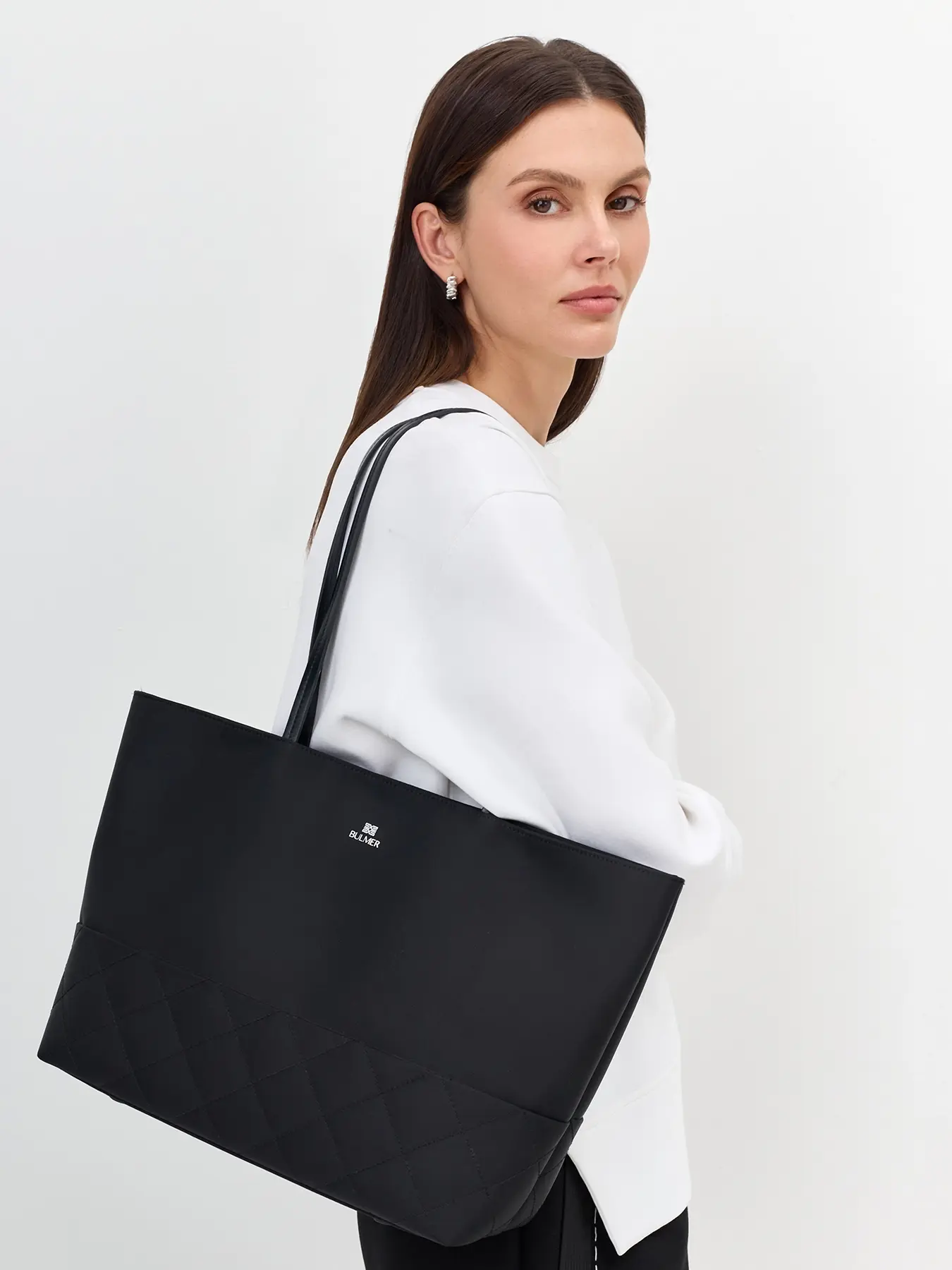 Сумка-шоппер из плотного текстиля с диагональной стежкой по низу. Два отделения, внутренние карманы на молниях. Застежка на молнию. Две короткие ручки.