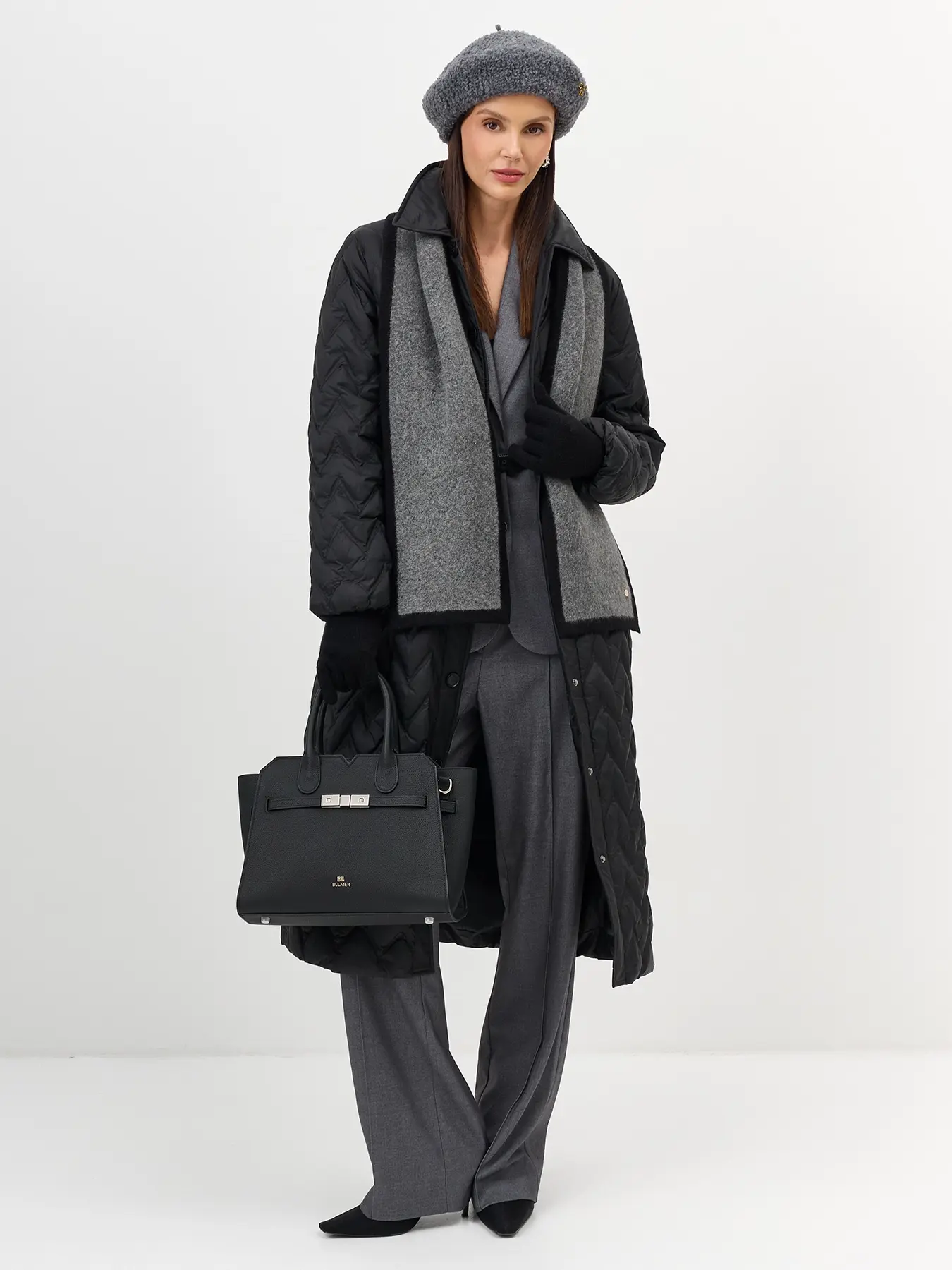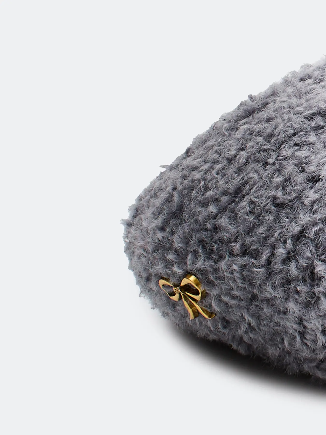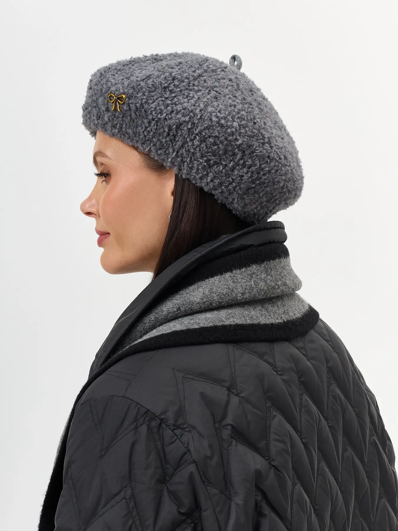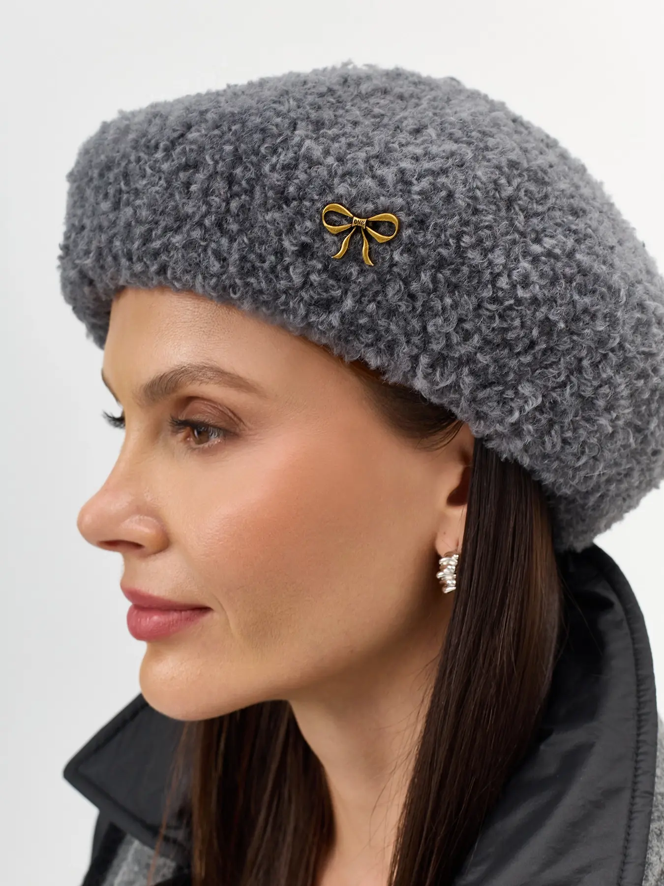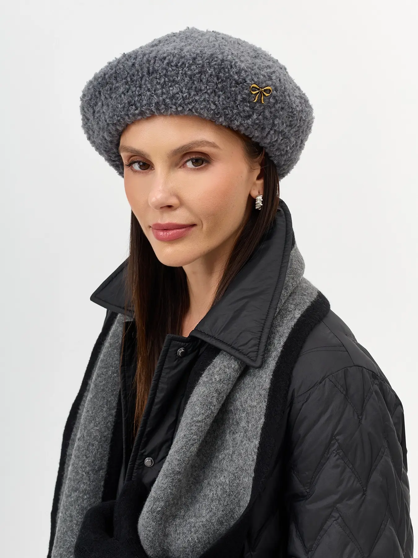 Берет с минималистичным металлическим декором из буклированного фактурного трикотажа. Дополнен рибом по внутренней стороне.