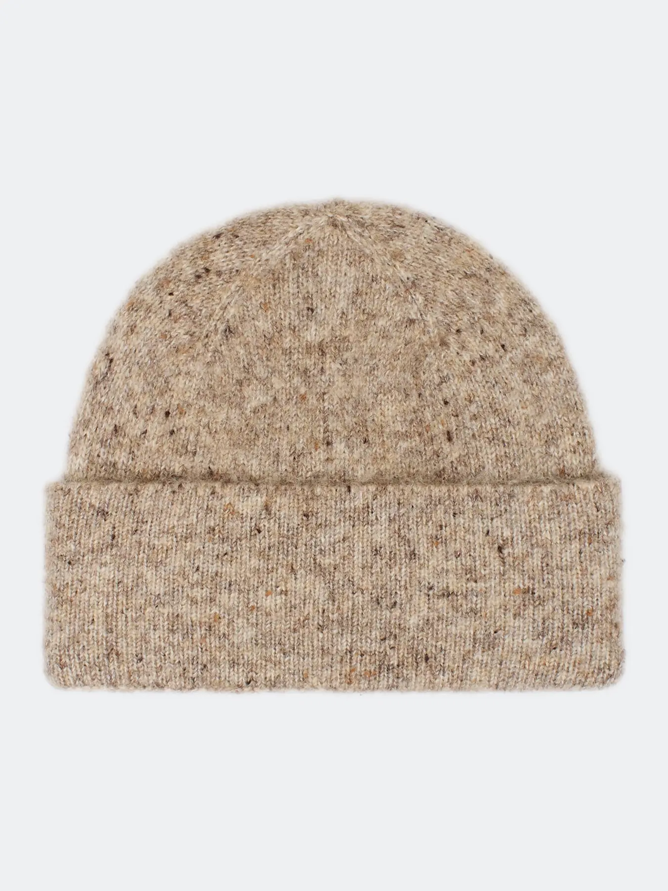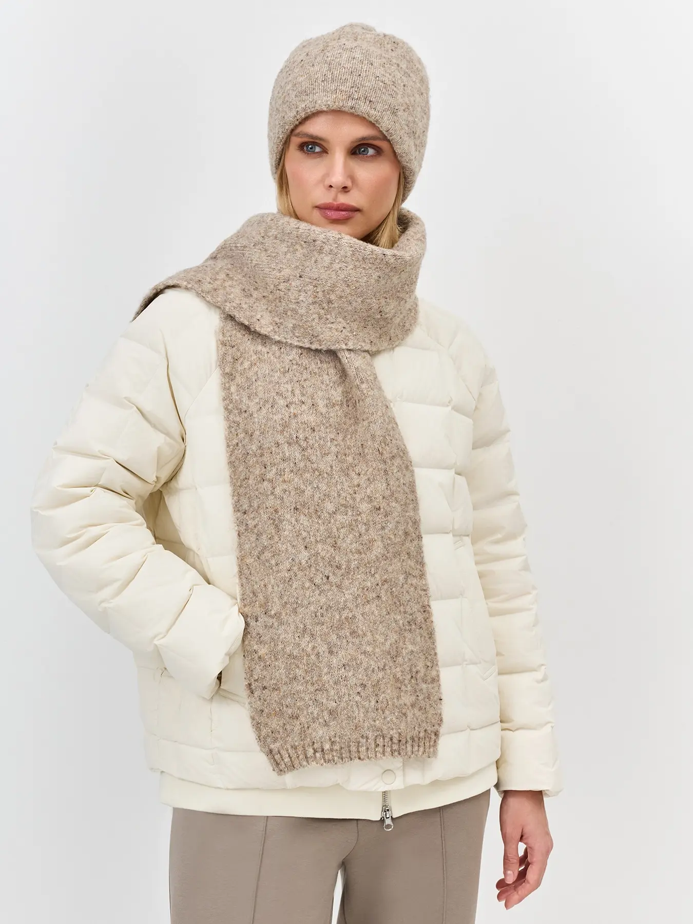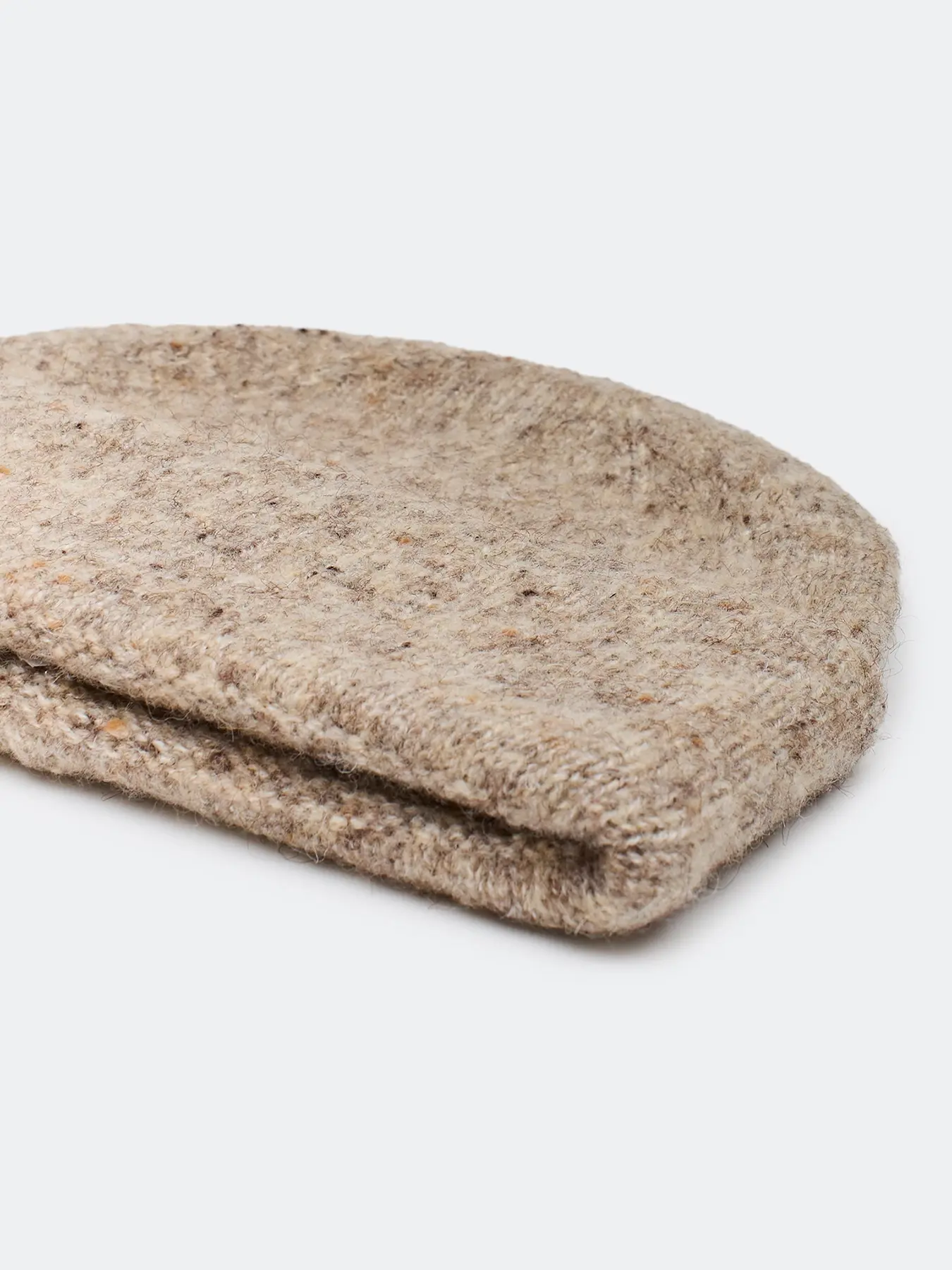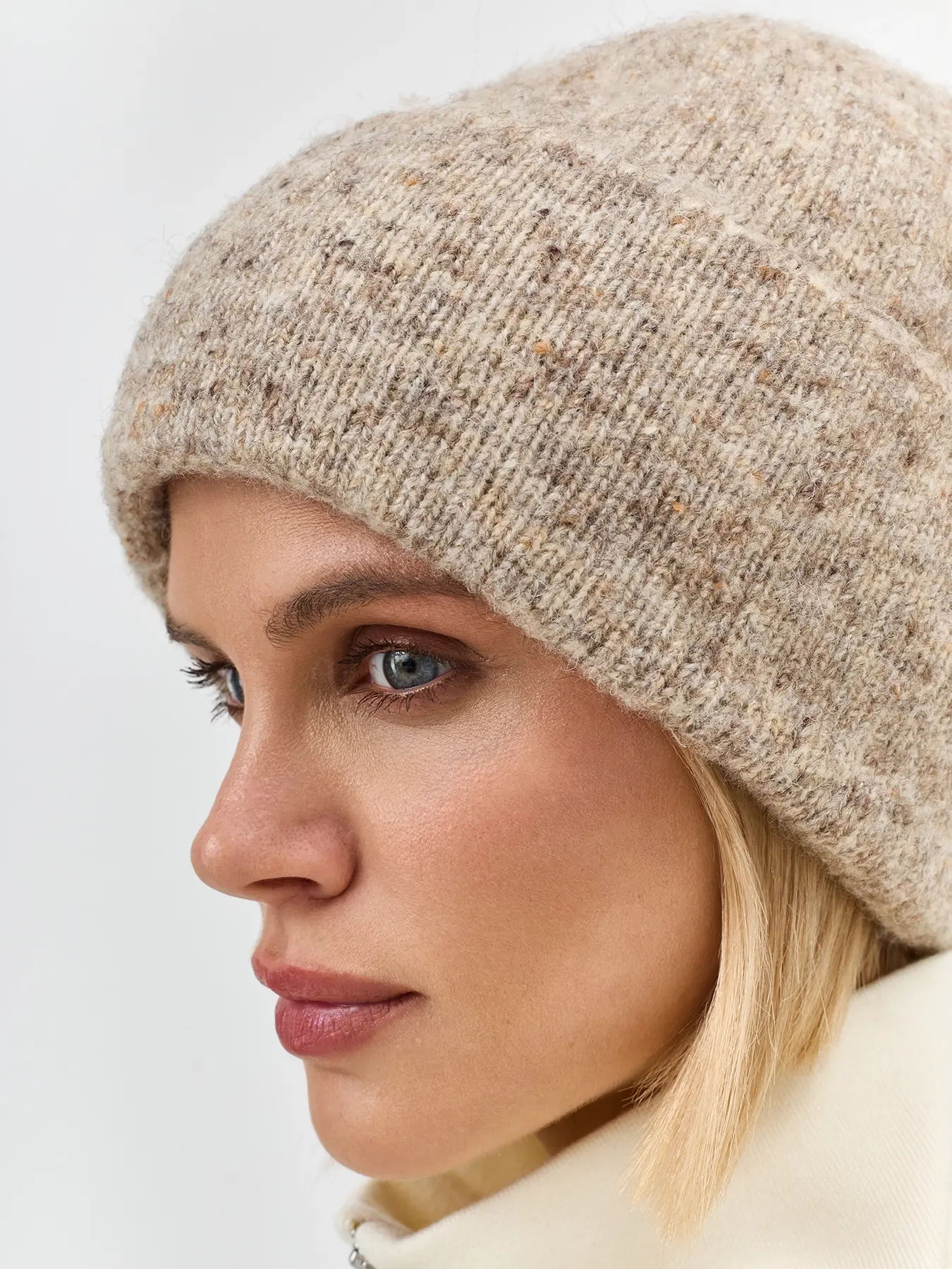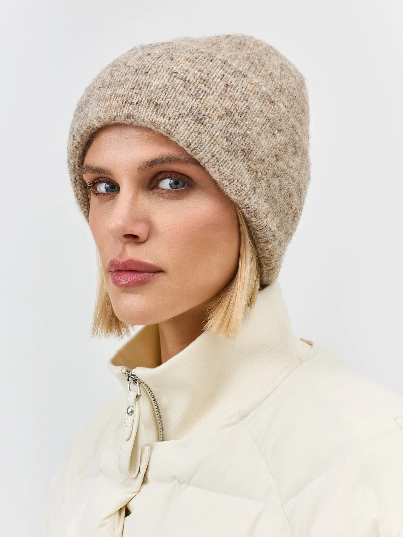 Укороченная шапка с шерстью в составе. Отделка в мелкий рубчик. Дополнена акцентным широким отворотом.