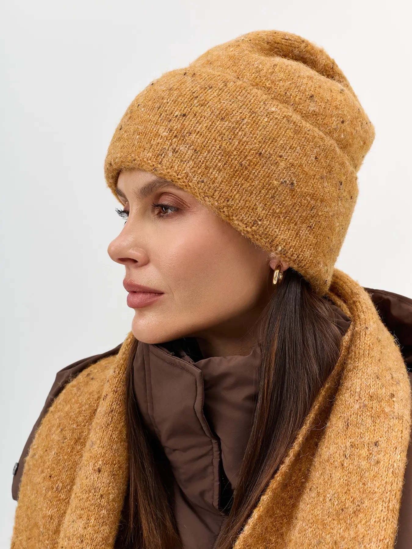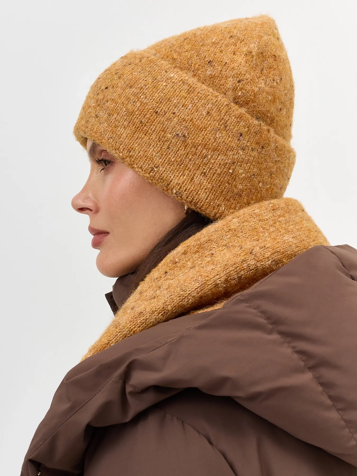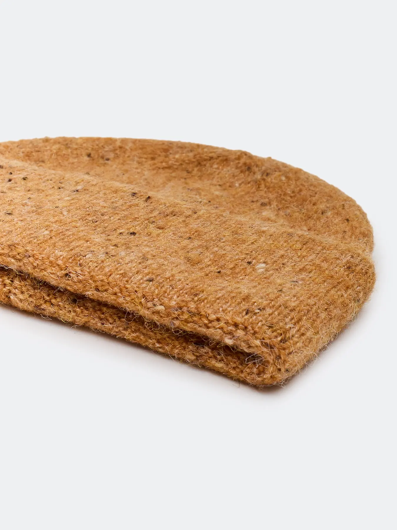 Укороченная шапка с шерстью в составе. Отделка в мелкий рубчик. Дополнена акцентным широким отворотом.