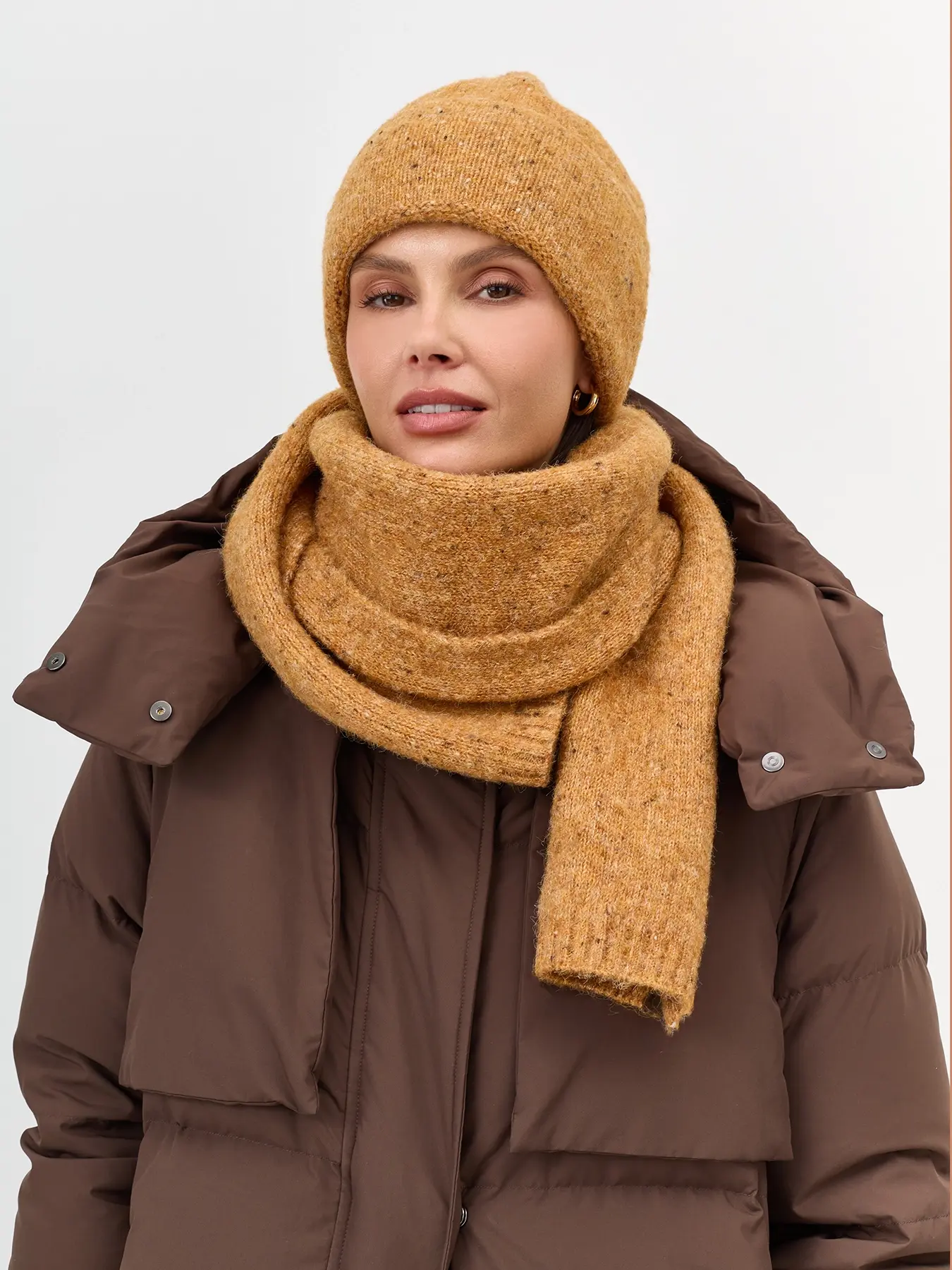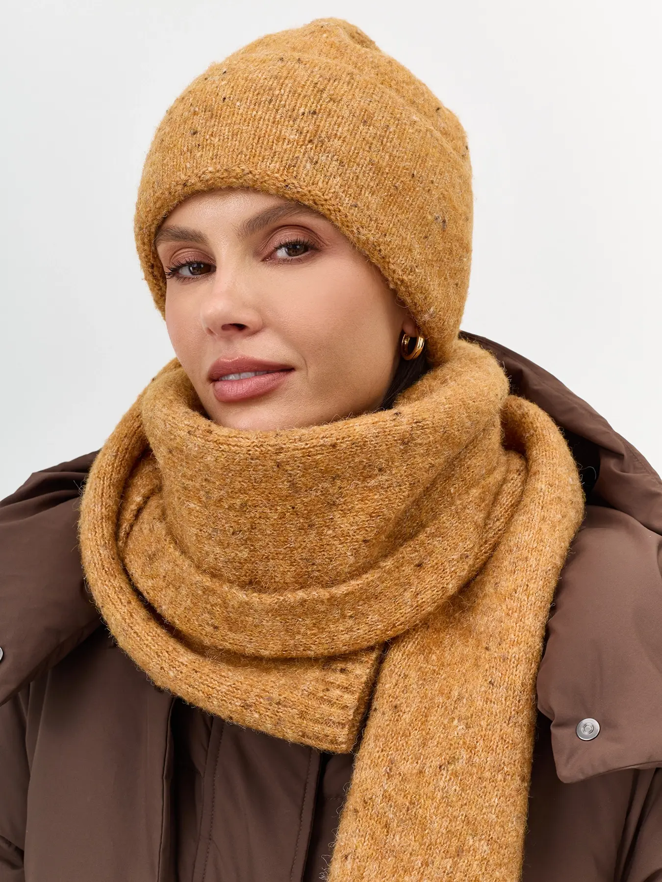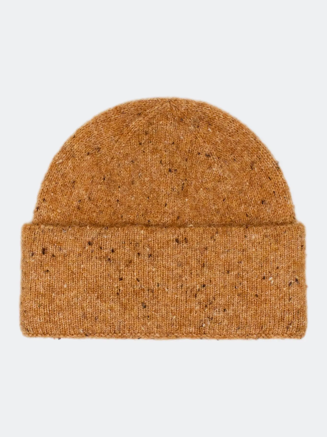 Укороченная шапка с шерстью в составе. Отделка в мелкий рубчик. Дополнена акцентным широким отворотом.