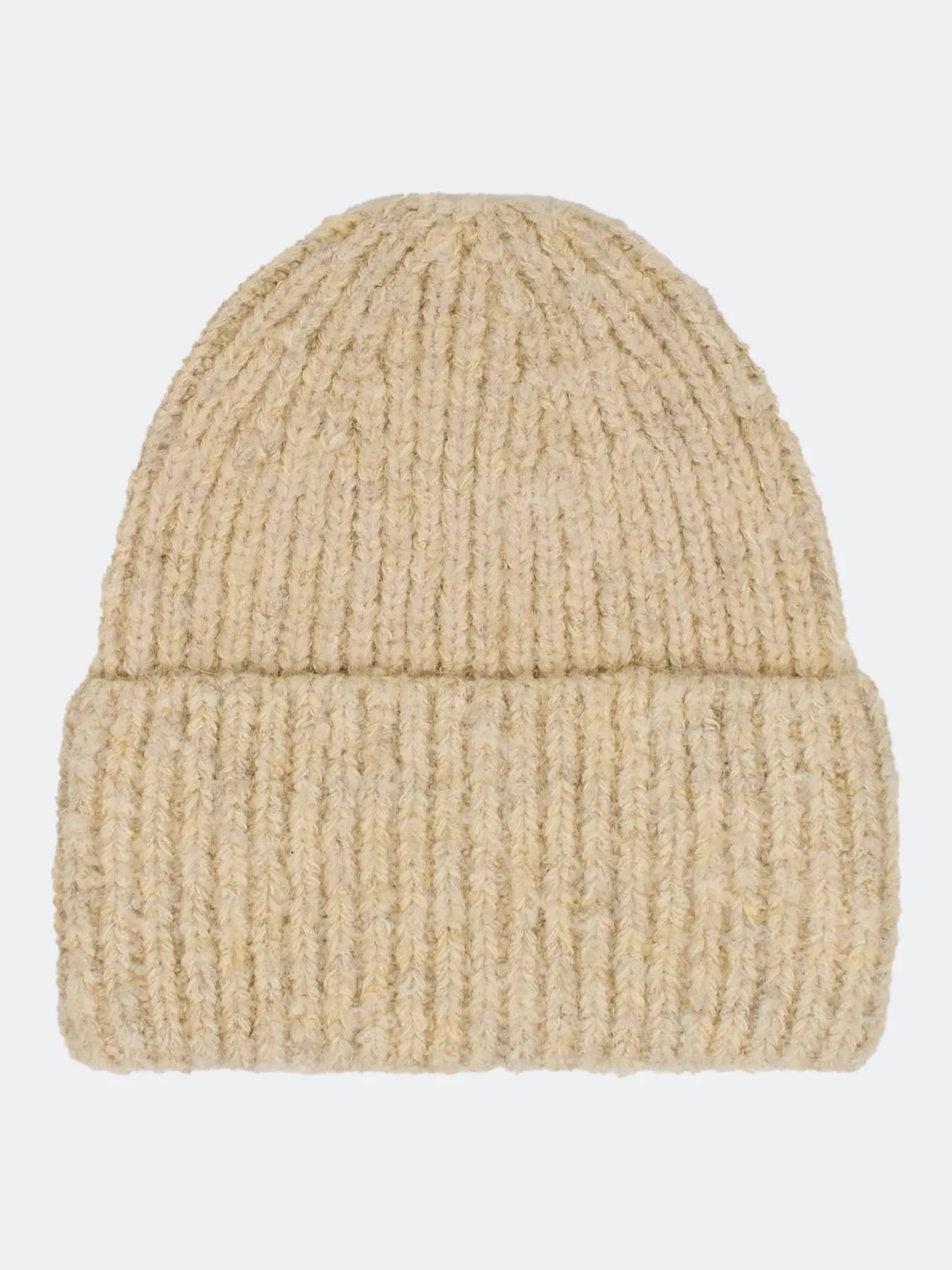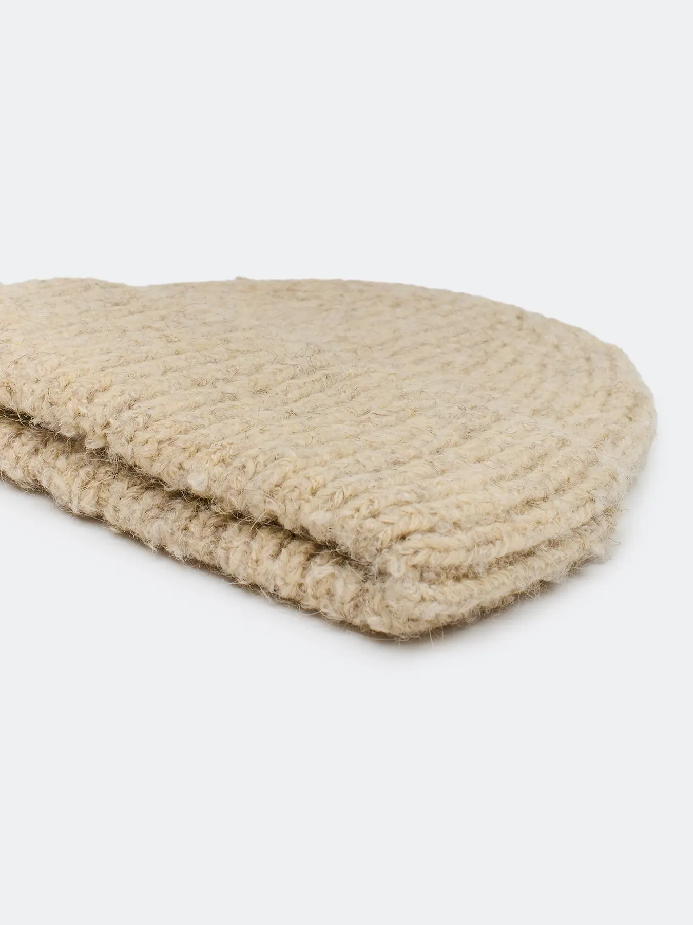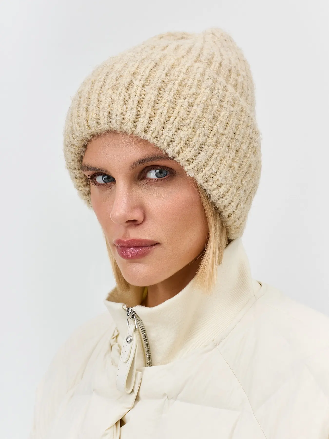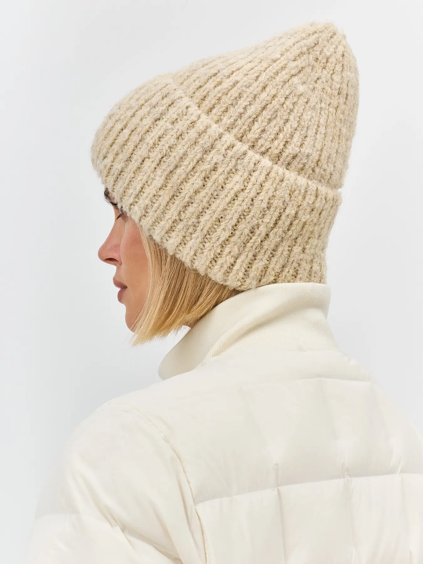 Шапка бини в рубчик из объёмной пряжи с эффектом букле с ангорой в составе. Дополнена широким отворотом и брендированным шильдом.