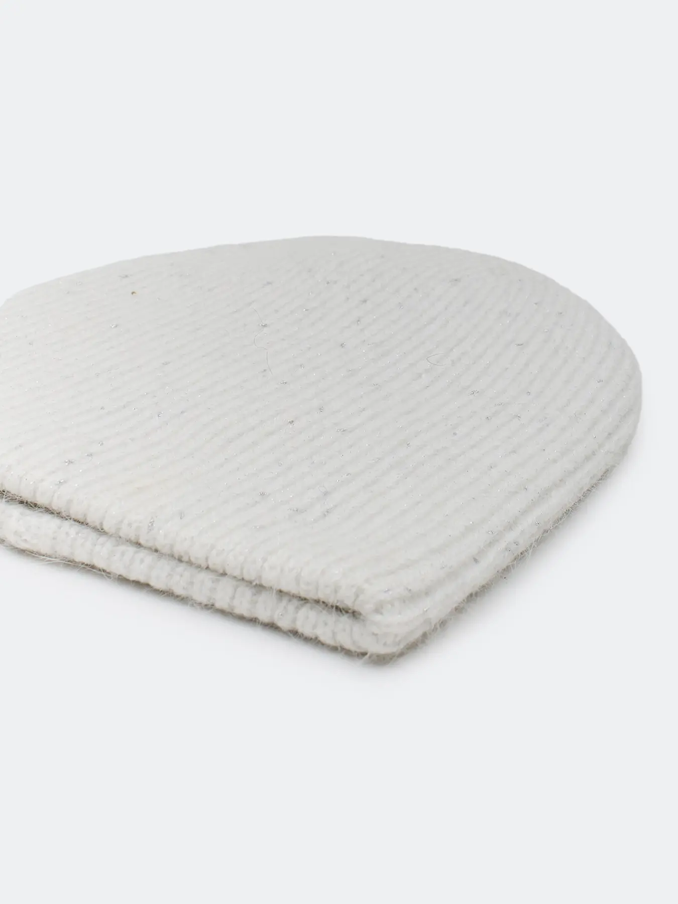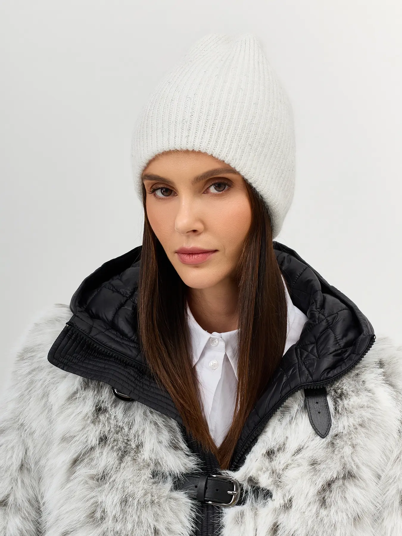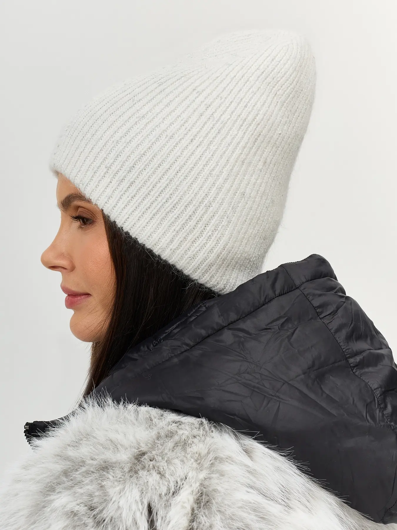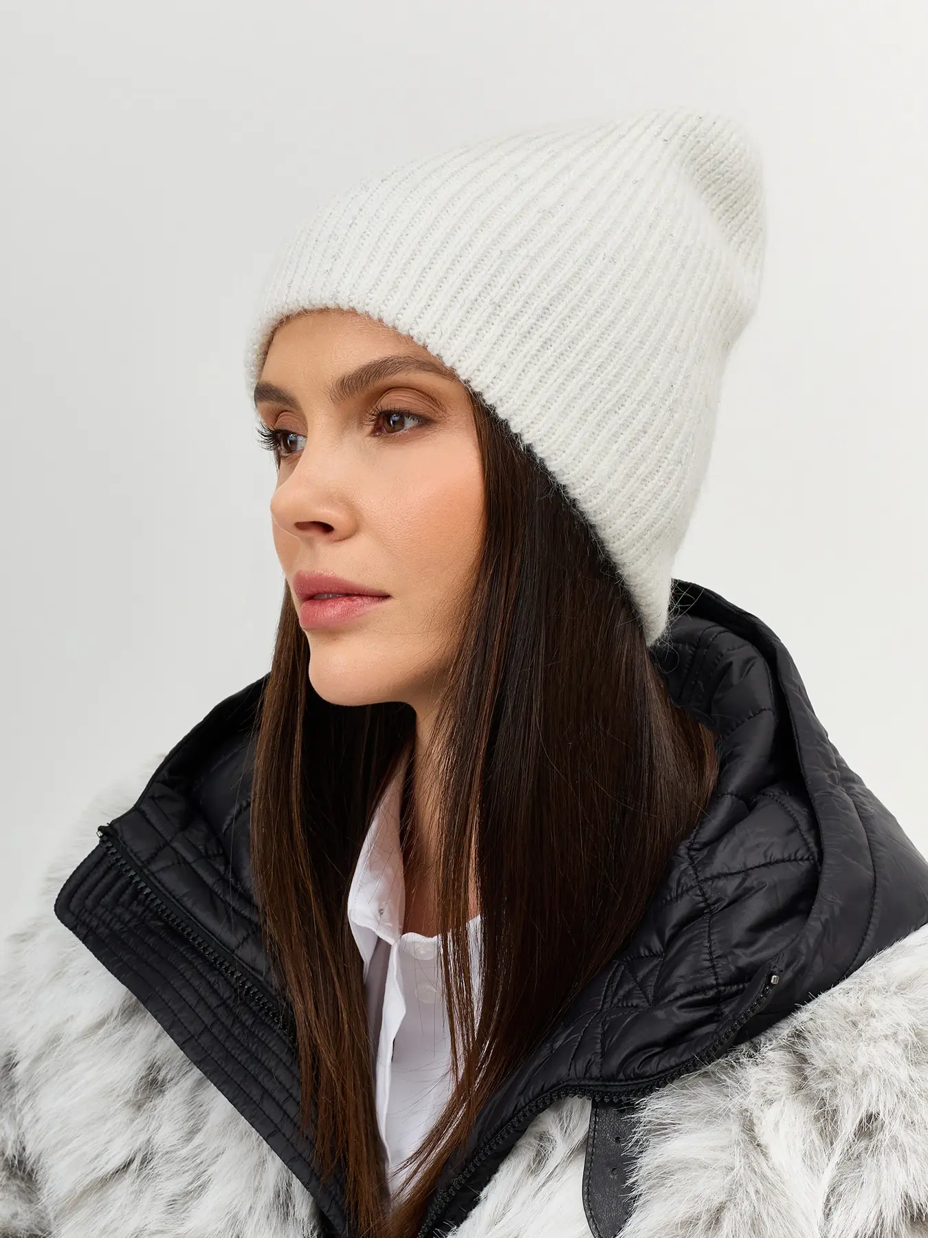 Шапка свободного объёма в мелкий рубчик. Двойная вязка. В составе люрекс и ангора.