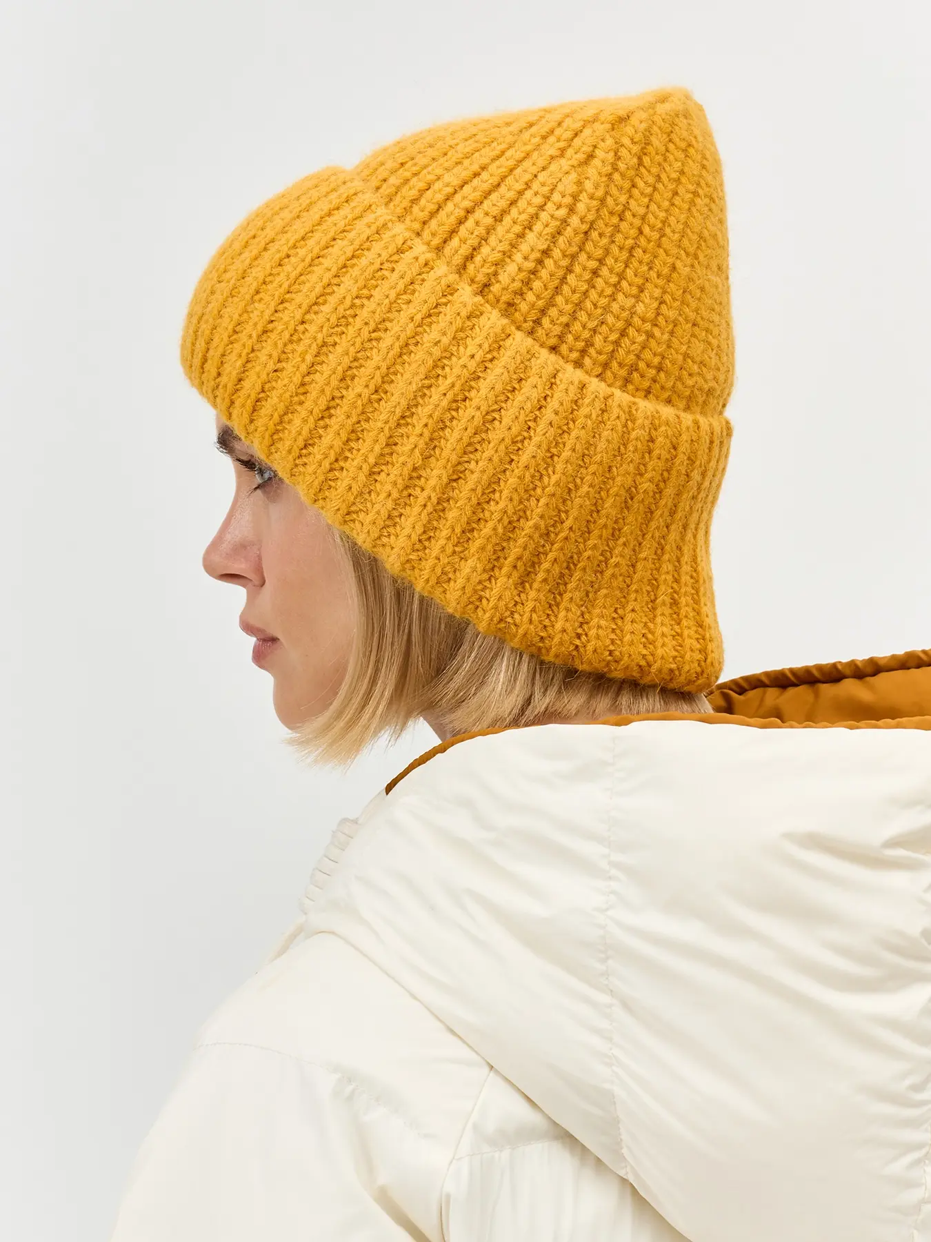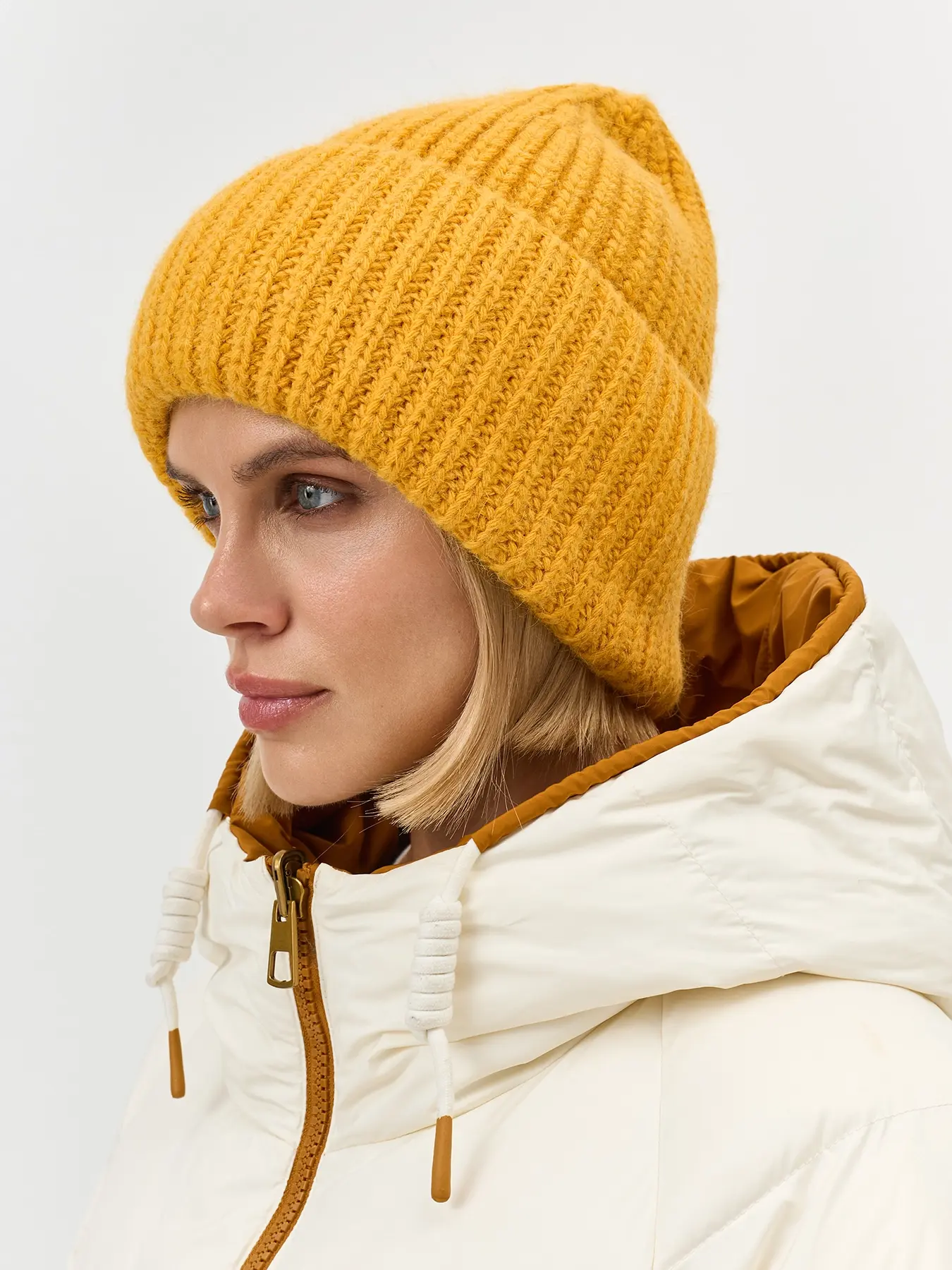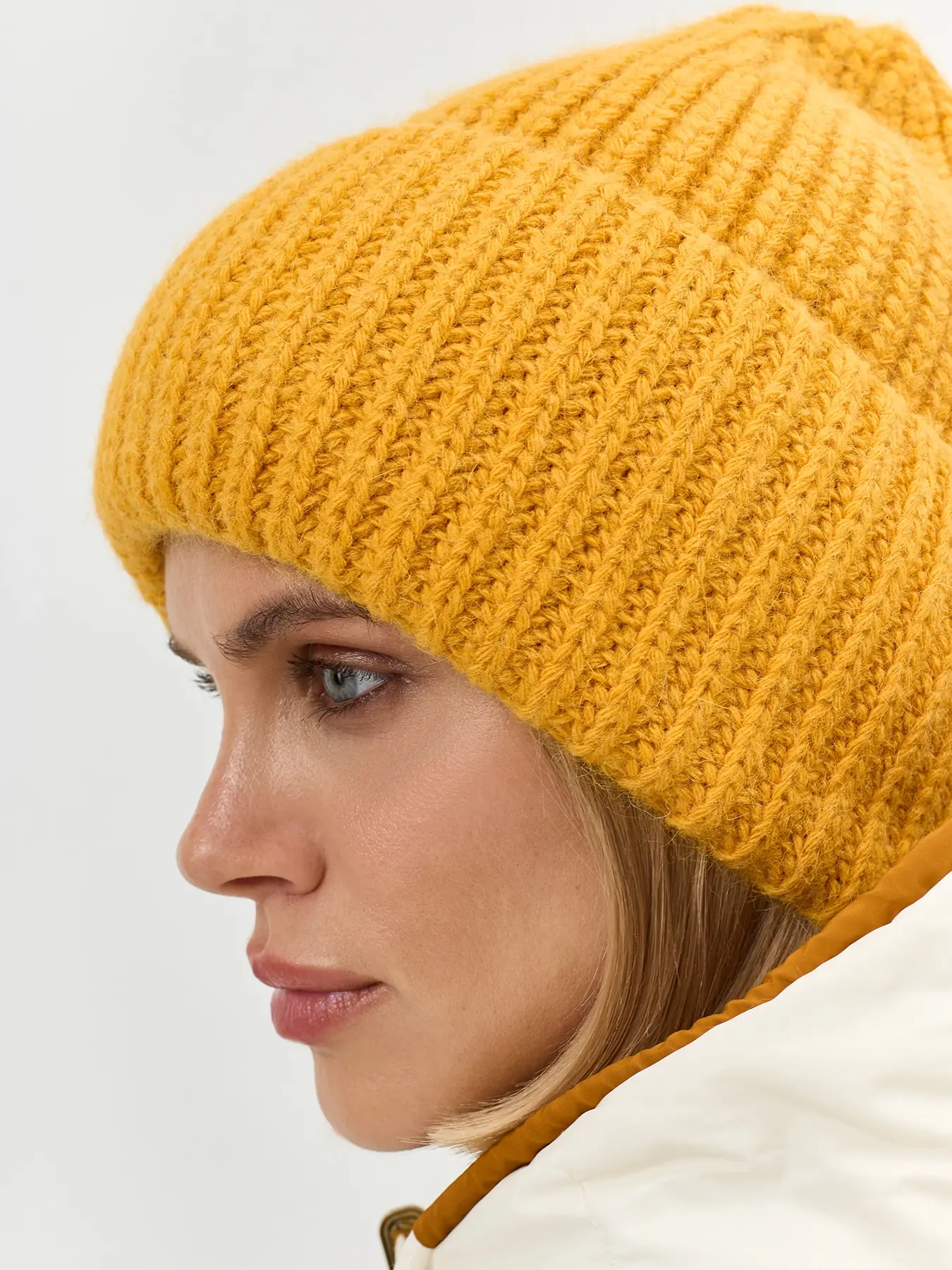 Базовая шапка бини в рубчик. Дополнена широким отворотом. В составе вискоза и ангора.