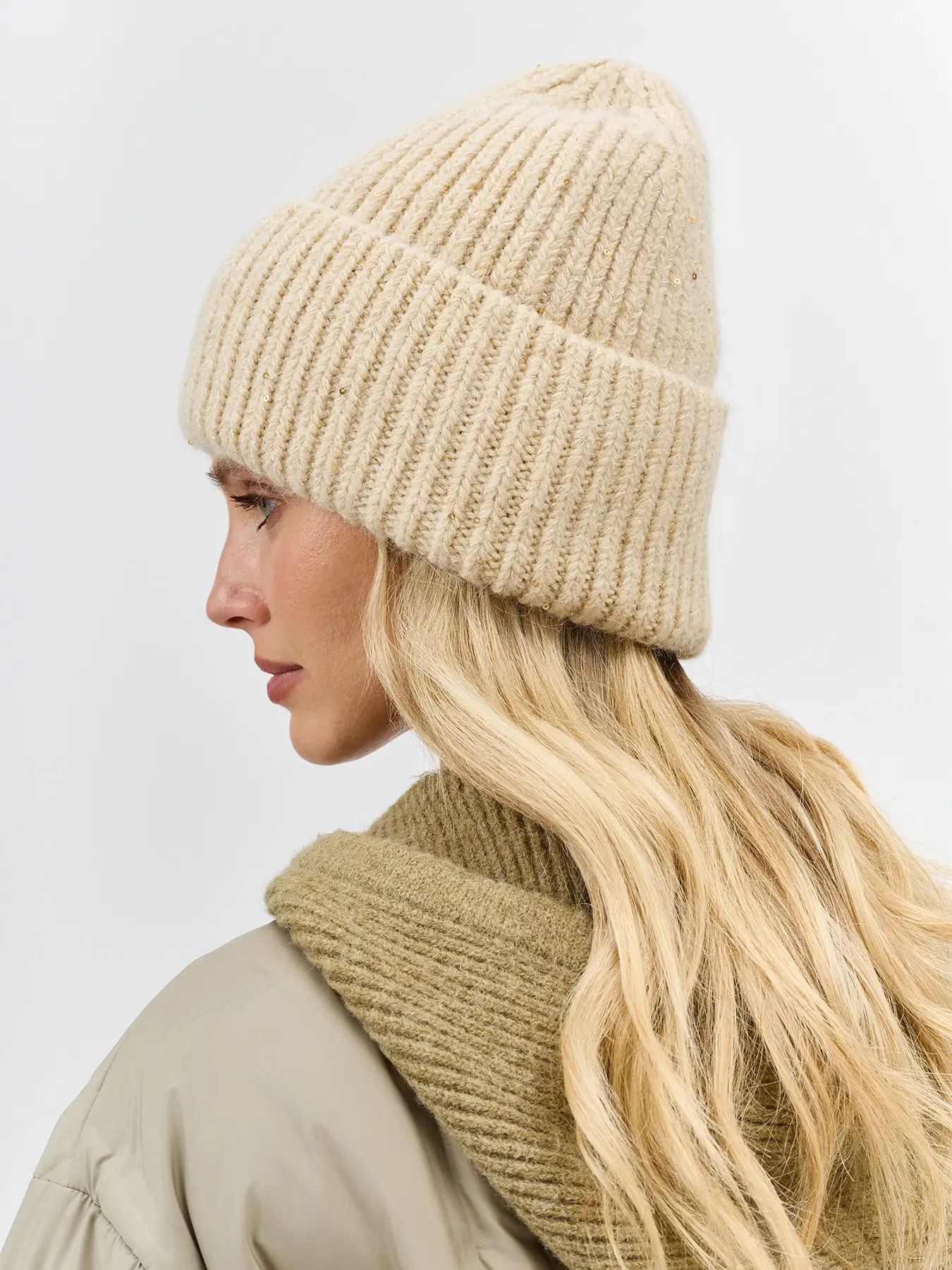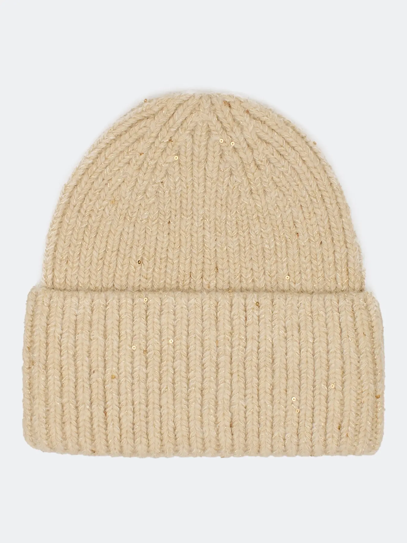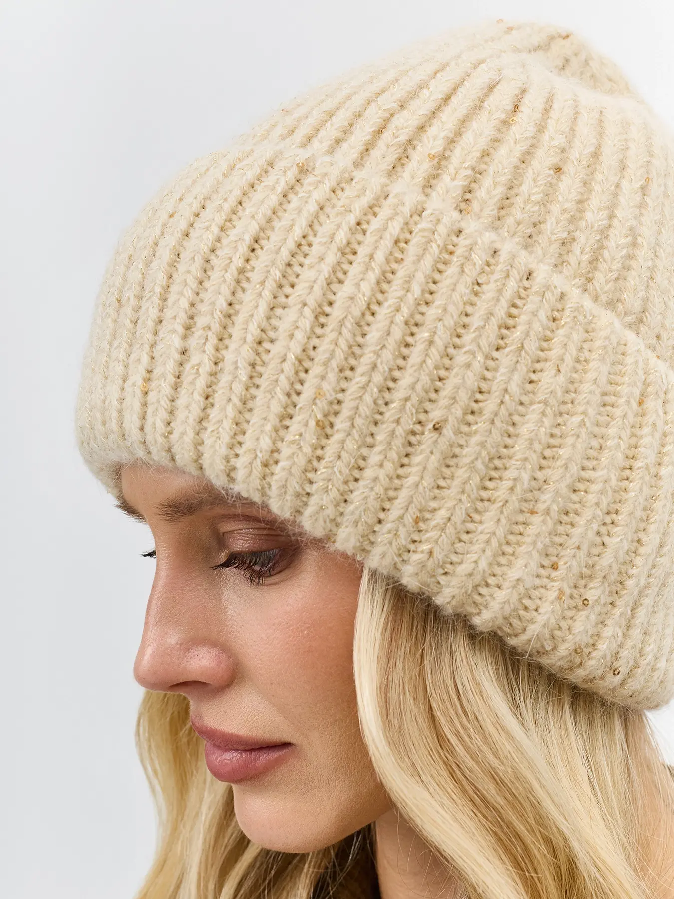 Шапка бини с широким отворотом из пряжи с люрексом и пайетками. Отделка в рубчик. В составе ангора.