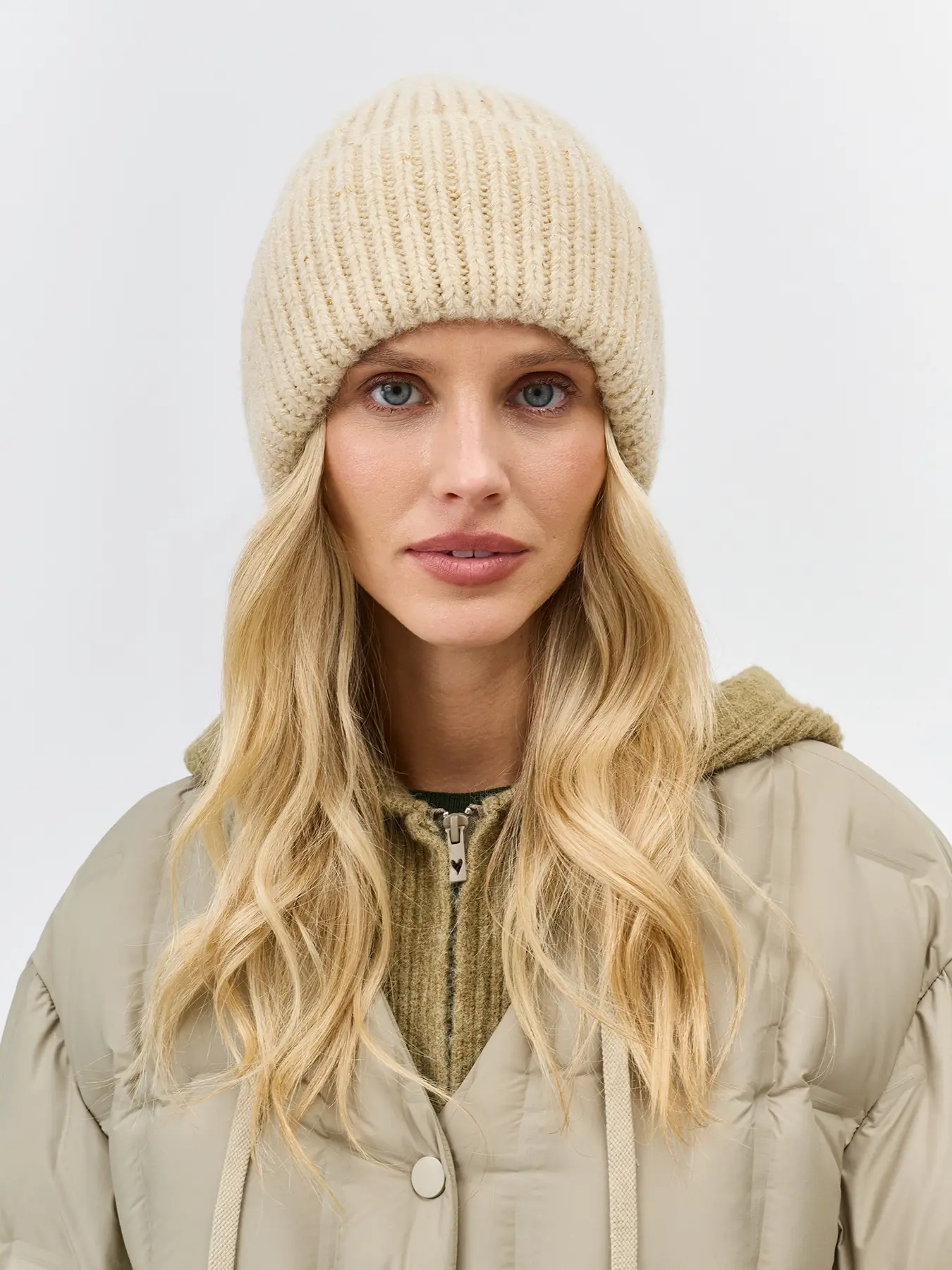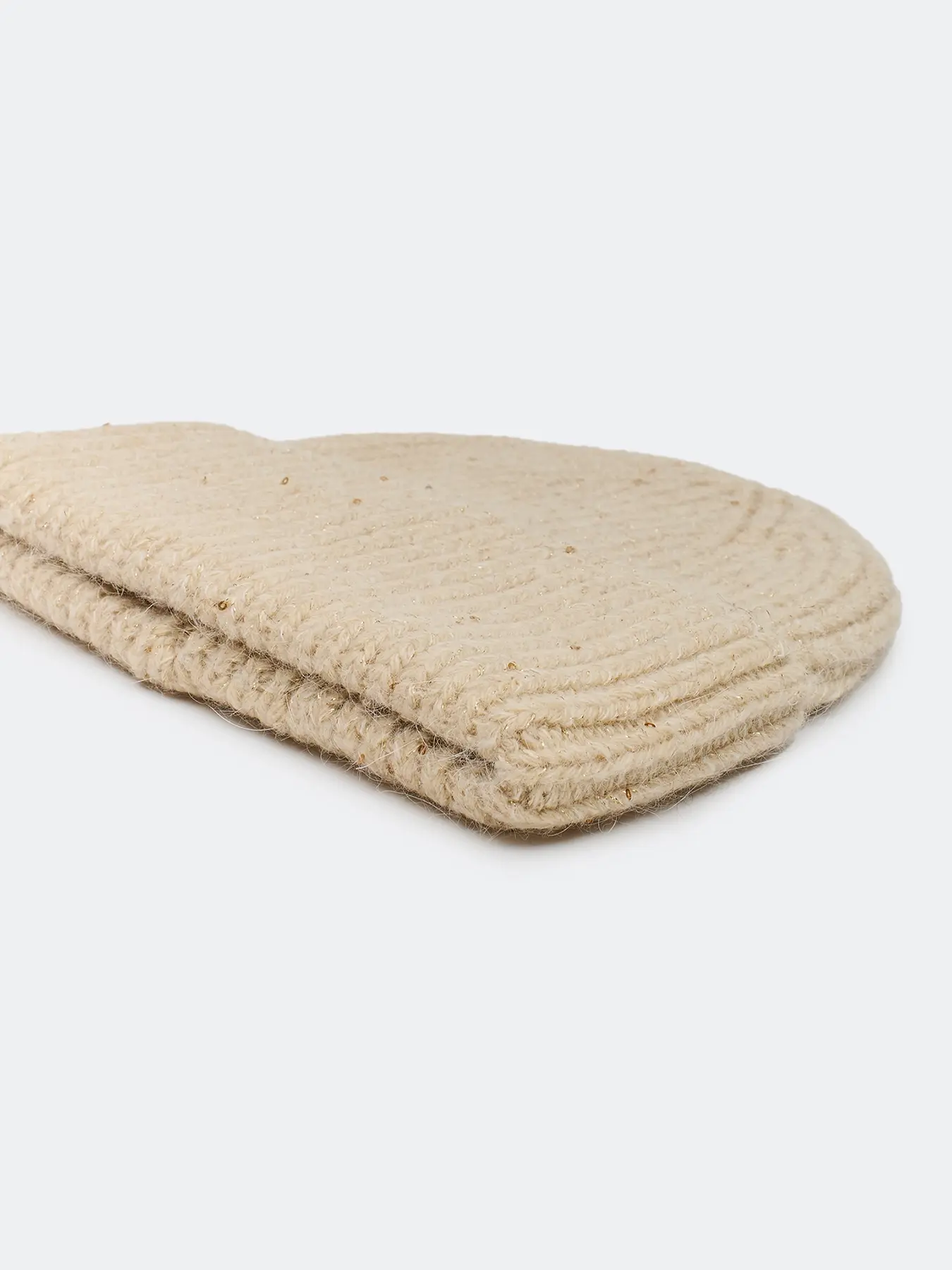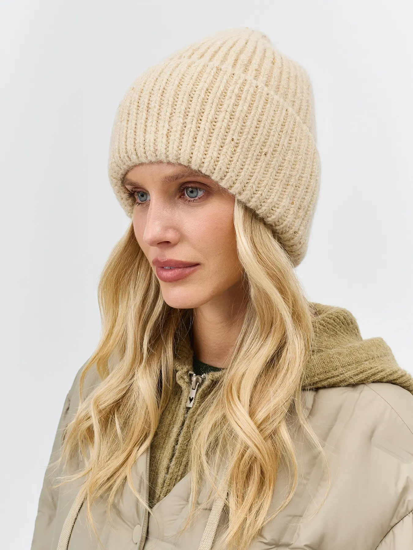 Шапка бини с широким отворотом из пряжи с люрексом и пайетками. Отделка в рубчик. В составе ангора.