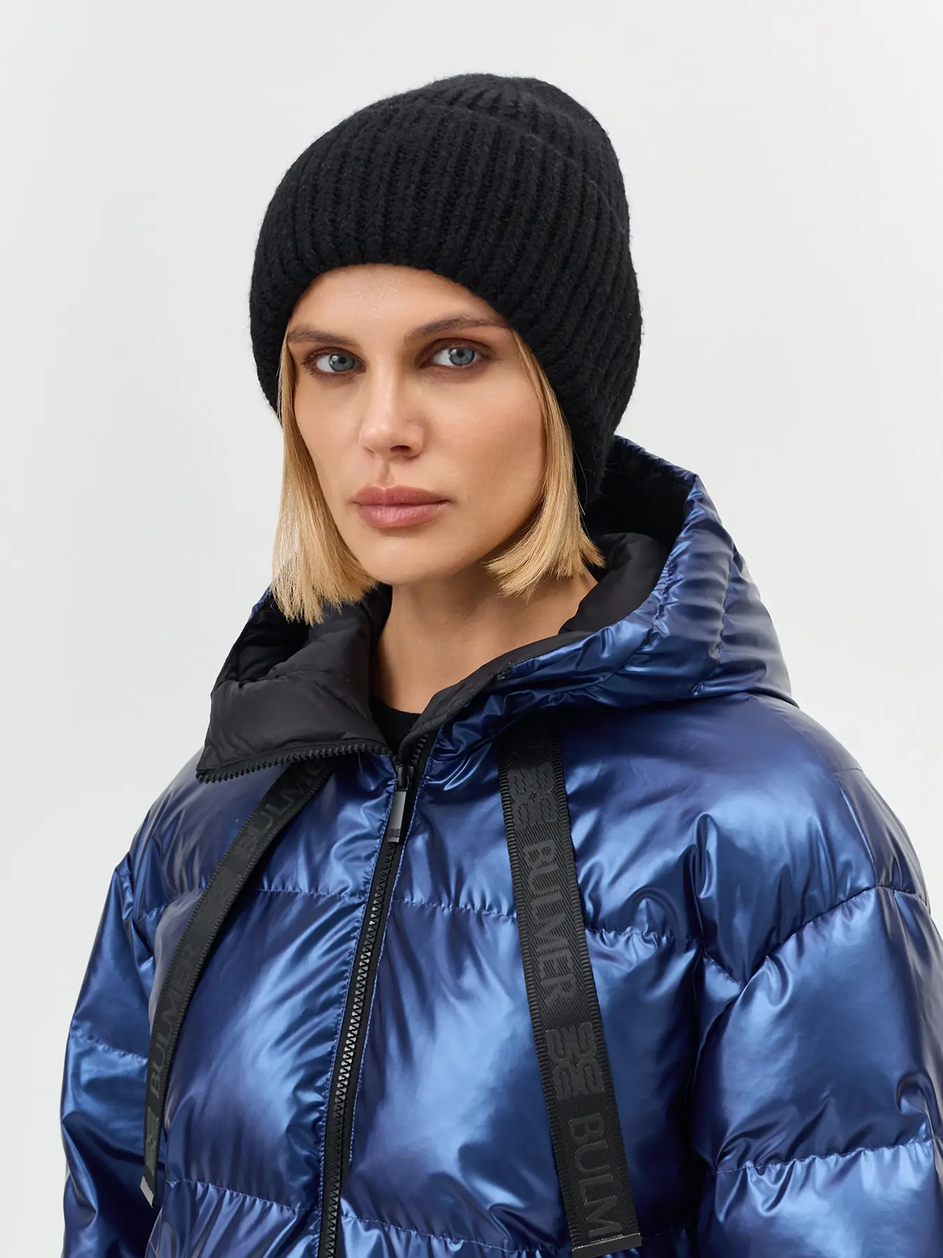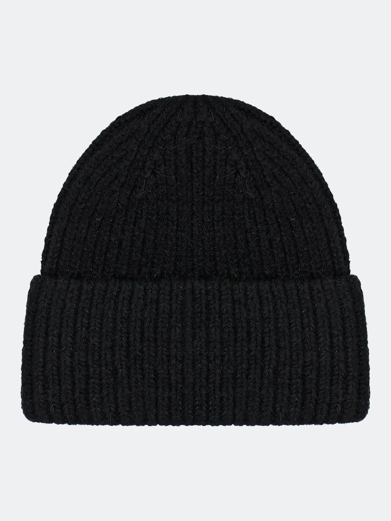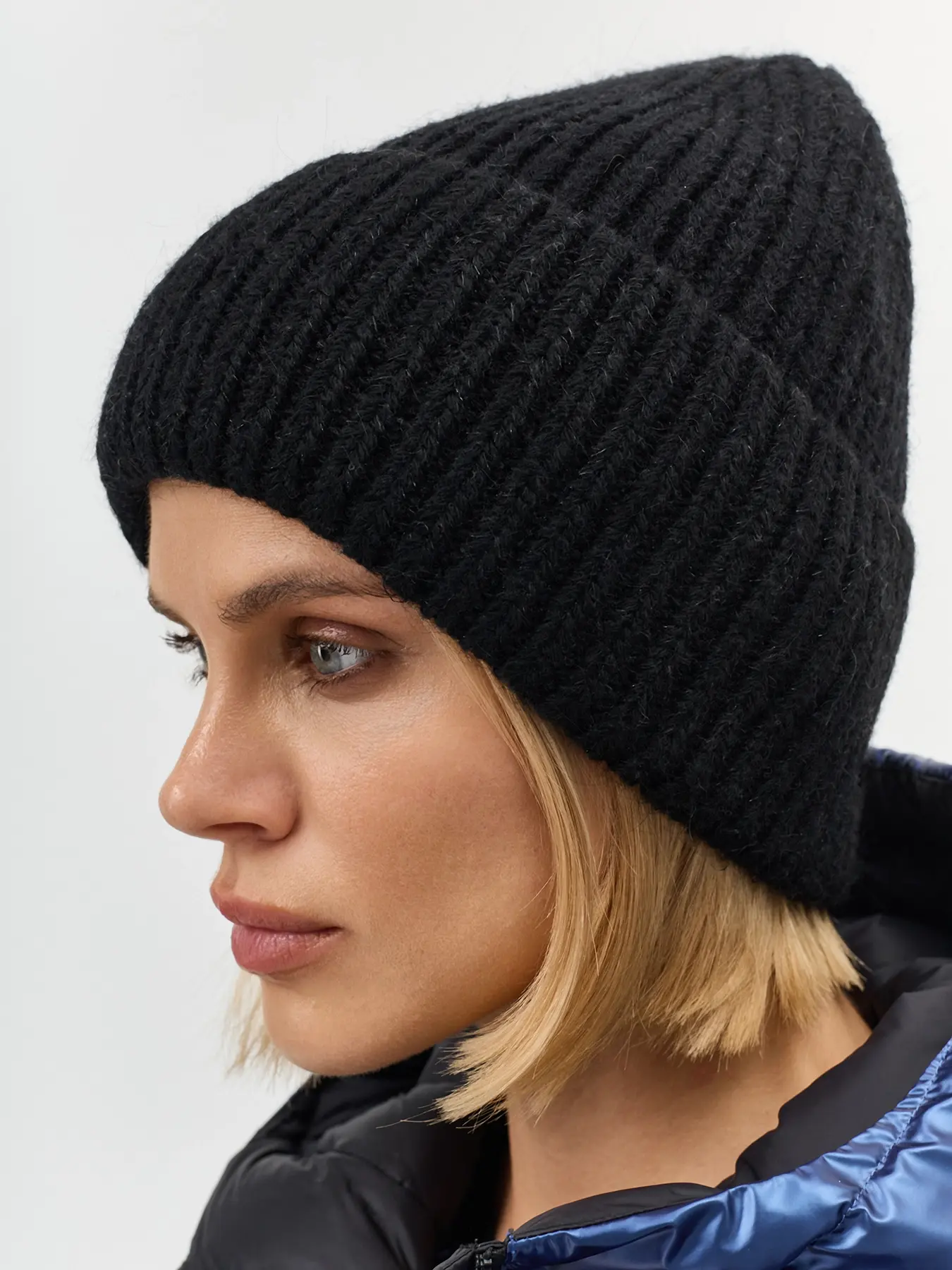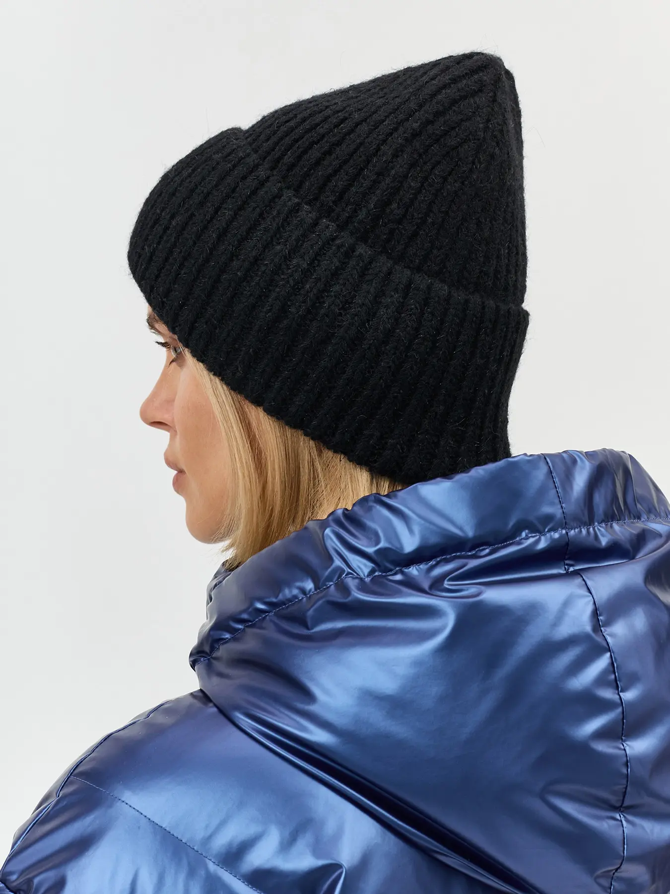Шапка бини с широким отворотом из пряжи с люрексом и пайетками. Отделка в рубчик. В составе ангора.