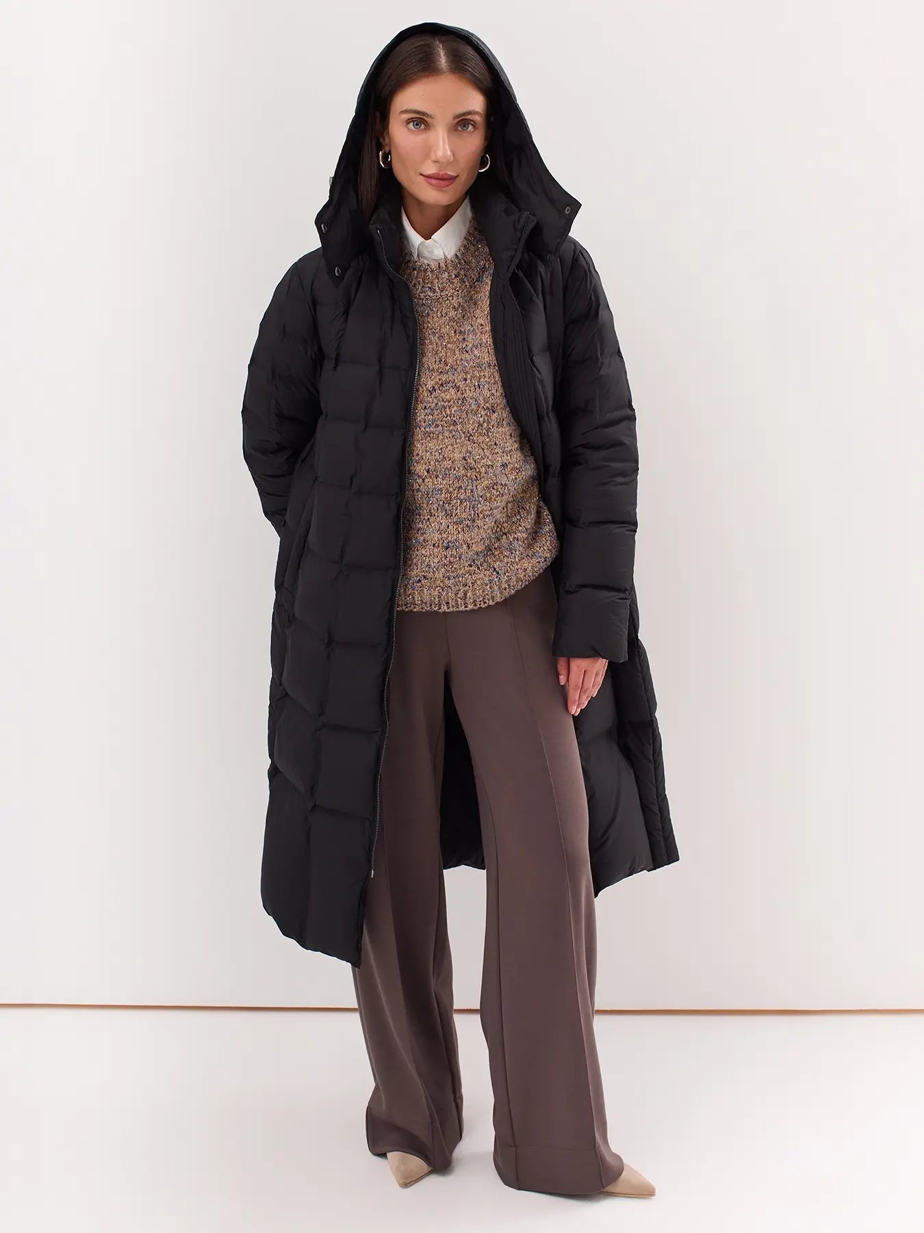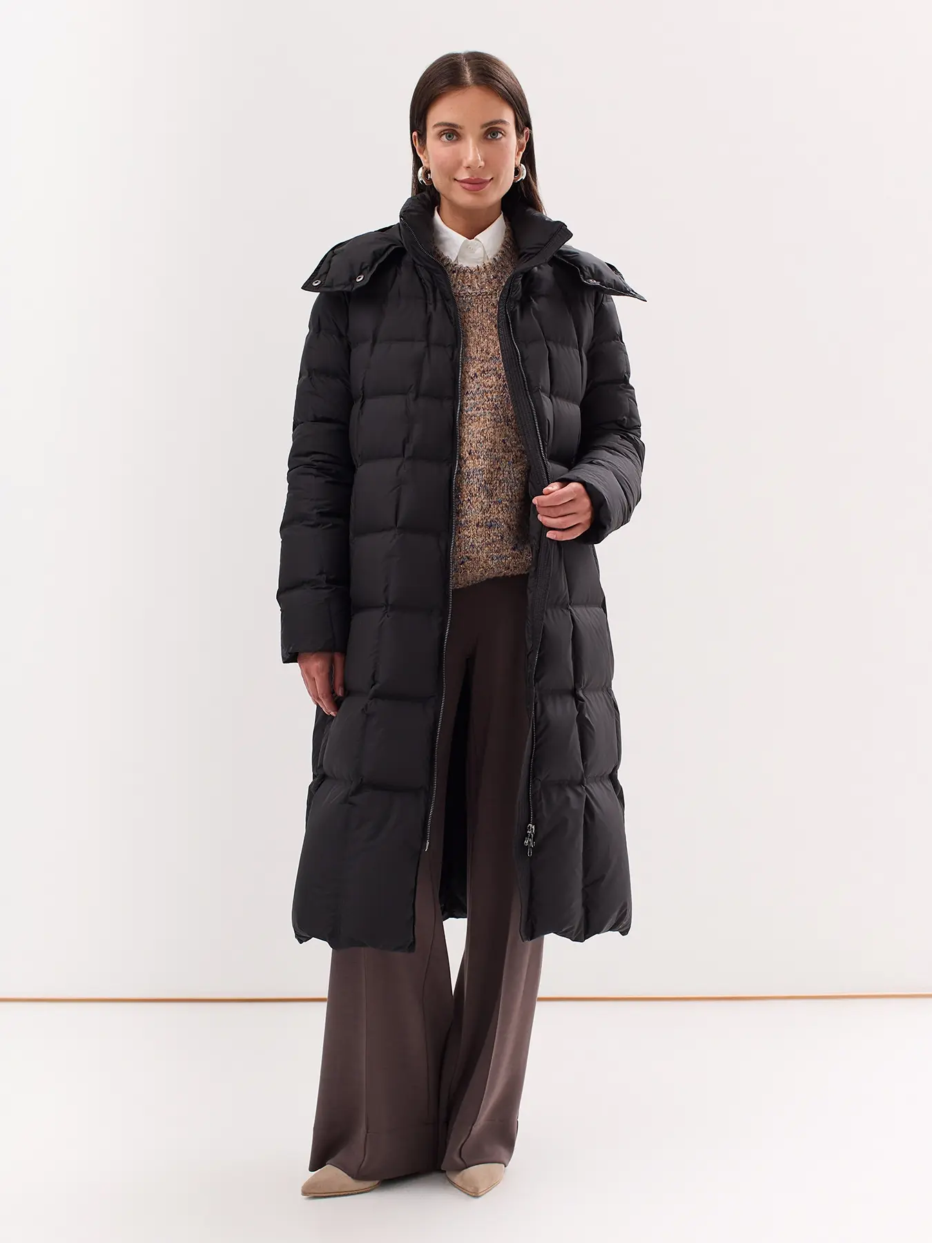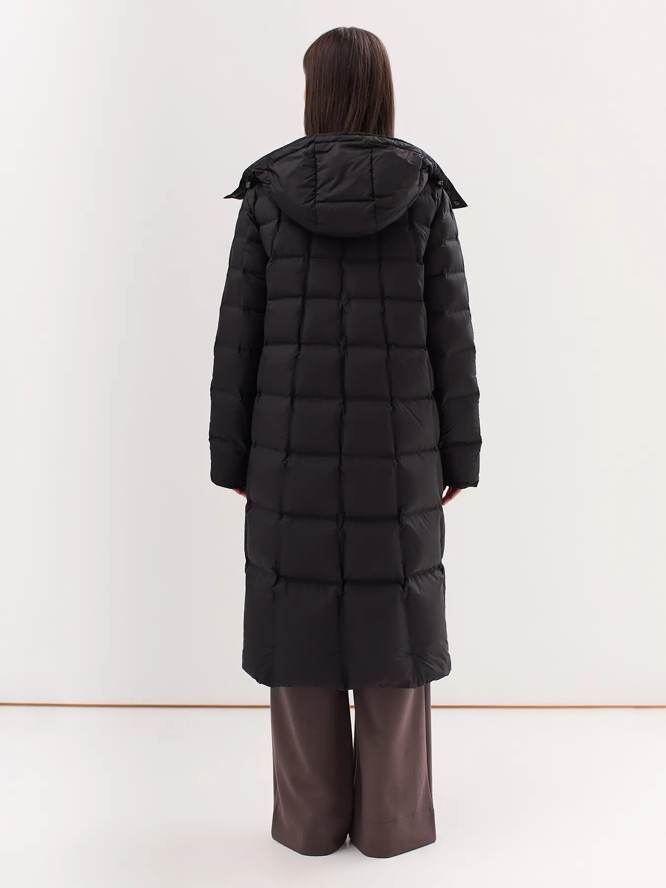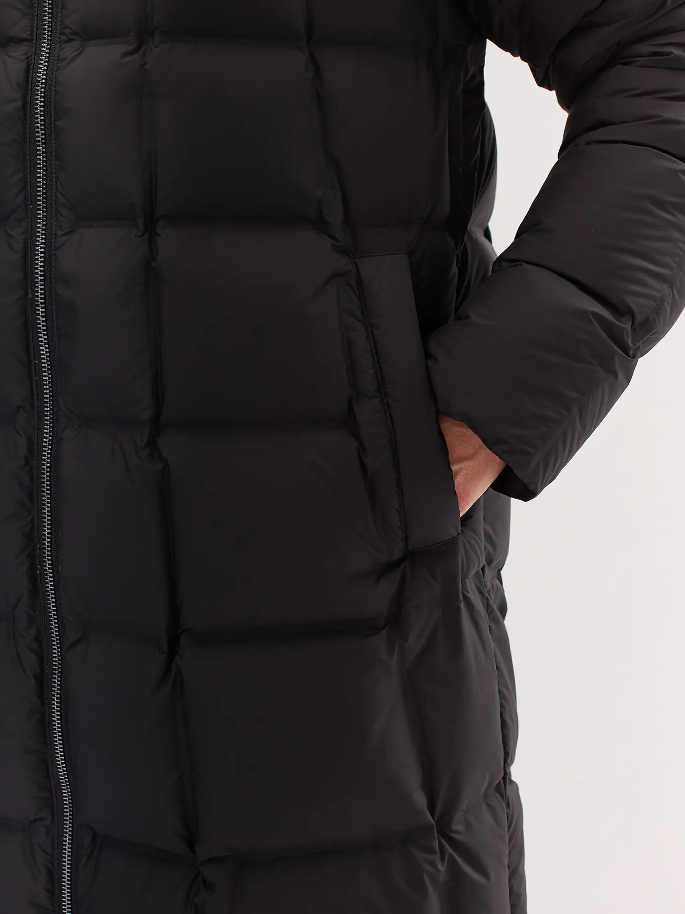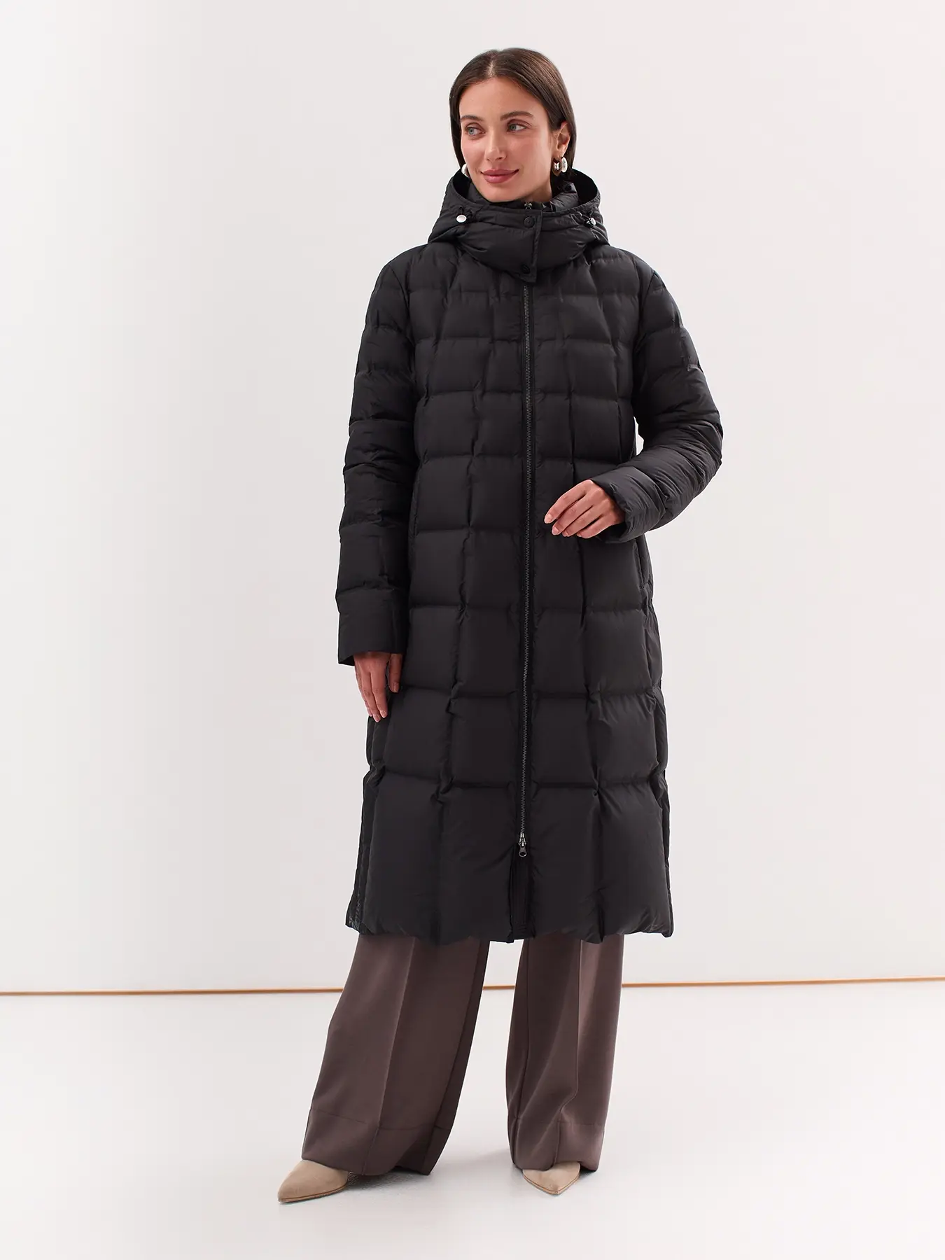 Удлиненный пуховик с квадратной стежкой и капюшоном. Застежка молния. Боковые карманы с листочками. Натуральный пух. Воротник стойка.