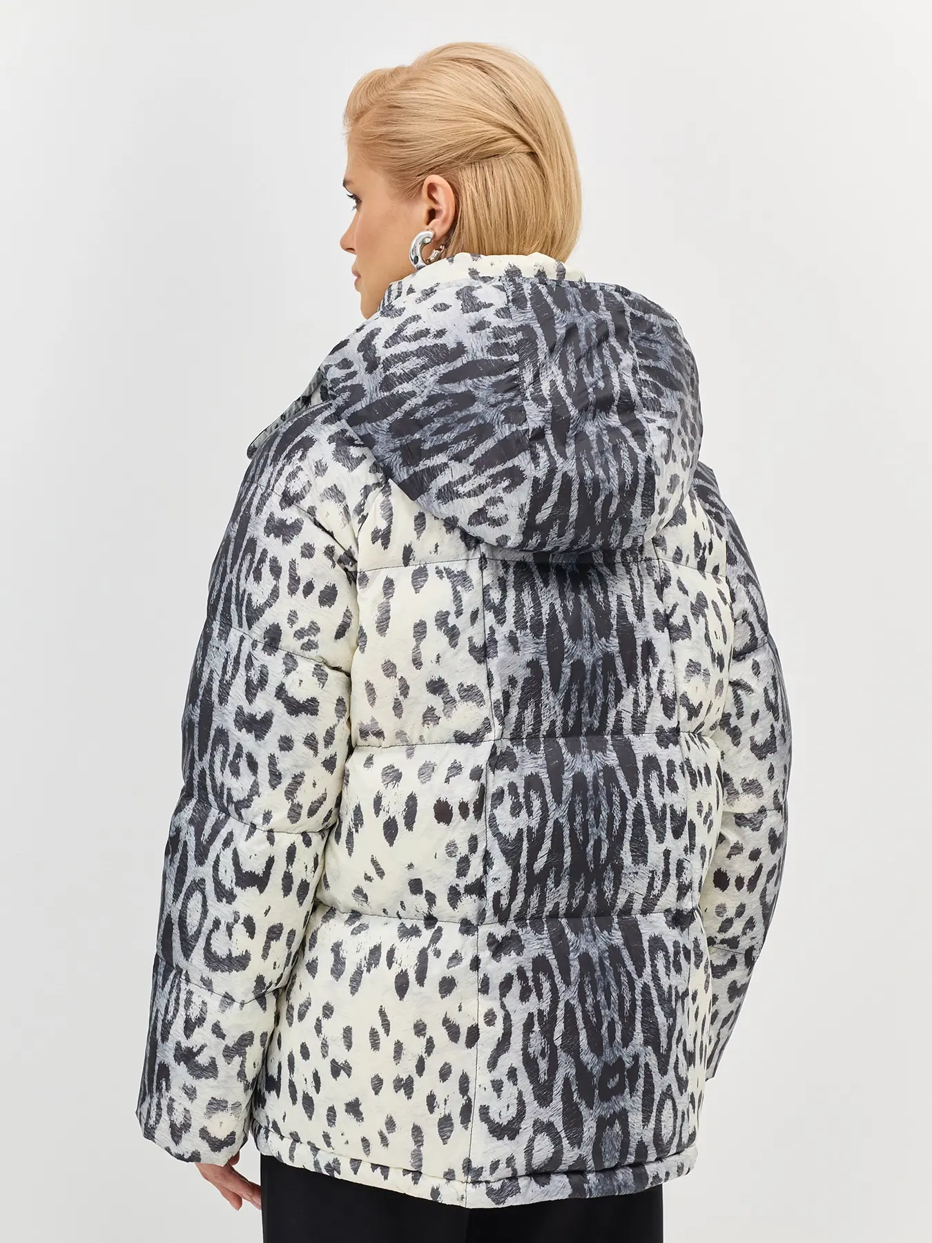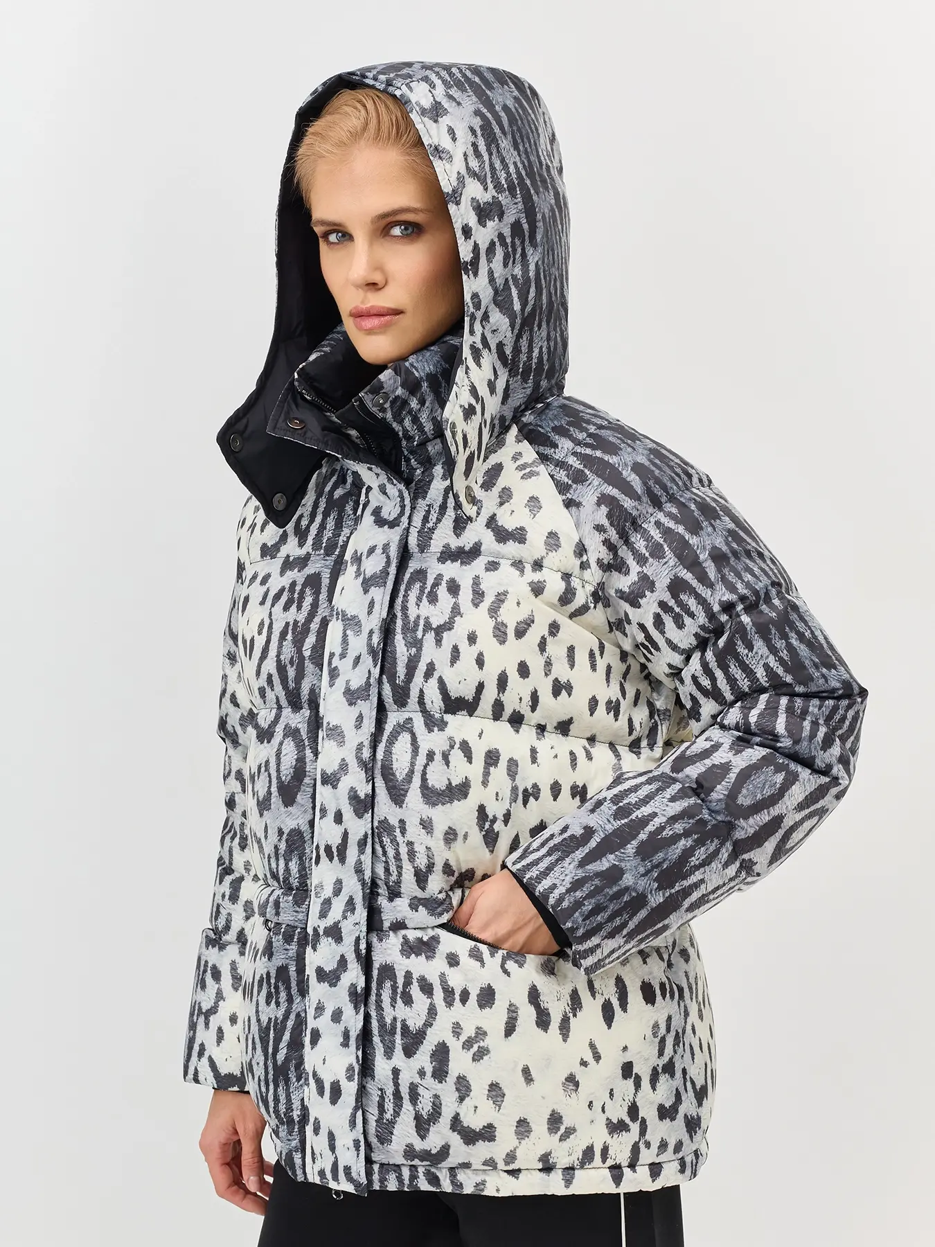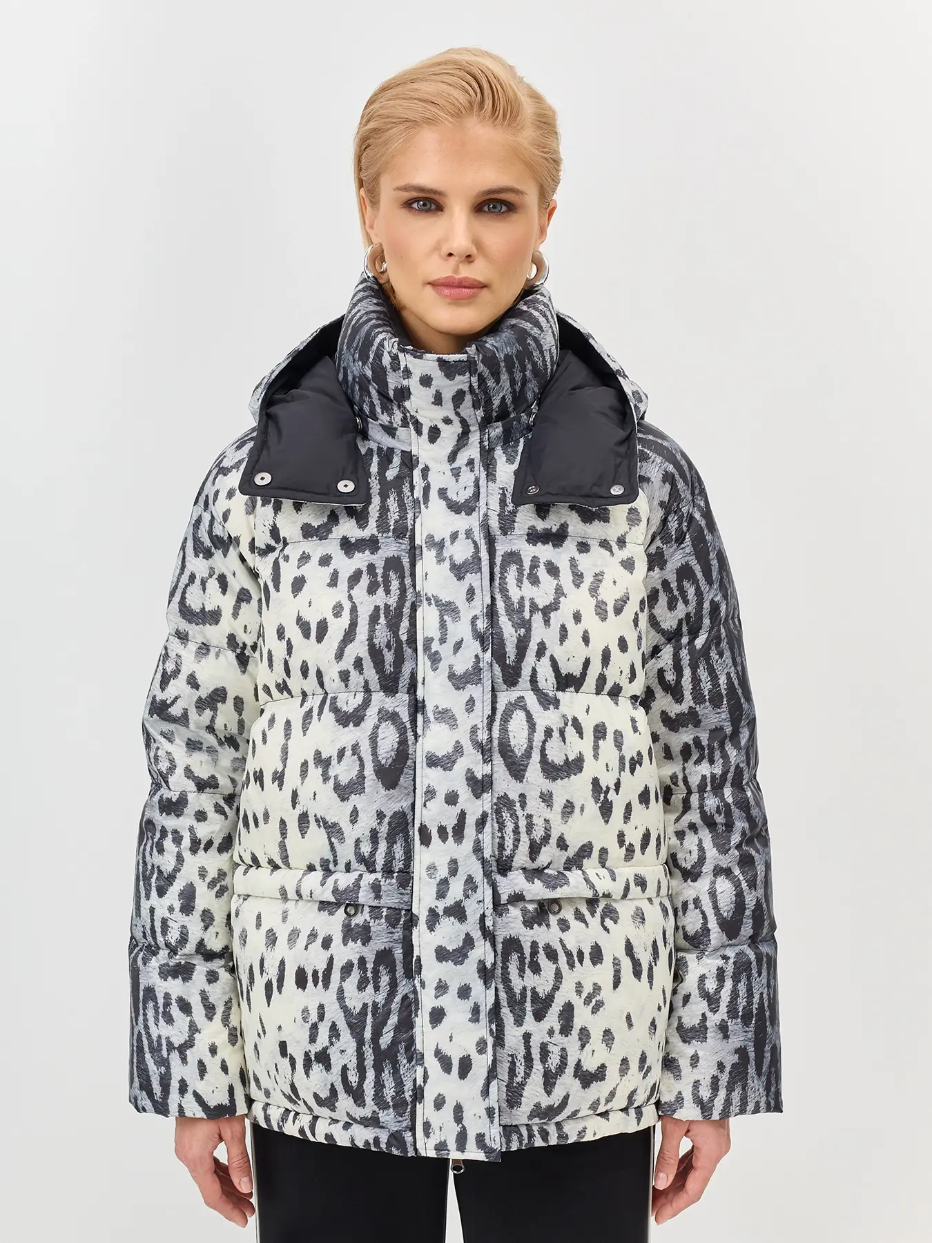 Теплая куртка-пуховик с монохромным анималистичным принтом. Свободный силуэт. Воротник стойка дополнен съемным капюшоном на кнопках с контрастной подкладкой. Застежка на молнию и планку с потайными кнопками. Боковые карманы на молниях. Рукава реглан с трикотажными манжетами по низу. Кулиса по низу для защиты от ветра. В качестве утеплителя натуральный пух.