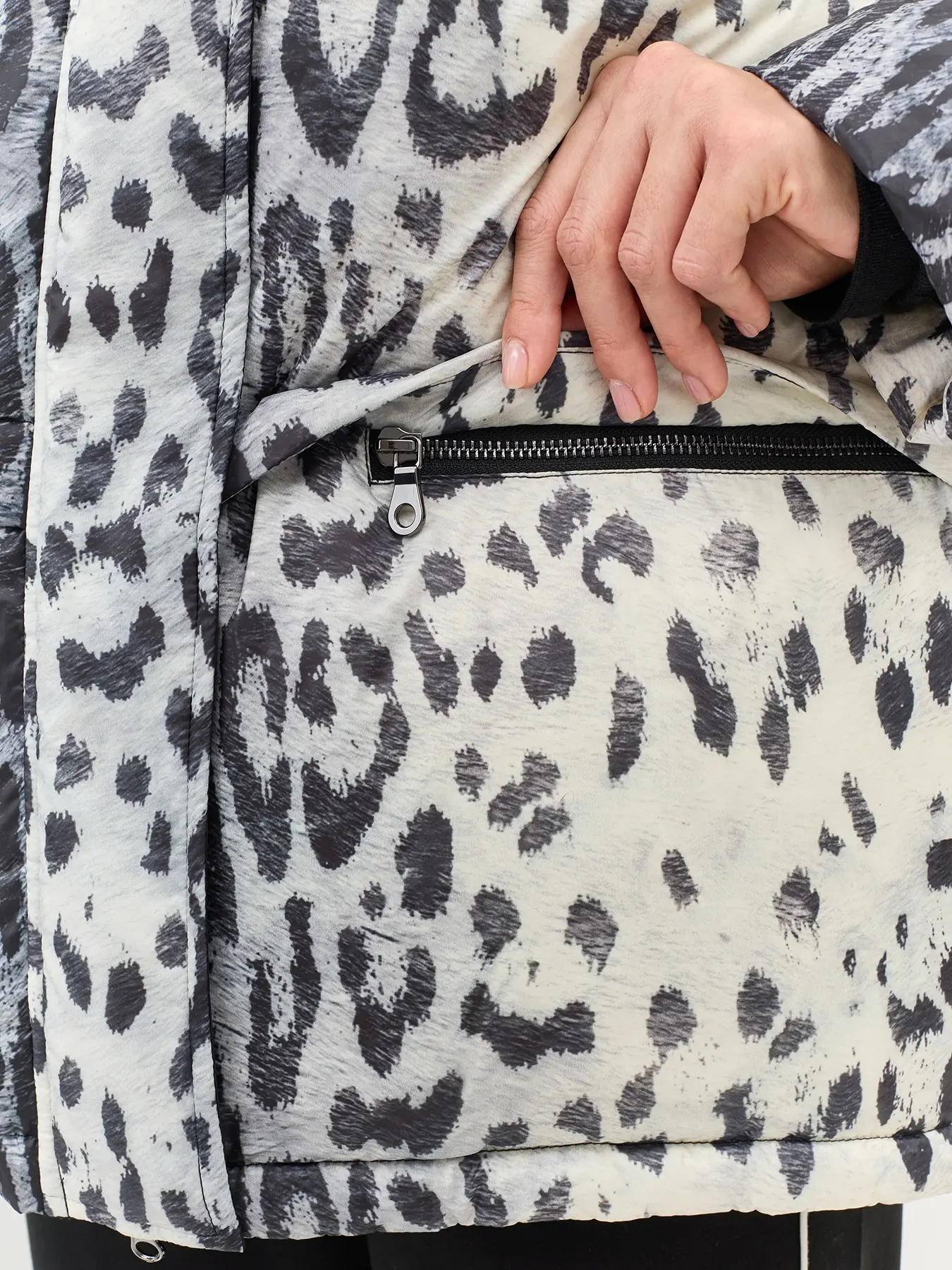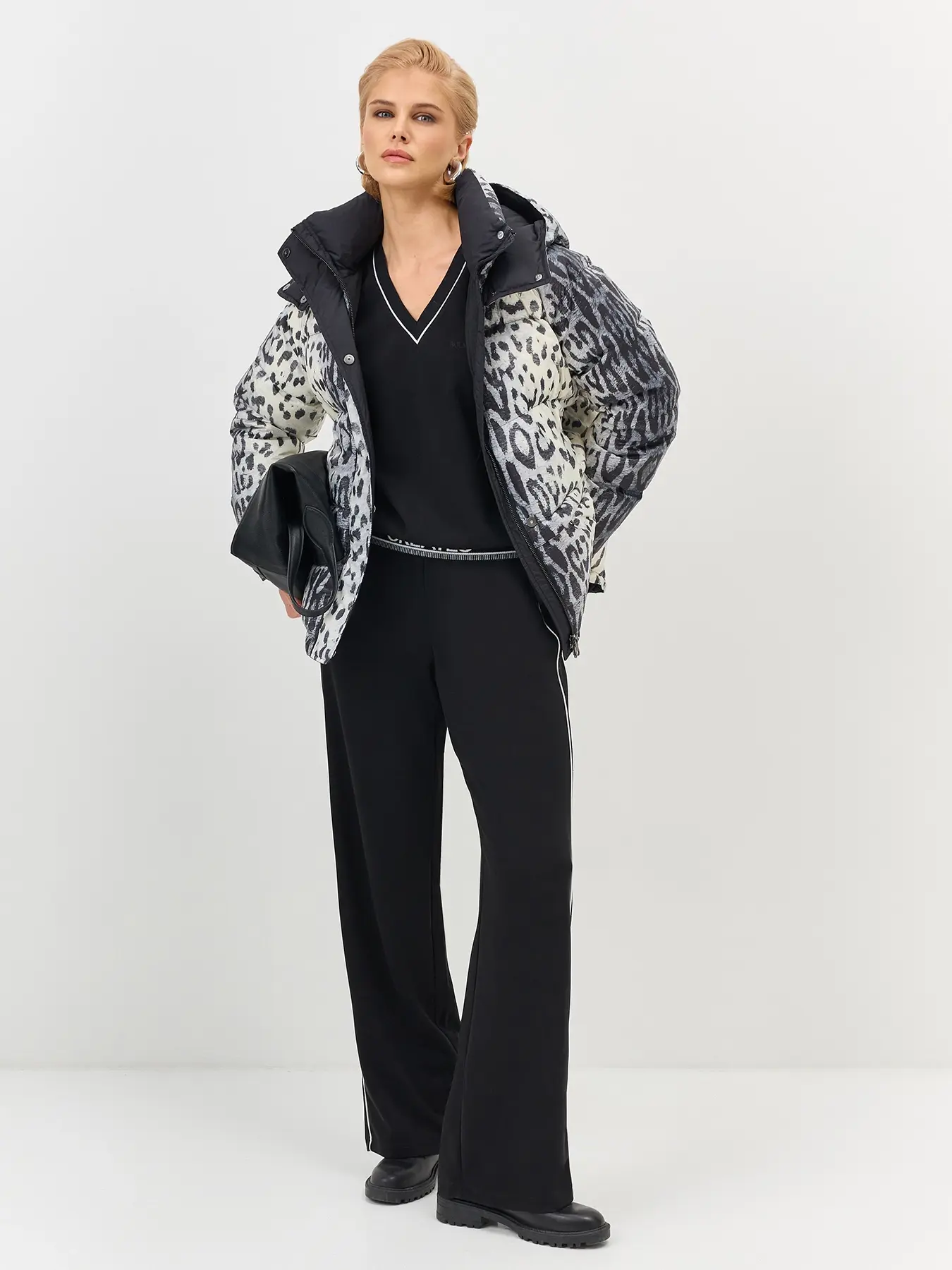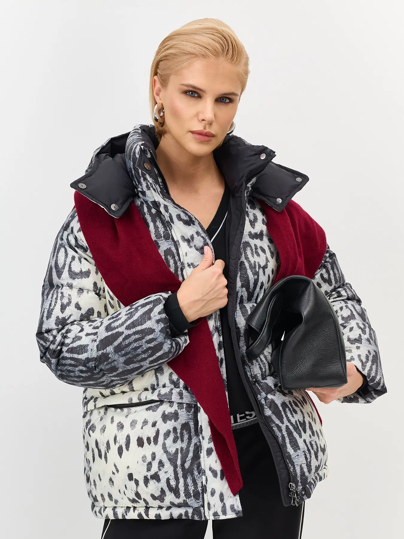 Теплая куртка-пуховик с монохромным анималистичным принтом. Свободный силуэт. Воротник стойка дополнен съемным капюшоном на кнопках с контрастной подкладкой. Застежка на молнию и планку с потайными кнопками. Боковые карманы на молниях. Рукава реглан с трикотажными манжетами по низу. Кулиса по низу для защиты от ветра. В качестве утеплителя натуральный пух.