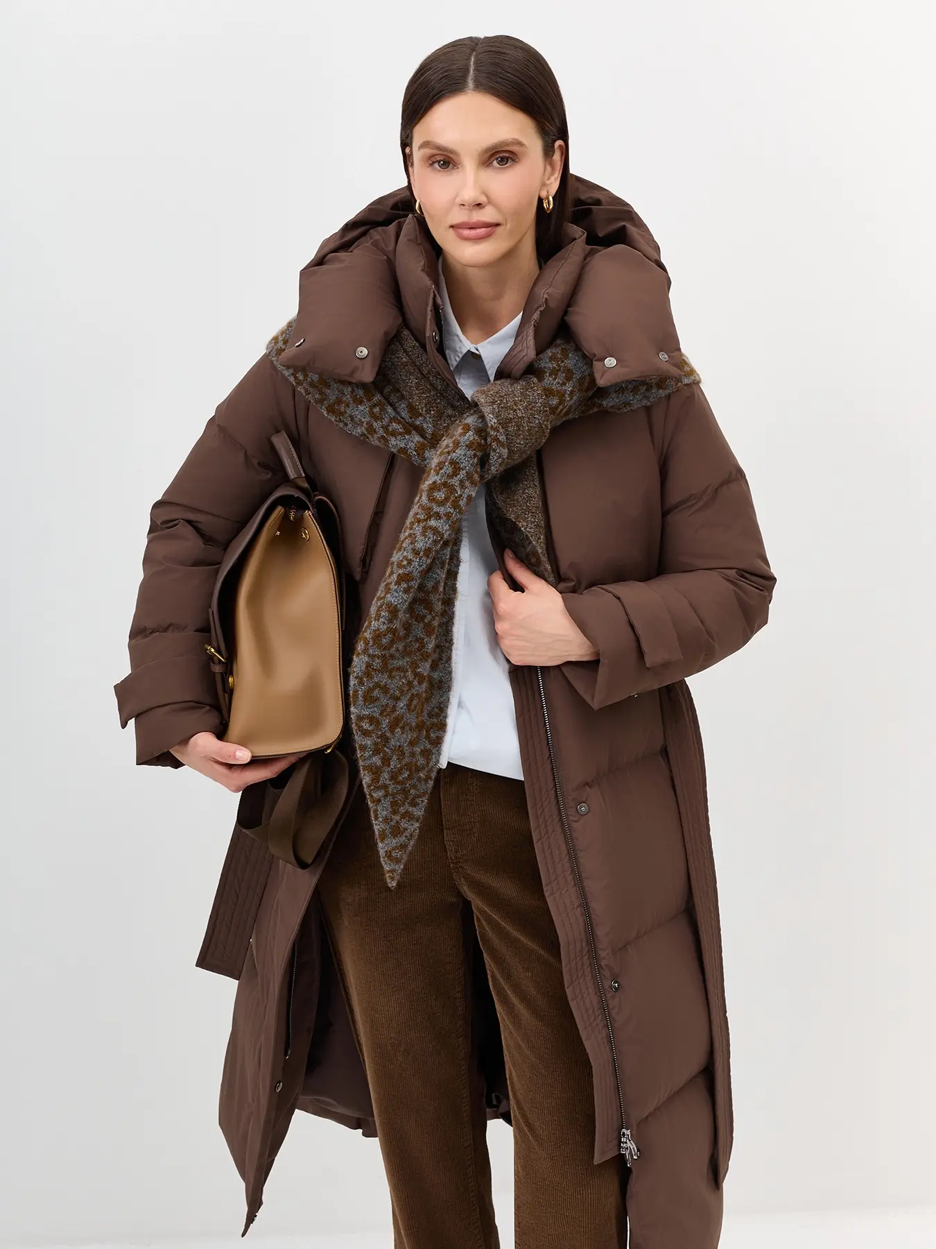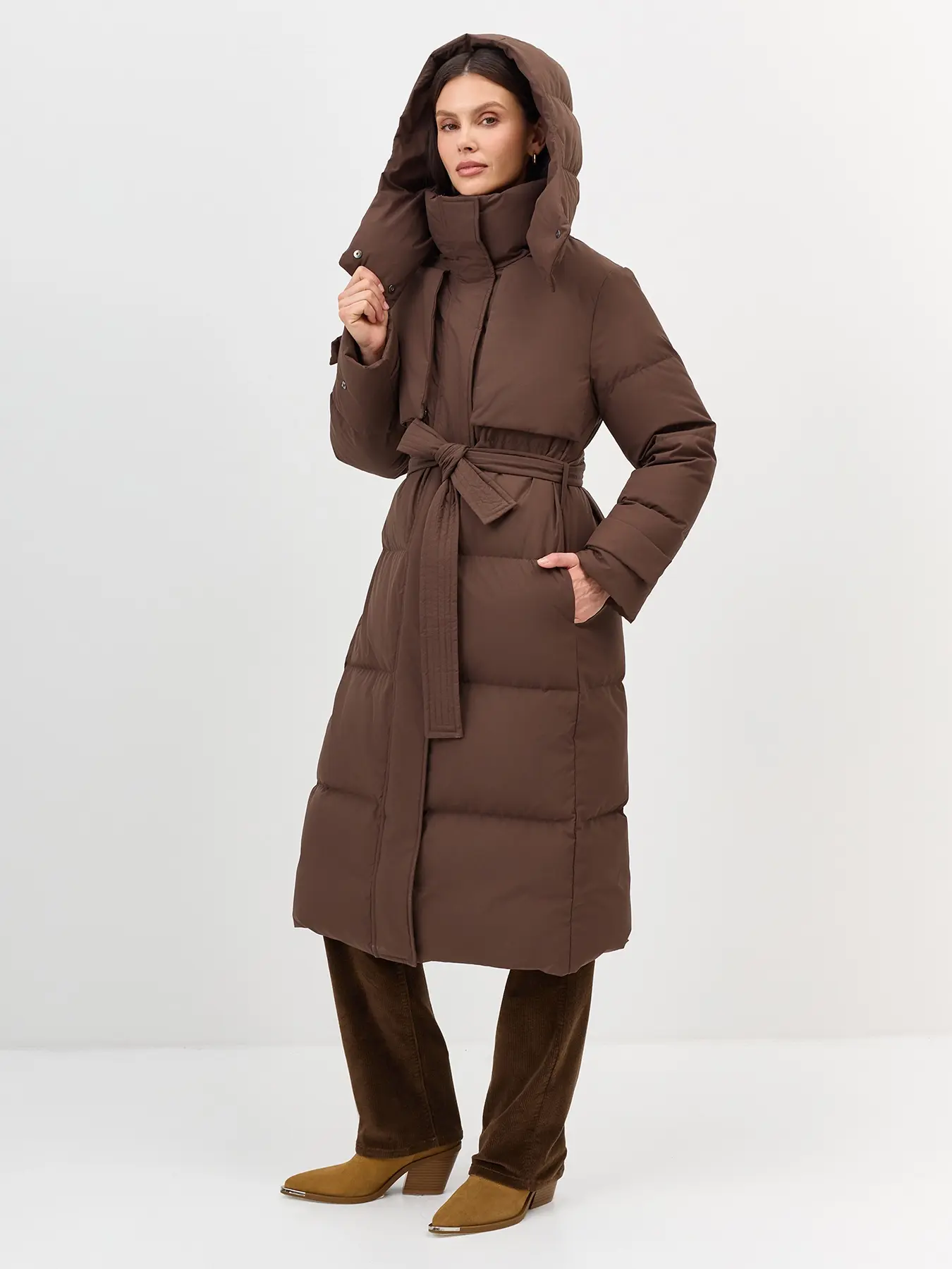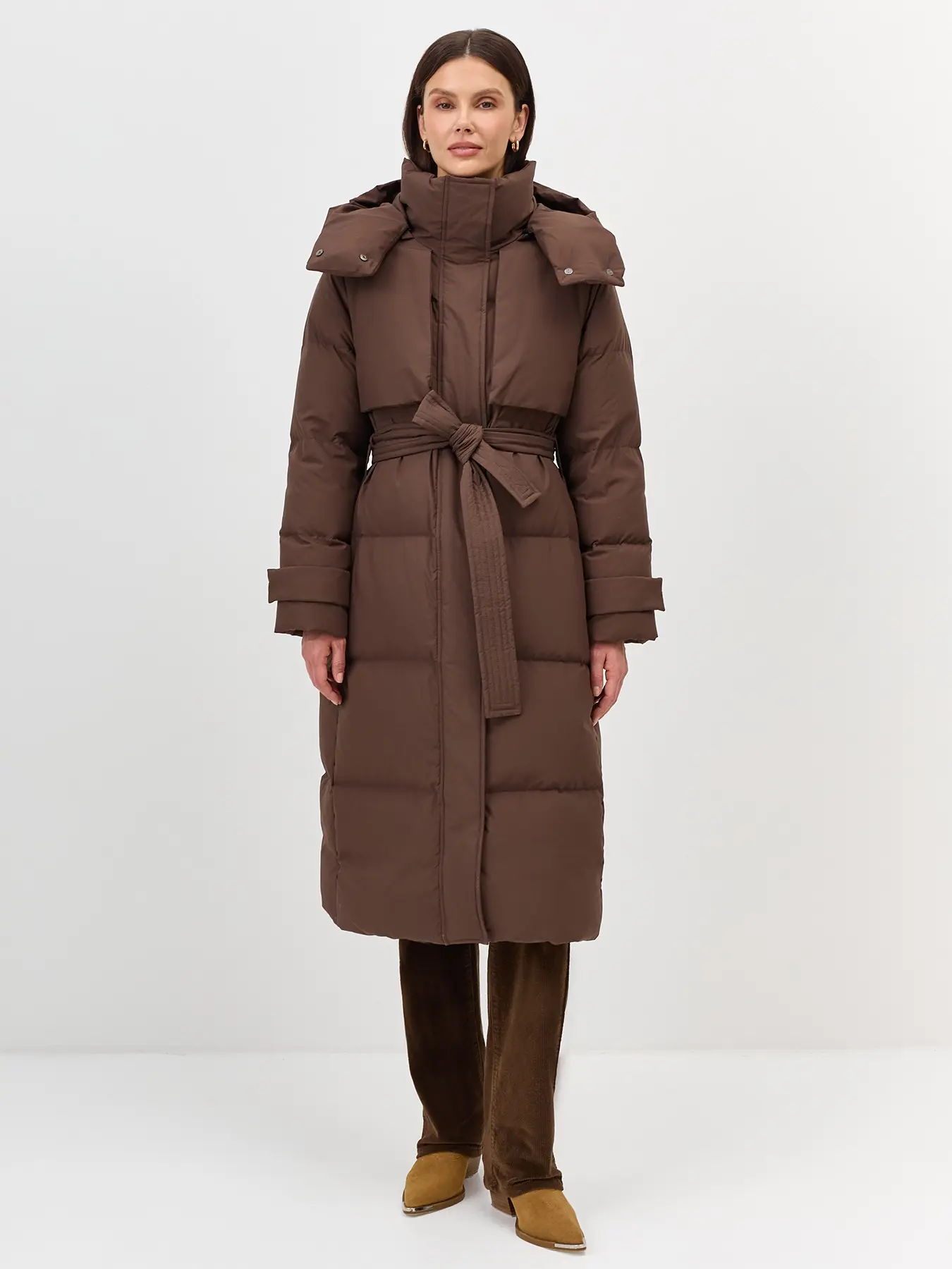 Длинный пуховик. Свободный силуэт можно приталить съемным поясом. Длина миди. Воротник стойка дополнен съемным капюшоном на кнопках. Боковые карманы в швах. Паты по низу рукавов на кнопках. Дополнено отлетной кокеткой на кнопках. В качестве утеплителя натуральный пух.