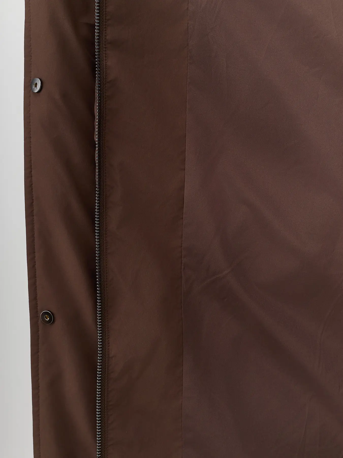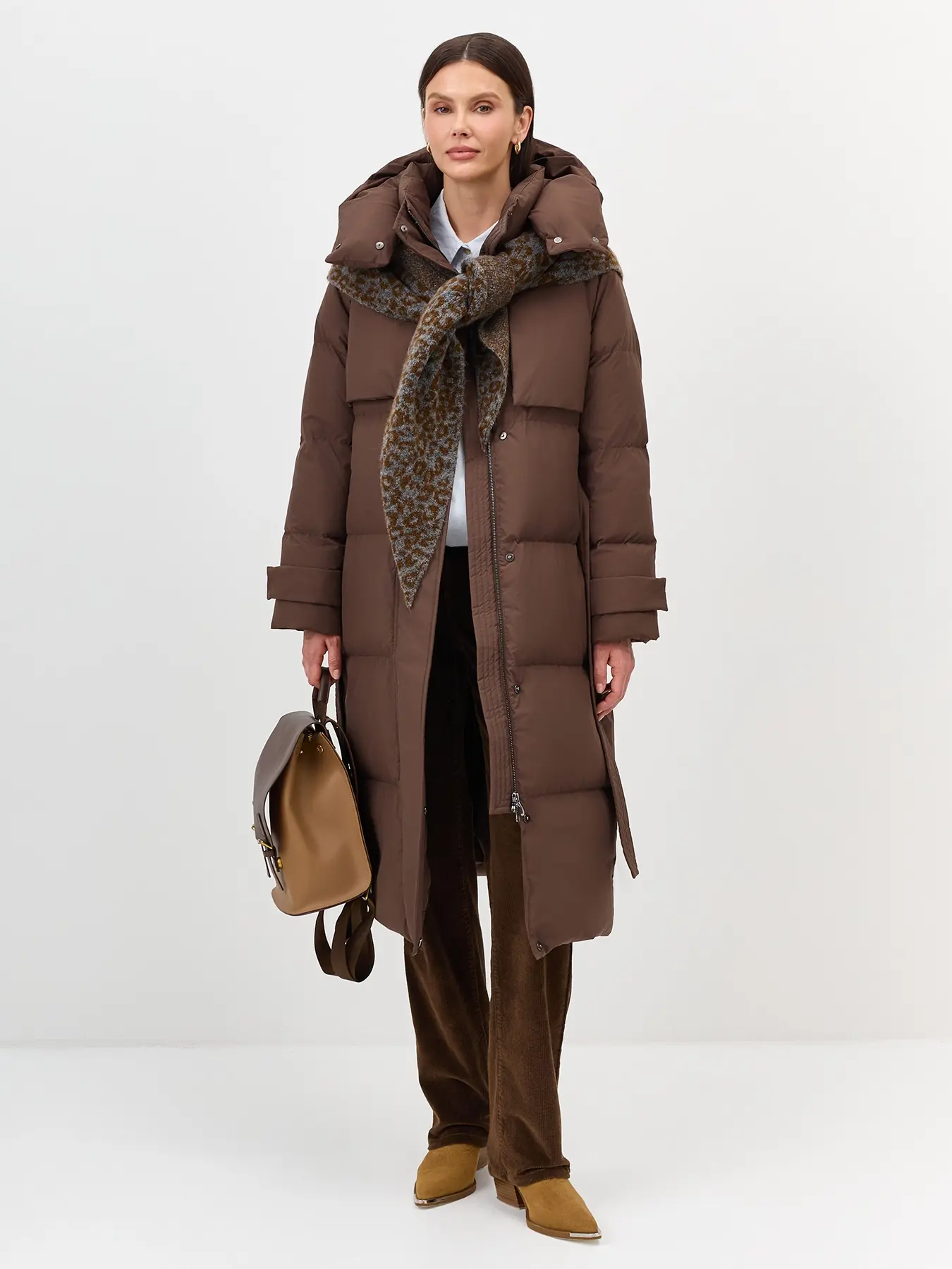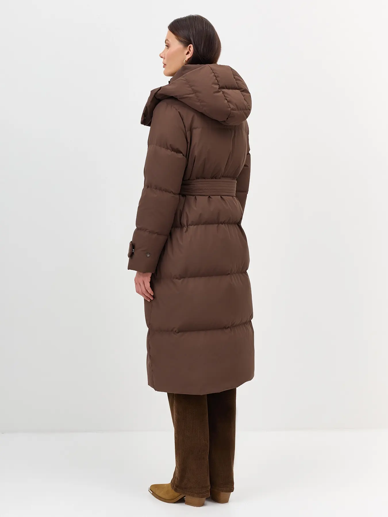 Длинный пуховик. Свободный силуэт можно приталить съемным поясом. Длина миди. Воротник стойка дополнен съемным капюшоном на кнопках. Боковые карманы в швах. Паты по низу рукавов на кнопках. Дополнено отлетной кокеткой на кнопках. В качестве утеплителя натуральный пух.