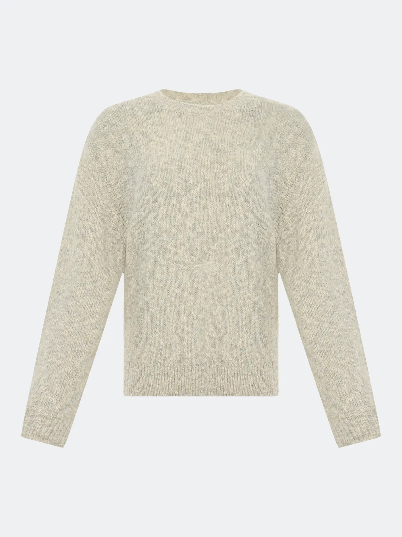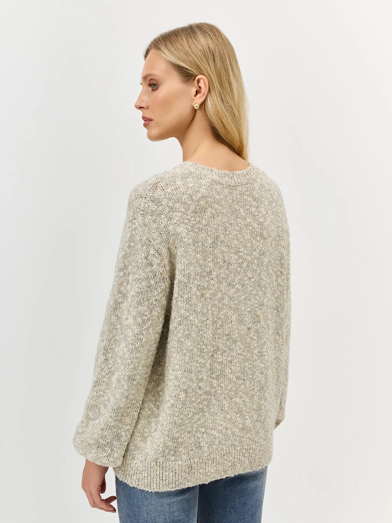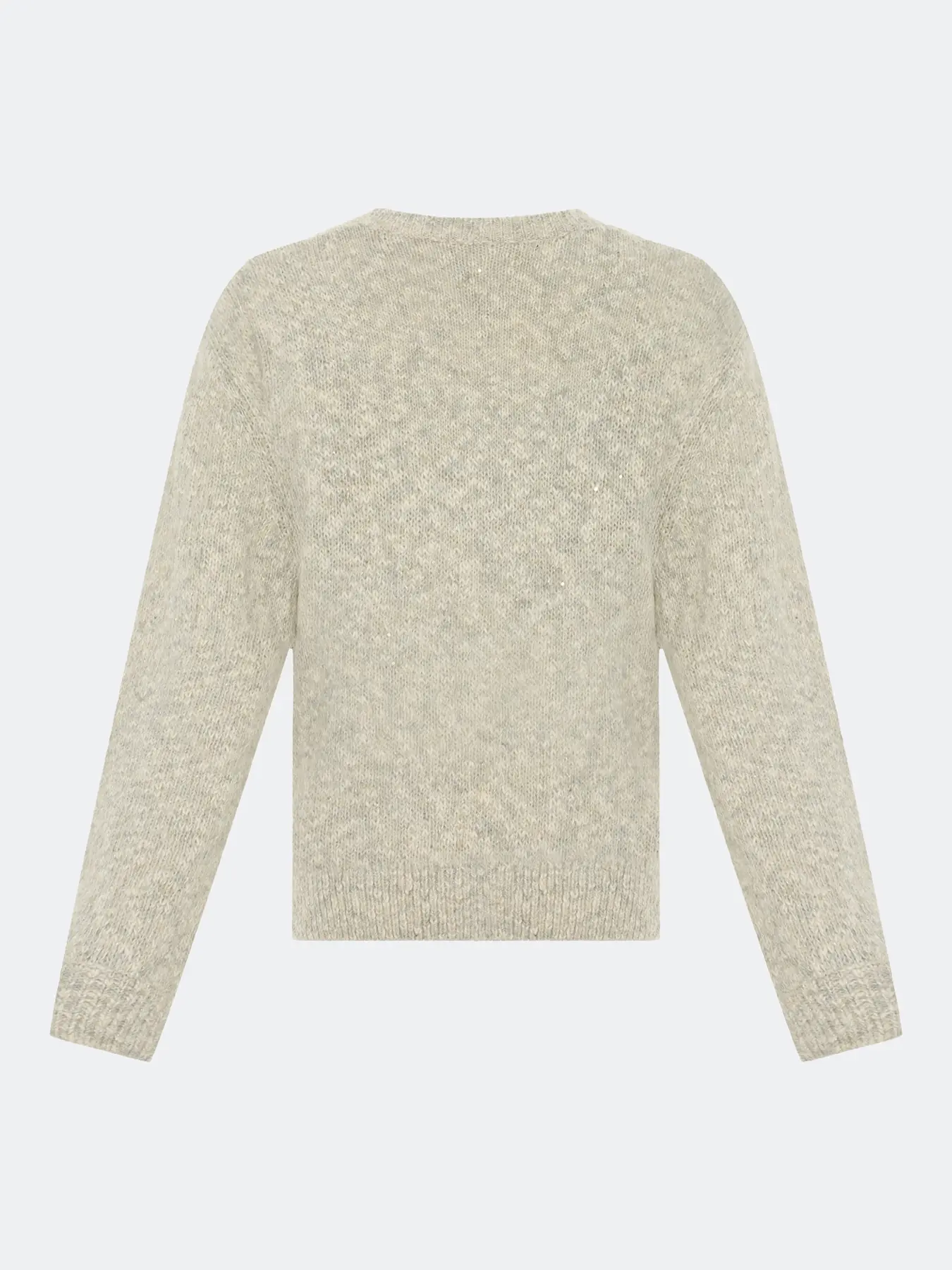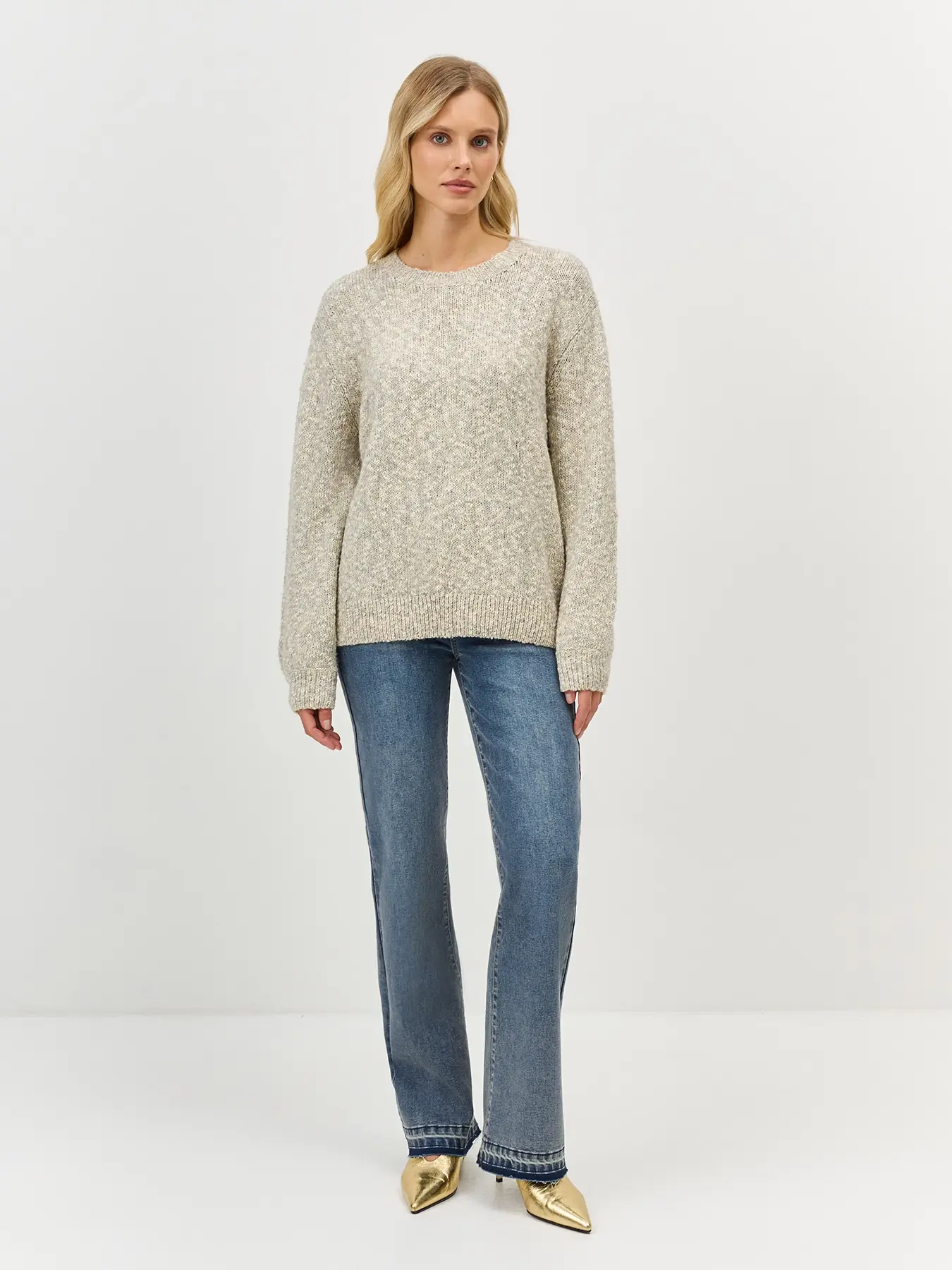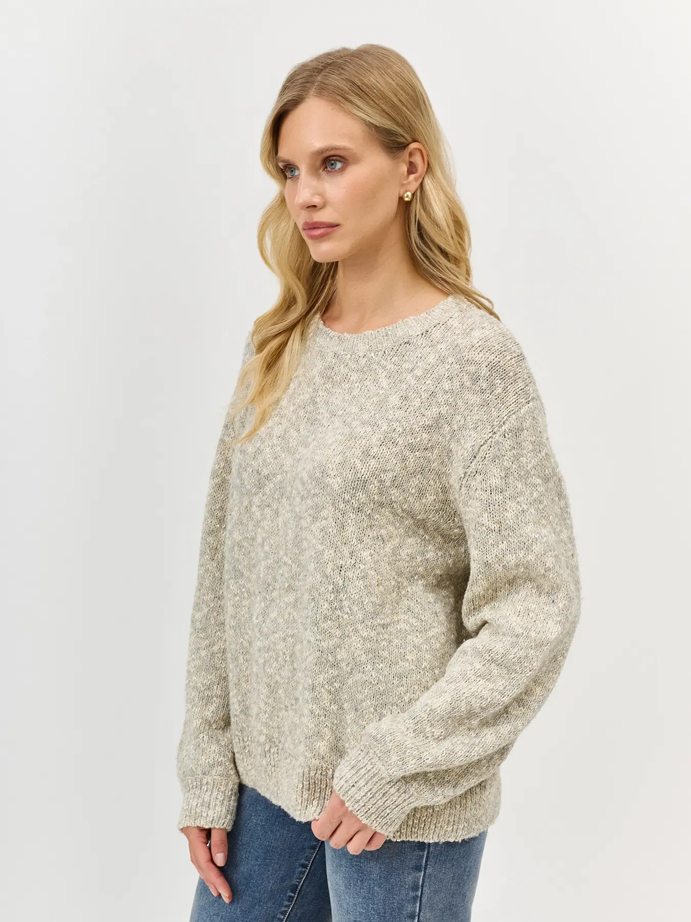 Объемный меланжевый джемпер с мерцающими пайетками. Свободный силуэт. Круглый вырез. Спущенная линия плеч. Фактурная объемная вязка. В составе люрекс и шерсть.