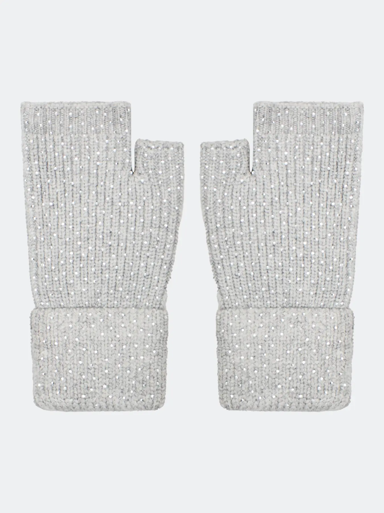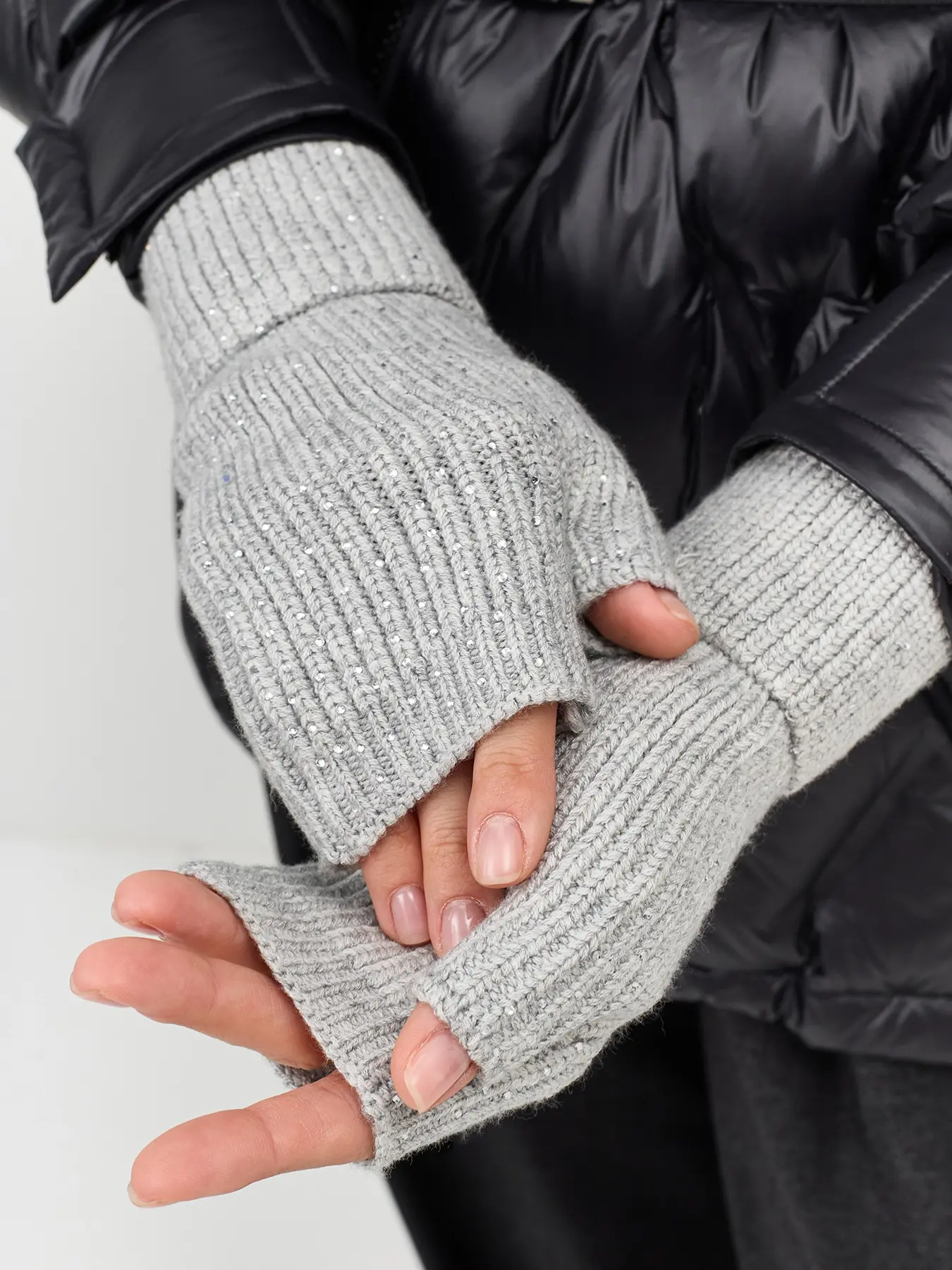 Вязаные варежки-митенки из пряжи с добавлением шерсти. Эластичные трикотажные манжеты и резинка вокруг пальцев. Украшены деликатными бусинками.
