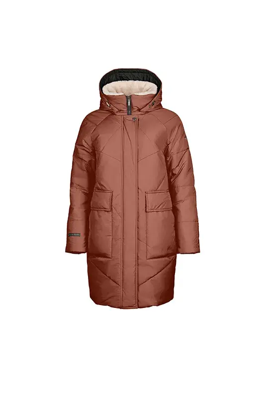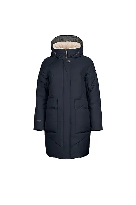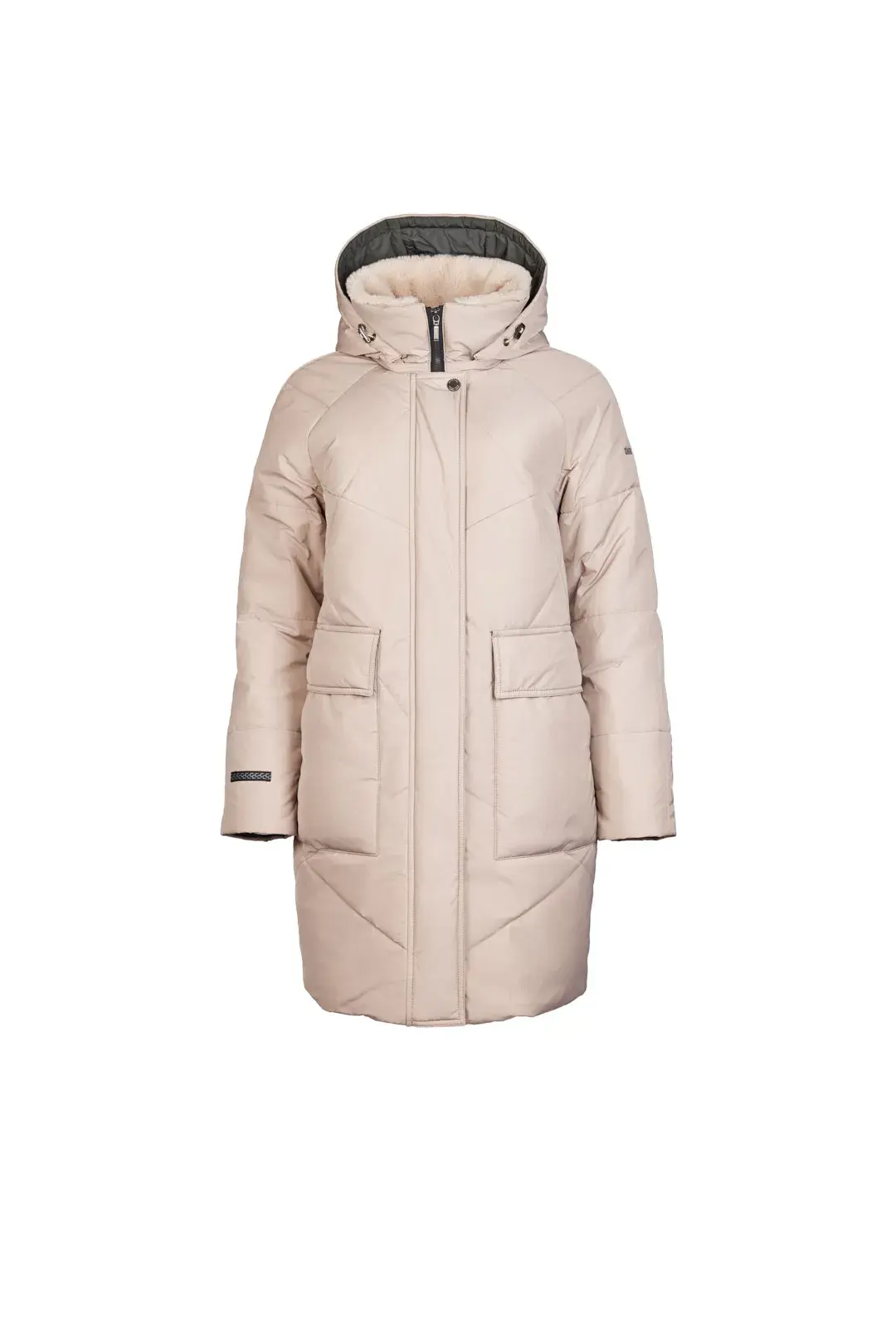Куртка зимняя средней длины. В рукавах - ветрозащитные манжеты с натуральной шерстью в составе. Утеплитель состоит из двух слоев. Преимущество двойного слоя утеплителя: изделие смотрится изящно, оно легкое, при этом лучше сохраняет тепло в сравнение с однослойным утеплителем, так как между слоями образуется воздушная подушка. Изделие комфортной посадки. Рукав реглан. Карманы с искусственным мехом внутри прикрыты листочками.