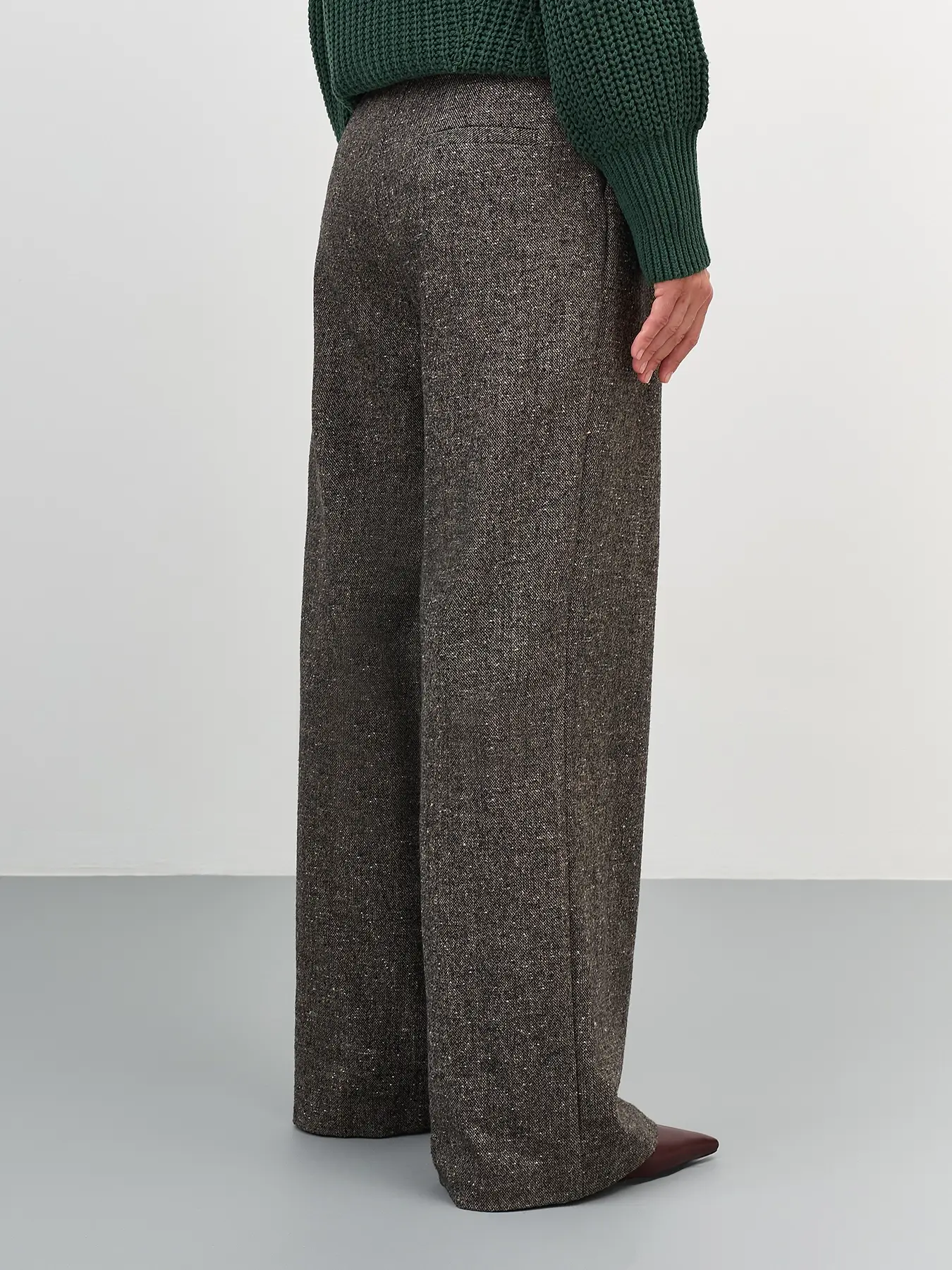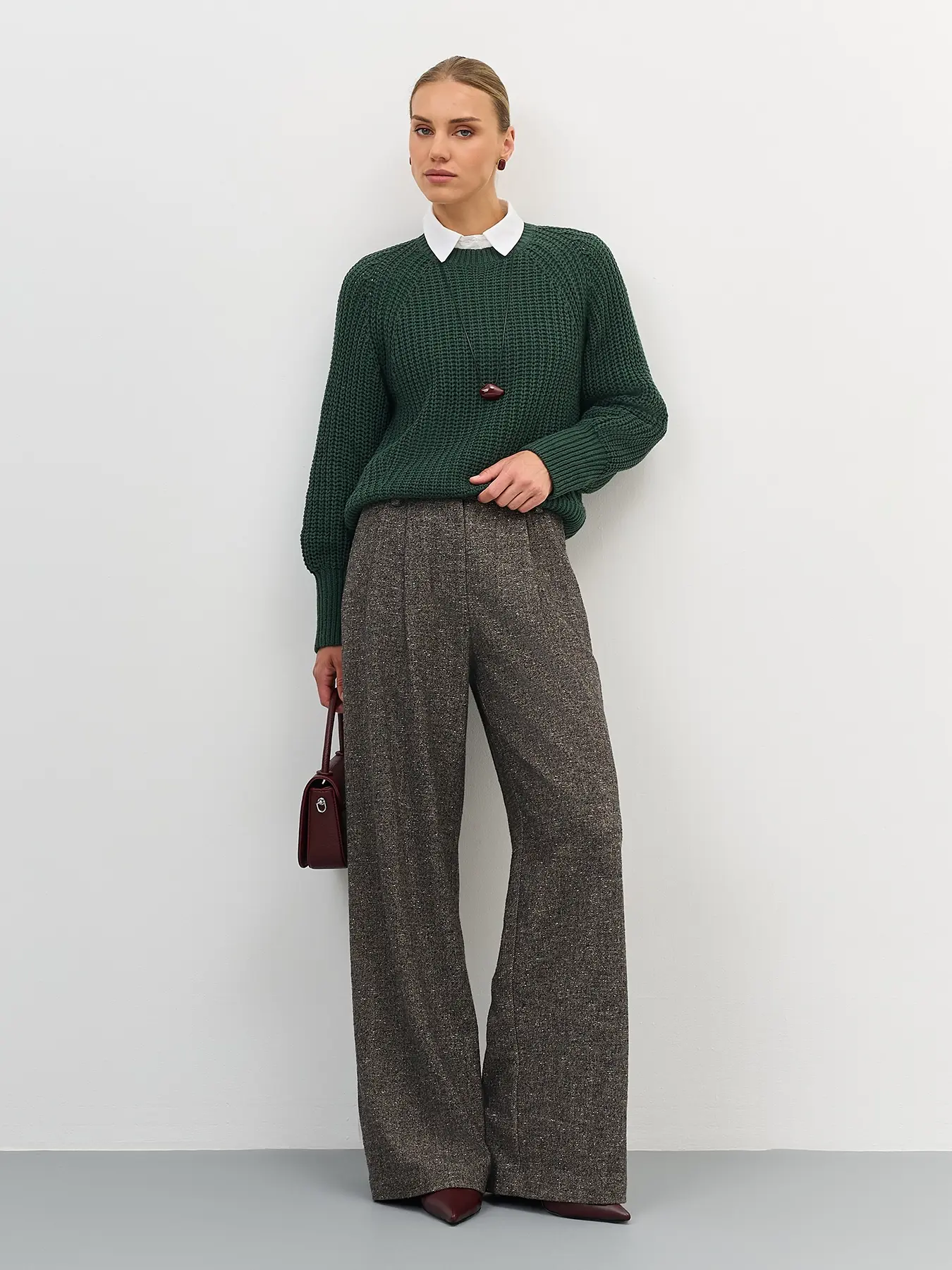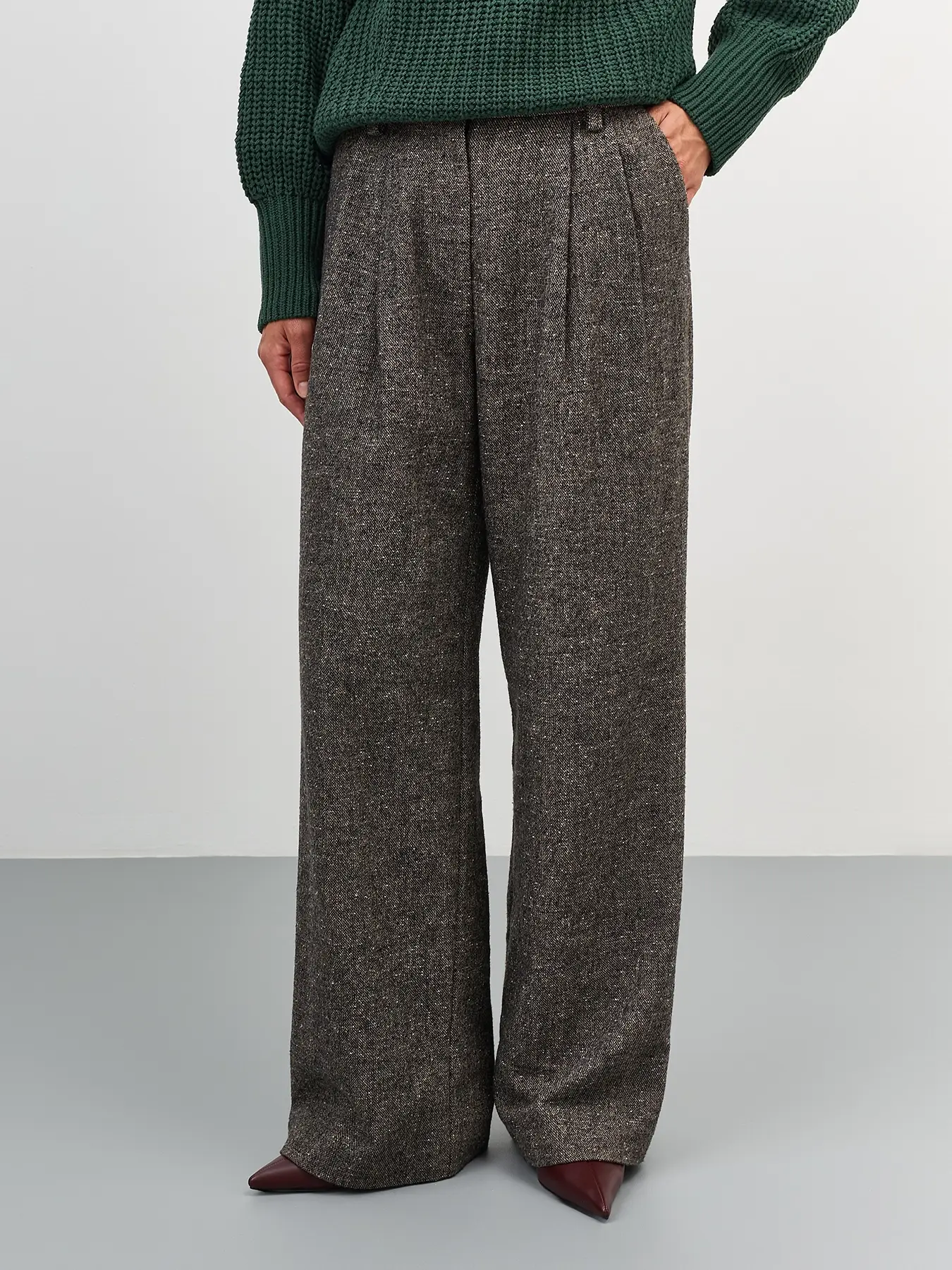 Брюки палаццо с защипами-складками из ткани с эффектом букле. Свободный силуэт. Застежка на молнию и пуговицу. Боковые карманы в швах.