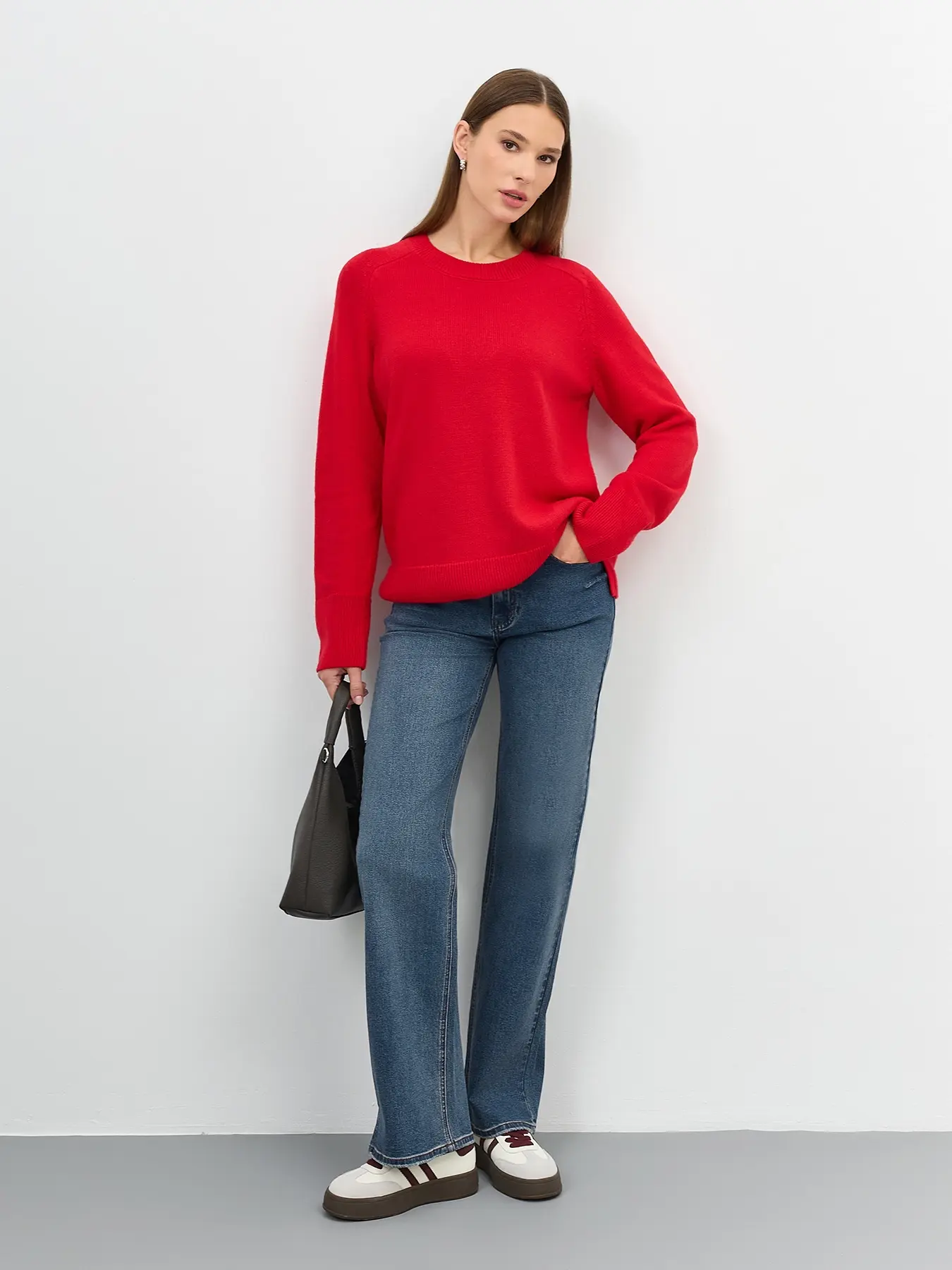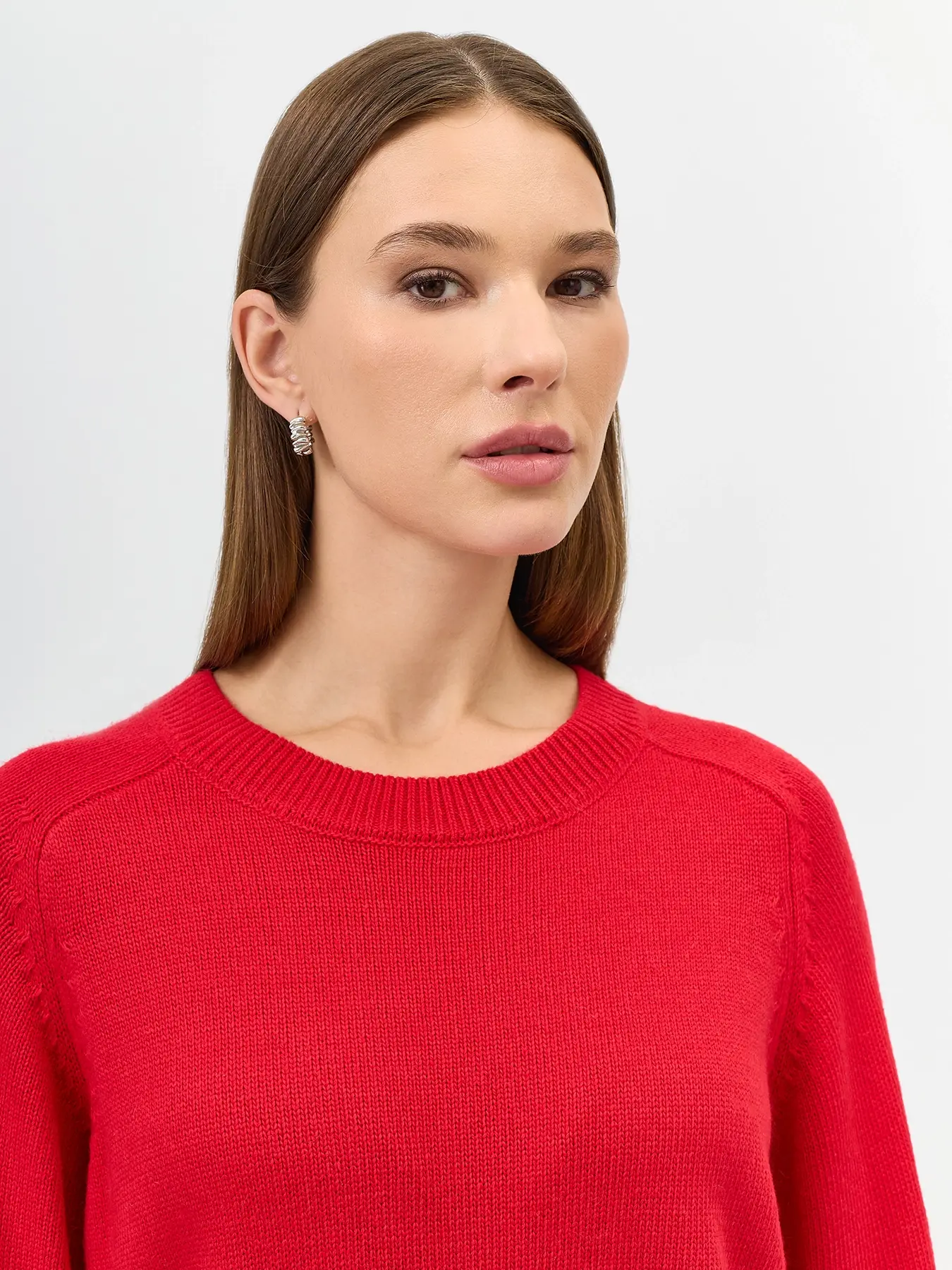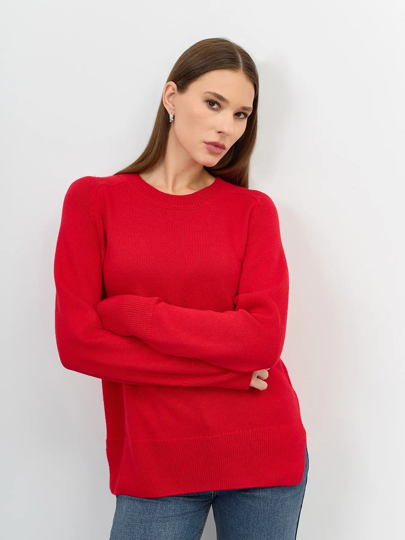Яркий джемпер с ангорой в составе. Прямой силуэт. Круглый вырез. Длинные рукава реглан. Боковые разрезы в швах. Широкие манжеты по низу рукавов и изделия.
