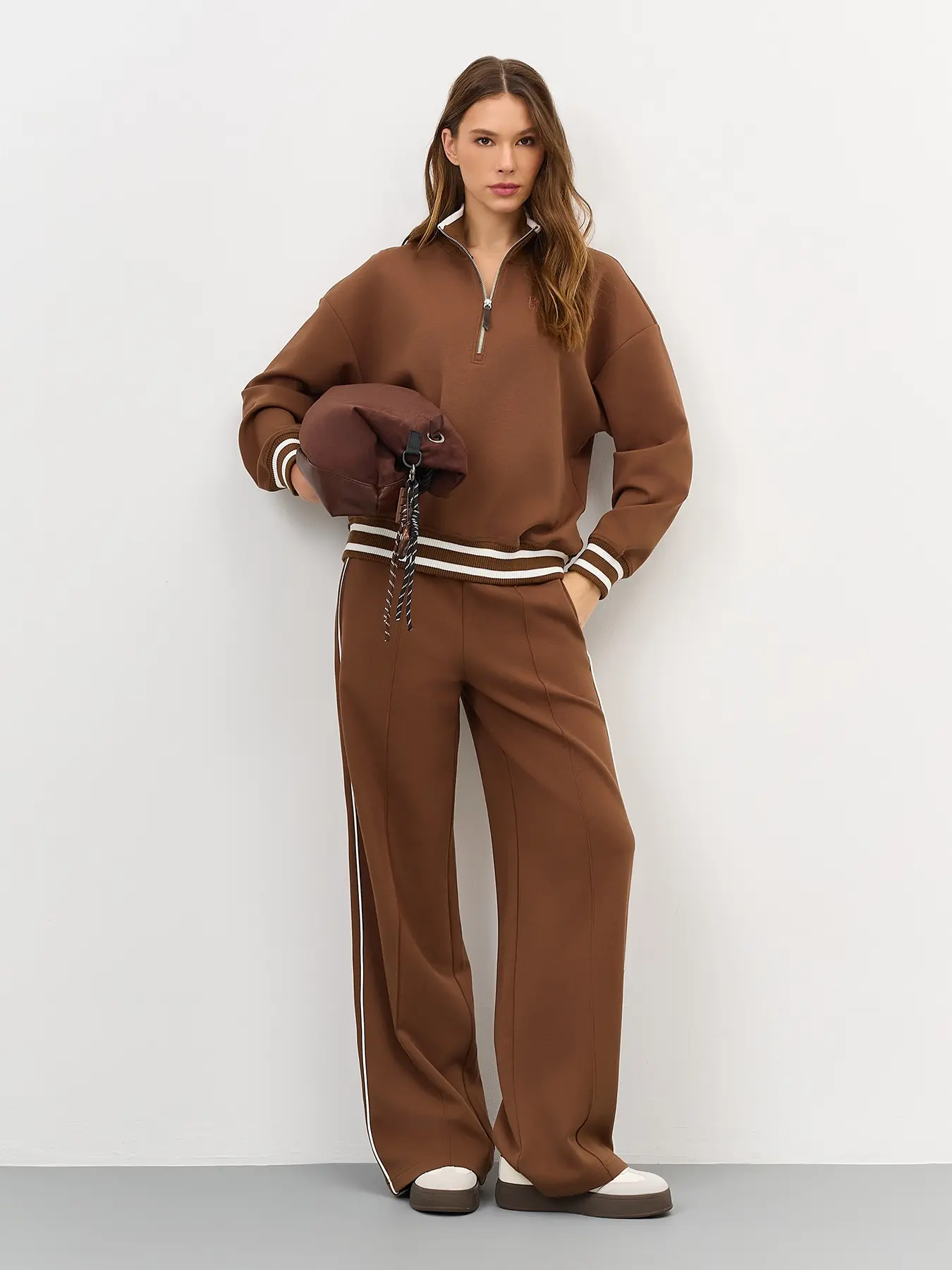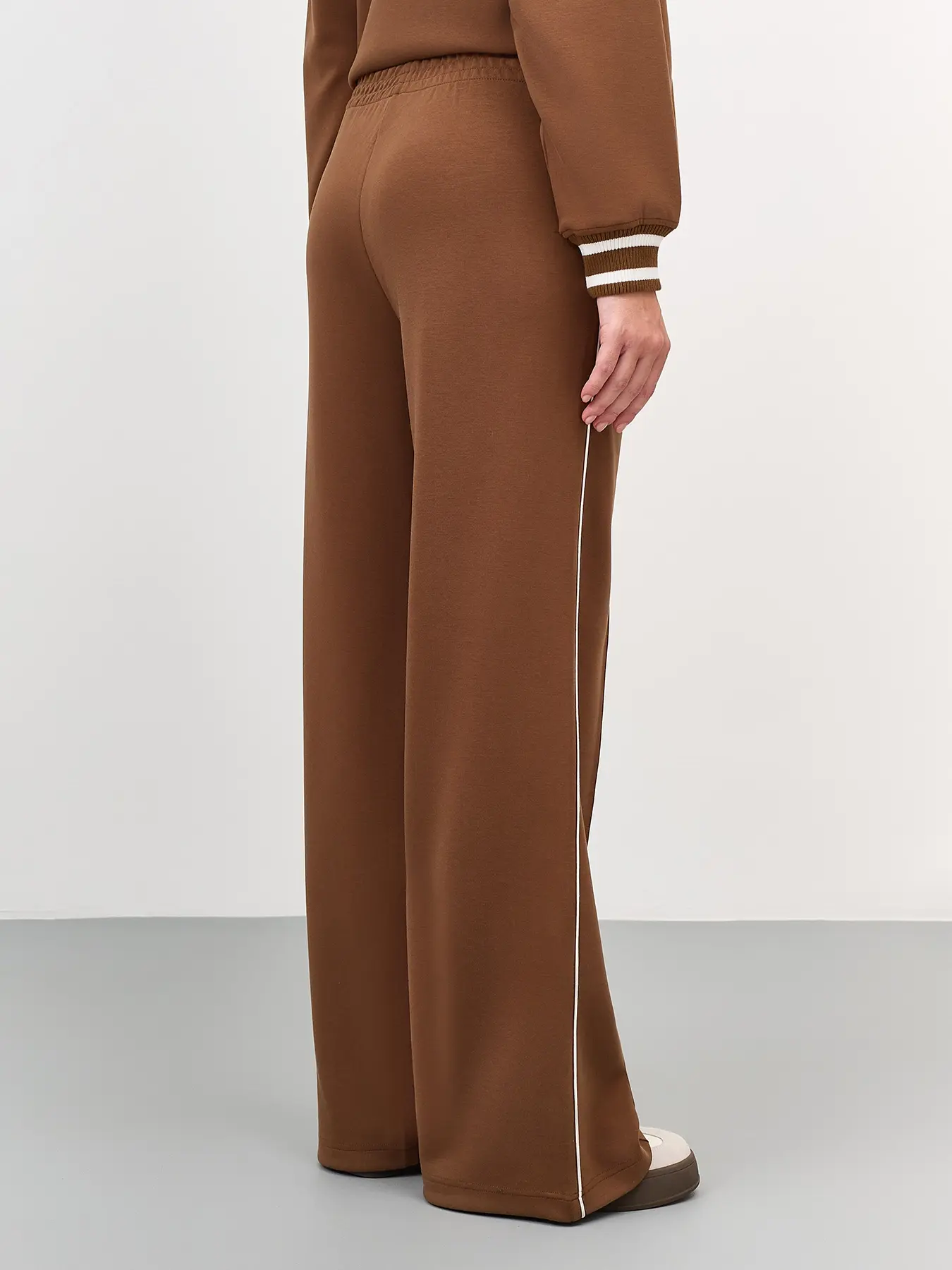 Трикотажные брюки свободного силуэта. Резинка по линии талии. Боковые карманы в швах. Дополнены контрастным кантом и отстроченными стрелками. В составе хлопок