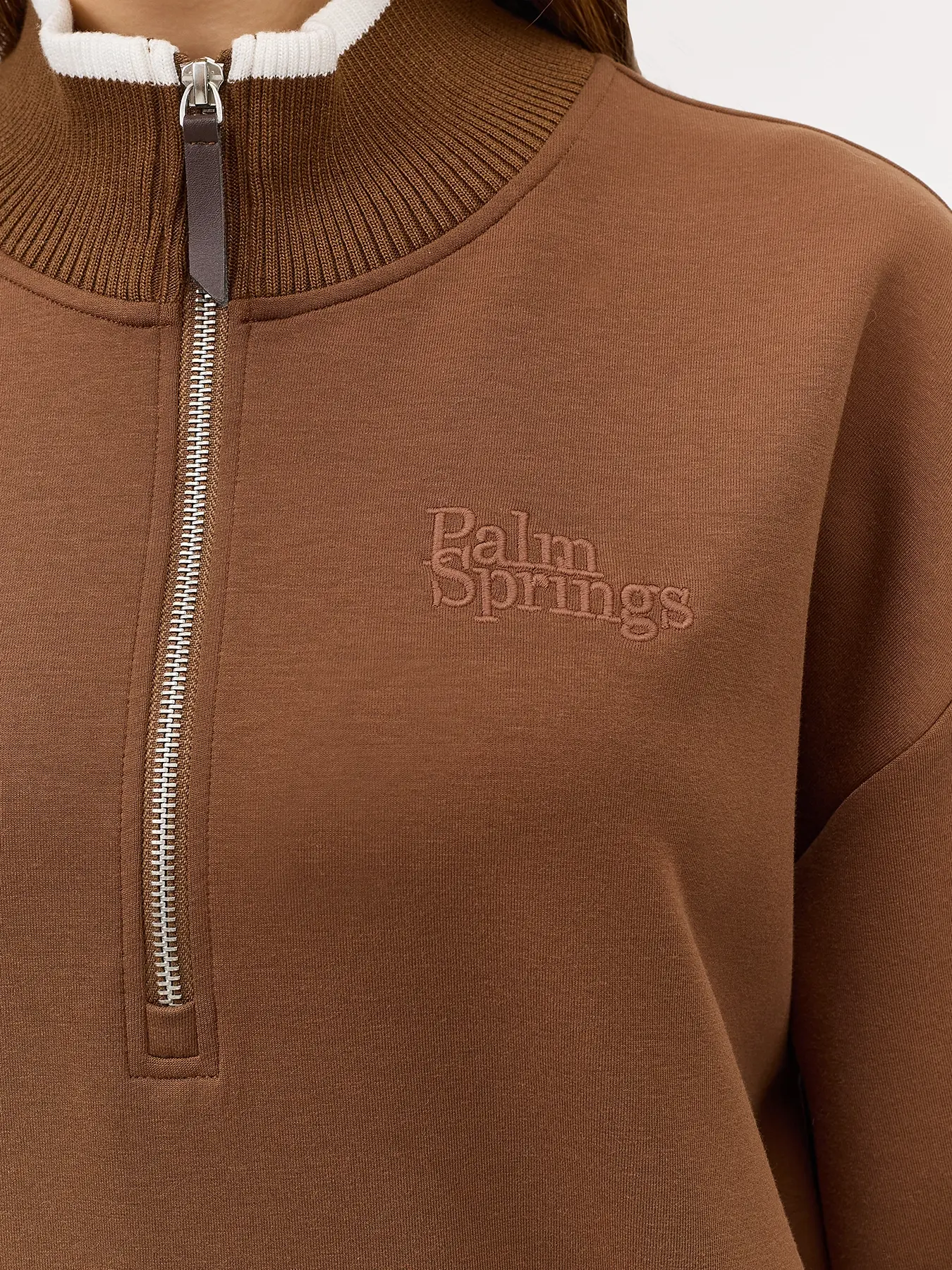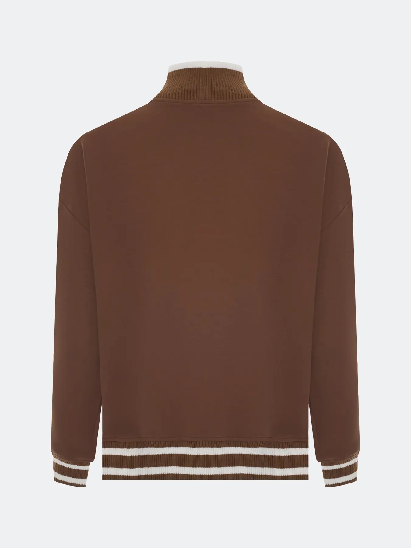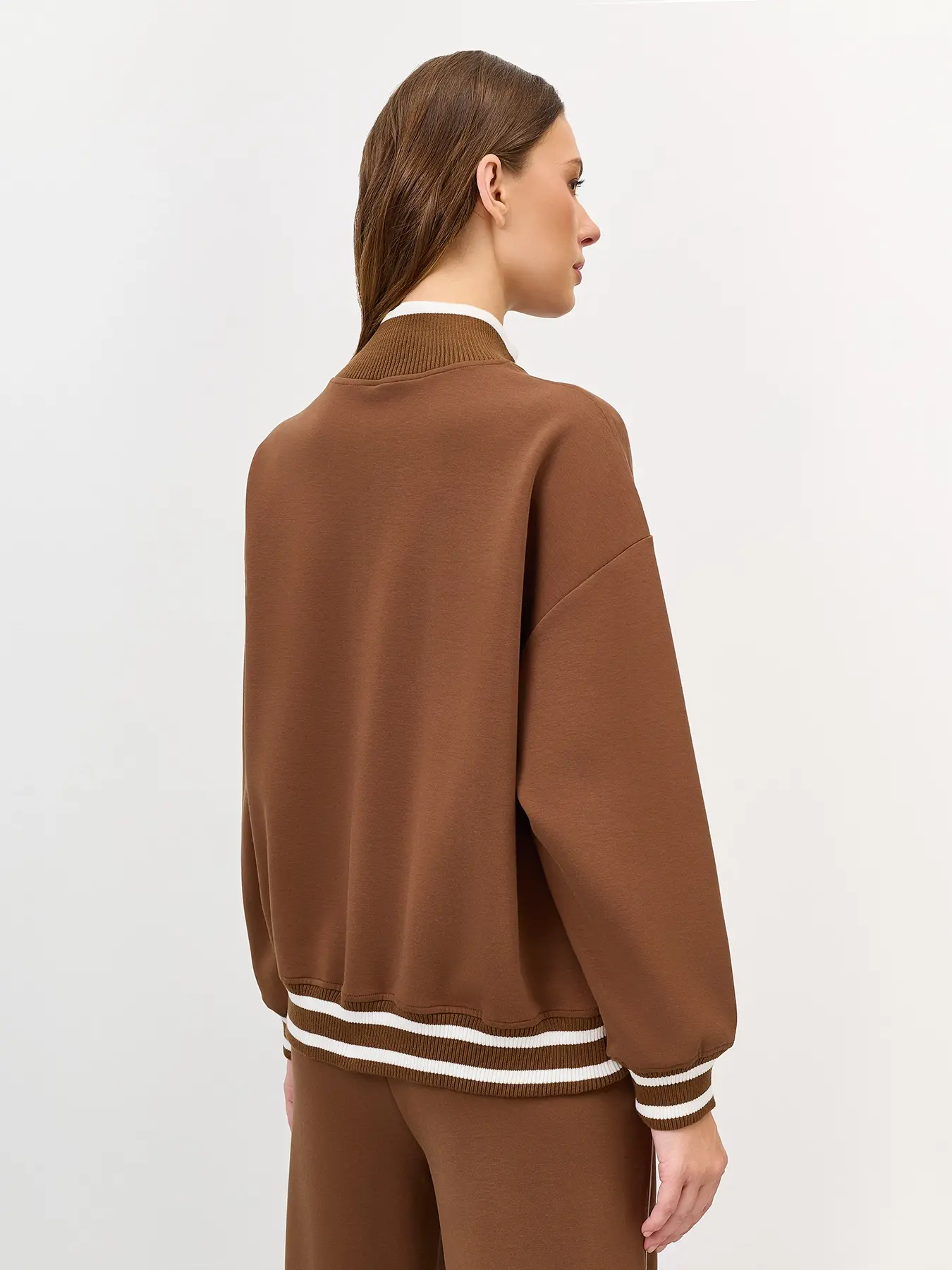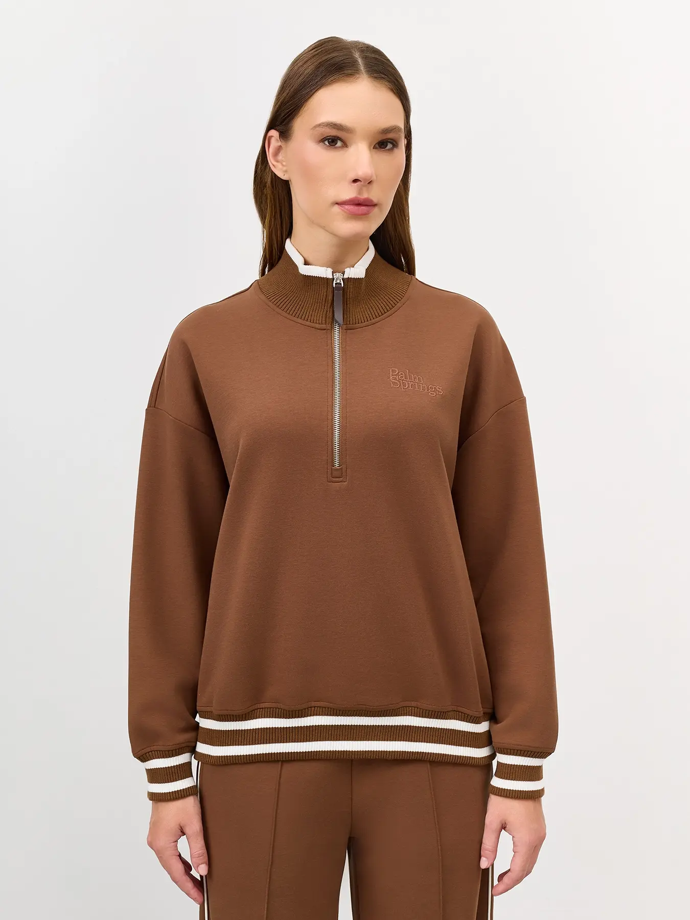 Джемпер с акцентной короткой молнией. Свободный силуэт. Воротник стойка на молнии. Спущенная линия плеч. Риб с контрастными полосами по низу изделия и рукавов. Декоративная вышивка в цвет.