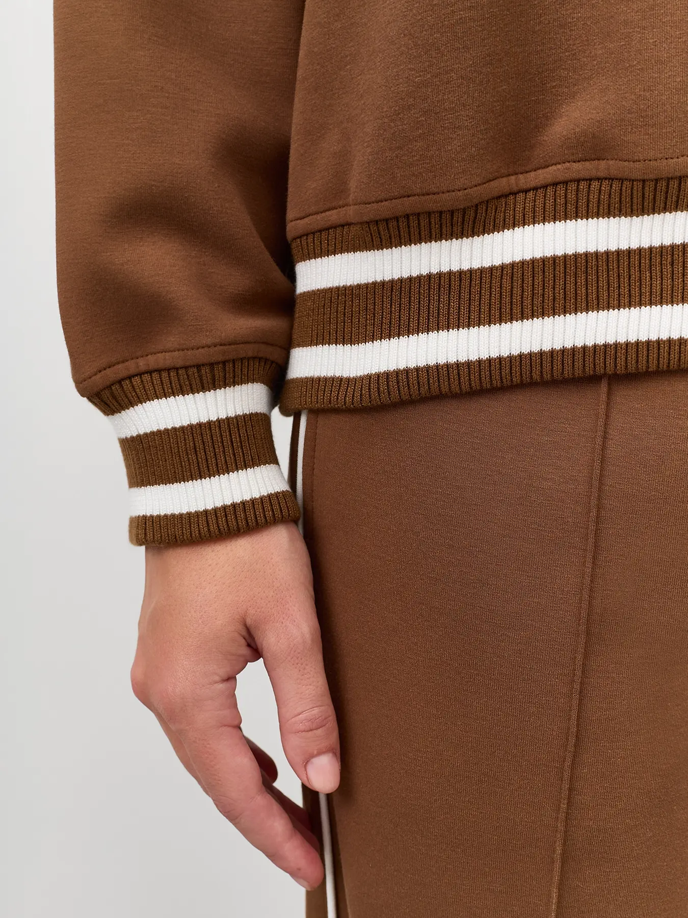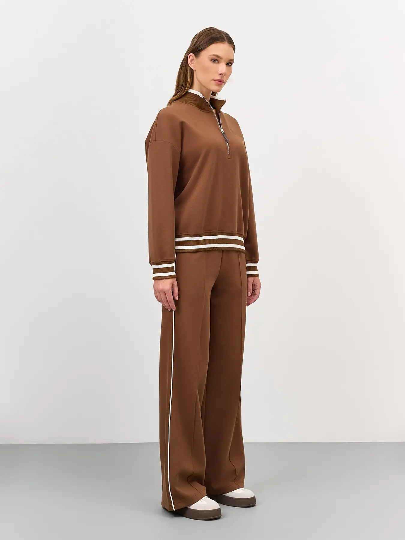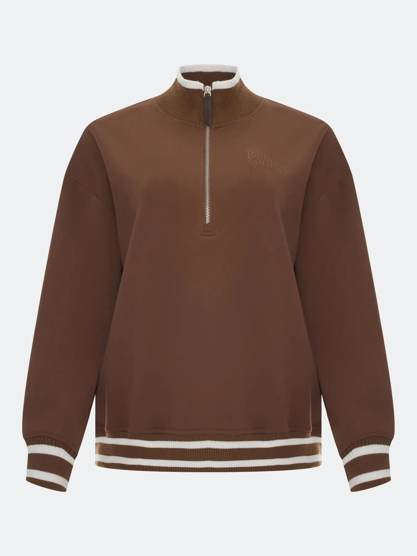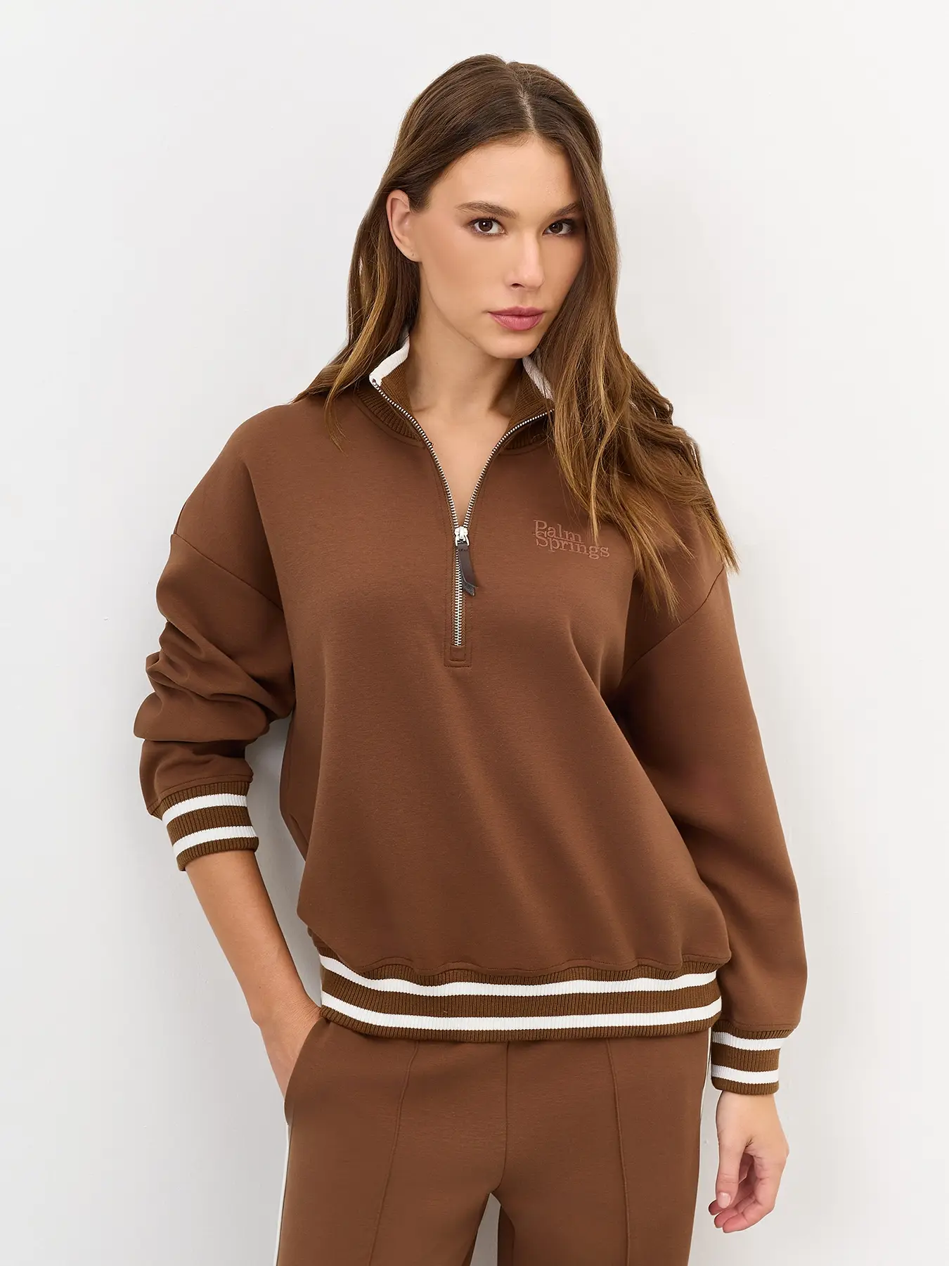 Джемпер с акцентной короткой молнией. Свободный силуэт. Воротник стойка на молнии. Спущенная линия плеч. Риб с контрастными полосами по низу изделия и рукавов. Декоративная вышивка в цвет.