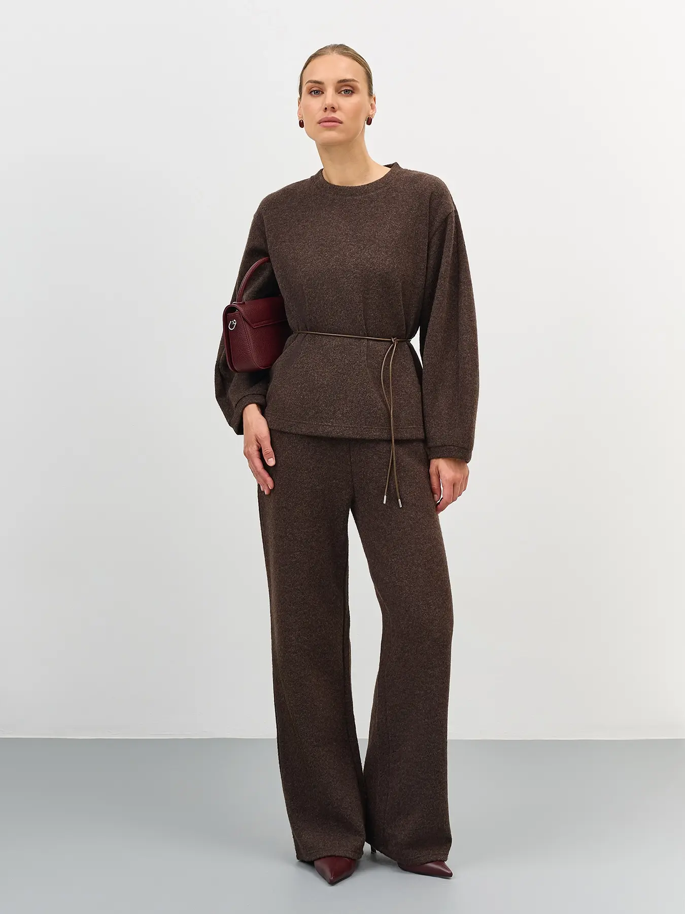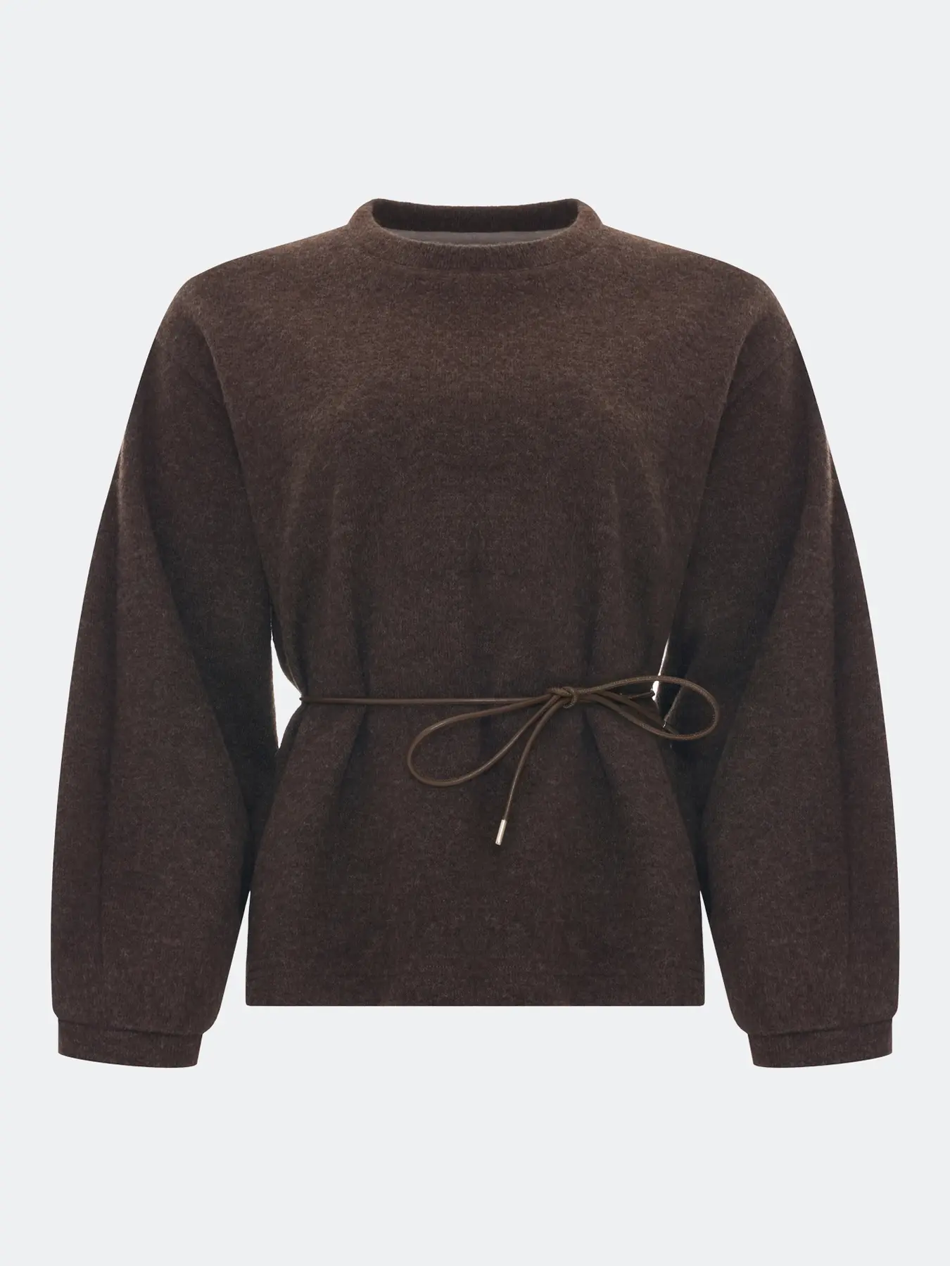 Свободный джемпер из пушистого трикотажа с тонким поясом из экокожи в комплекте. Воротник небольшая стойка. Спущенная линия плеч. Длинные объемные рукава с резинкой по низу. В составе шерсть.