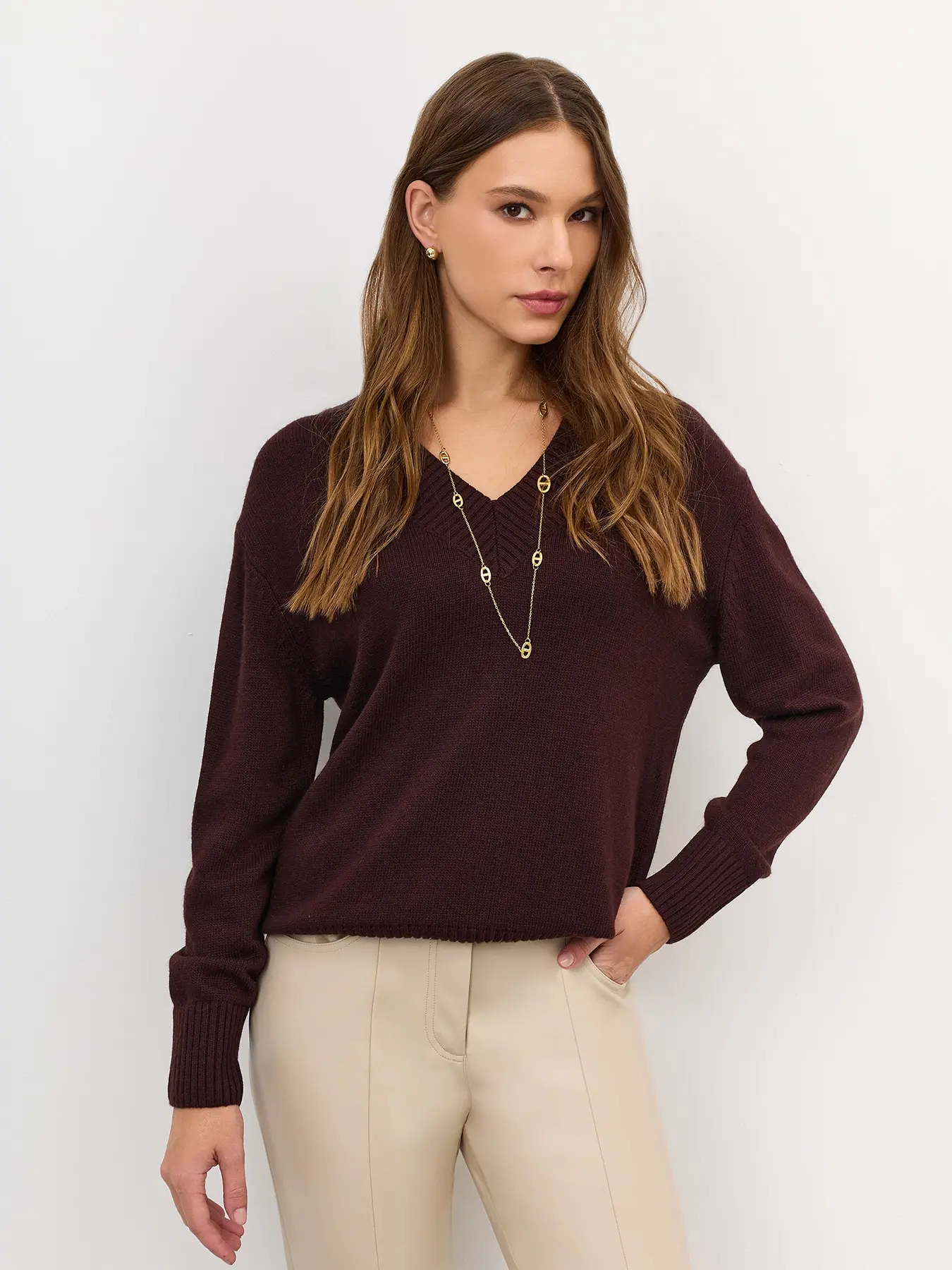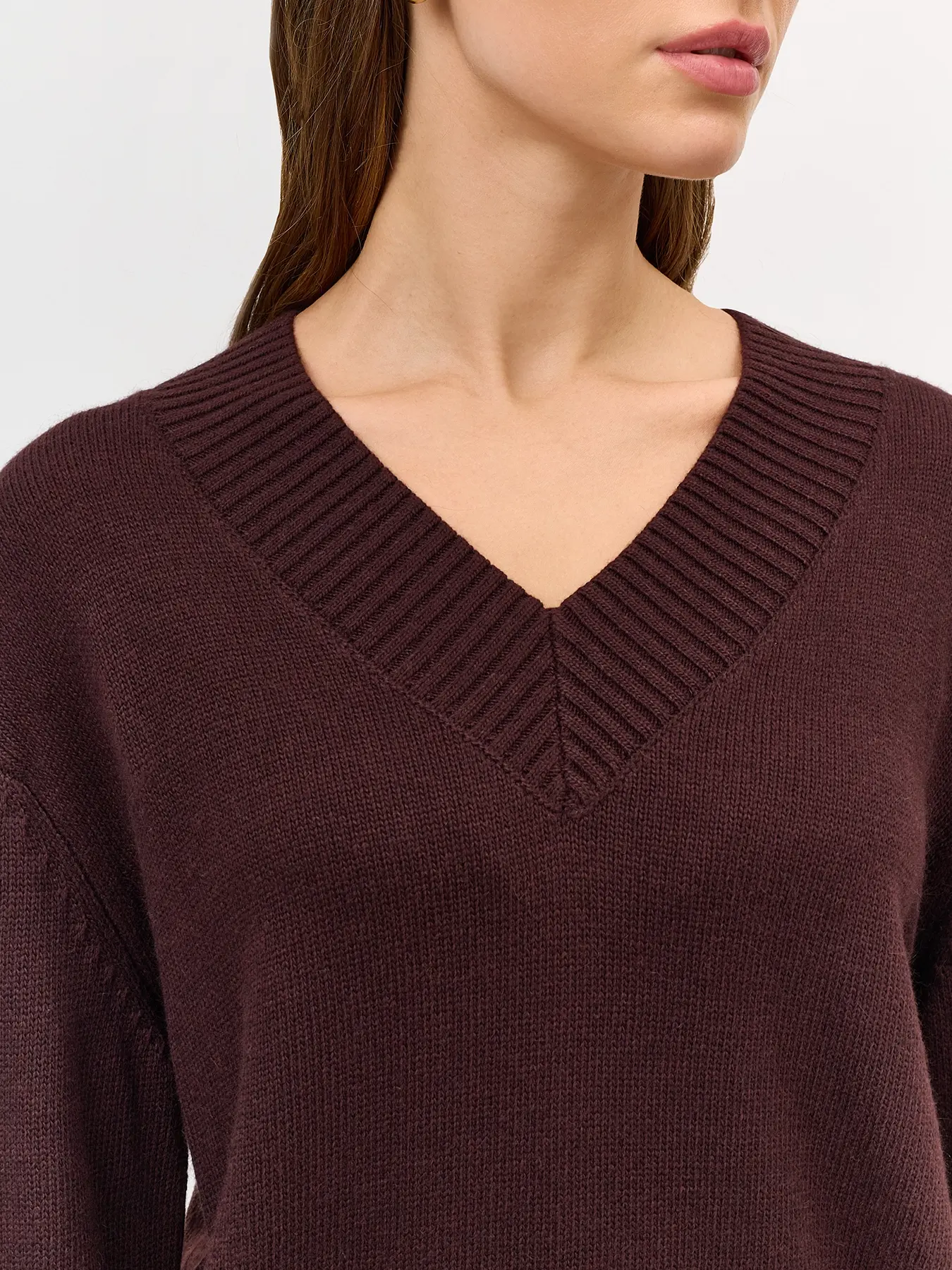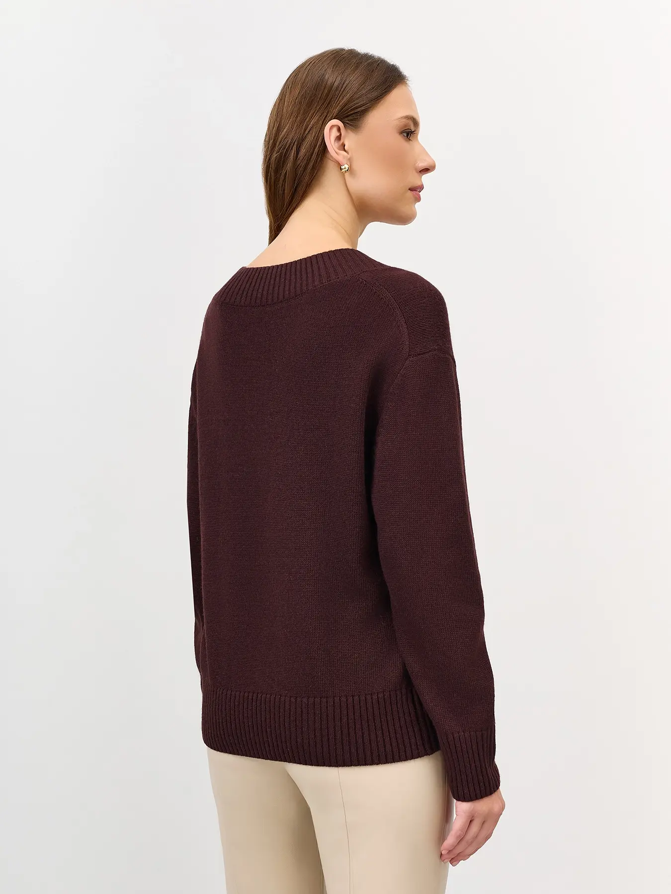 Базовый джемпер с V-образным вырезом и ангорой в составе. Свободный силуэт. Спущенная линия плеч. Широкие манжеты по горловине, низу рукавов и изделия.