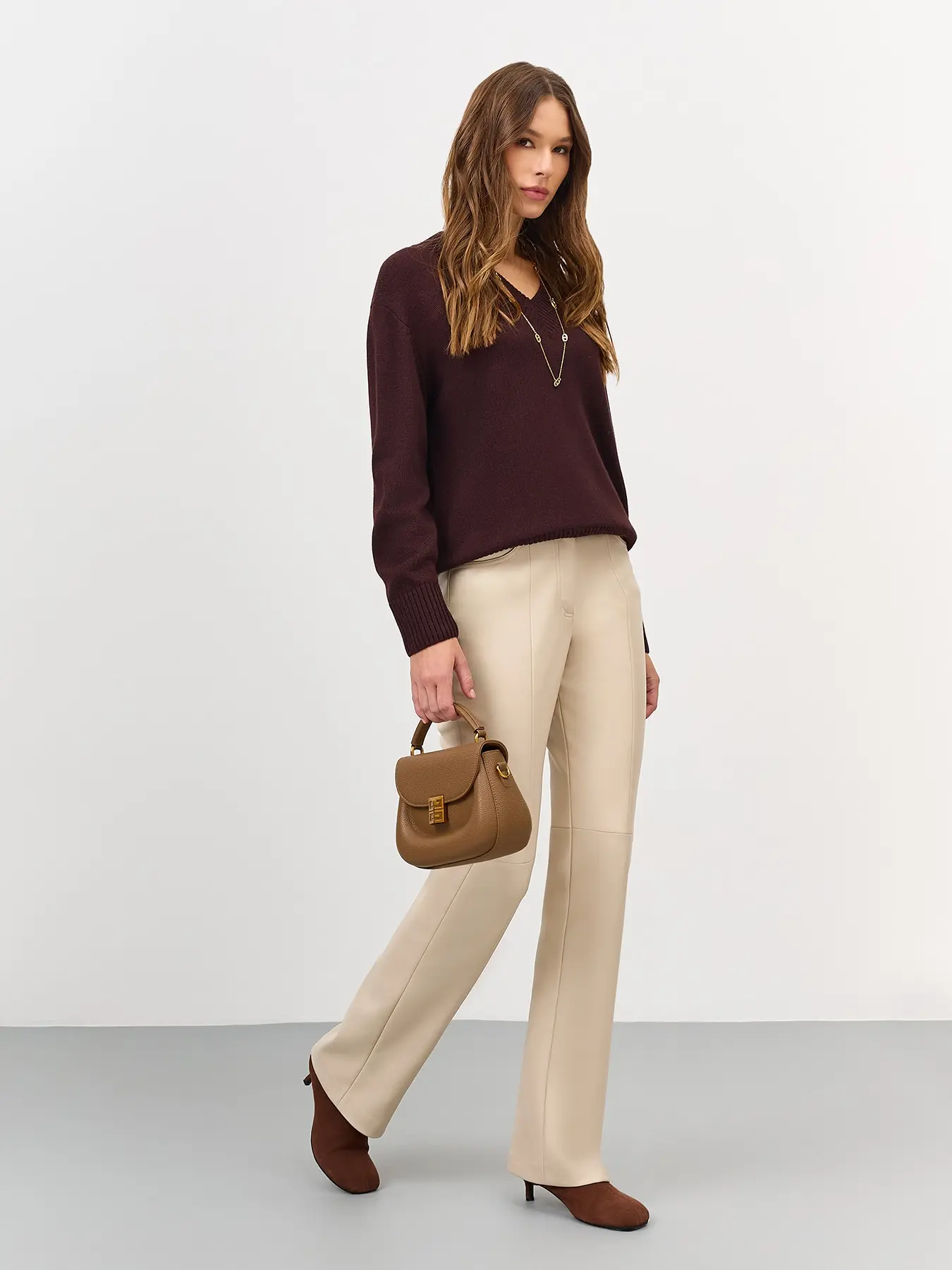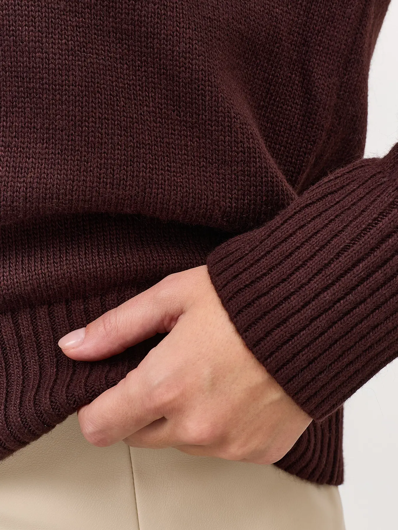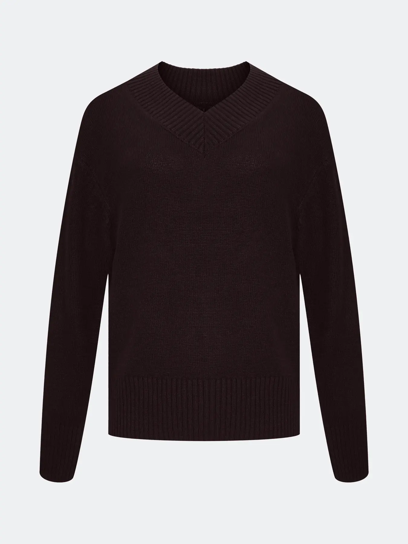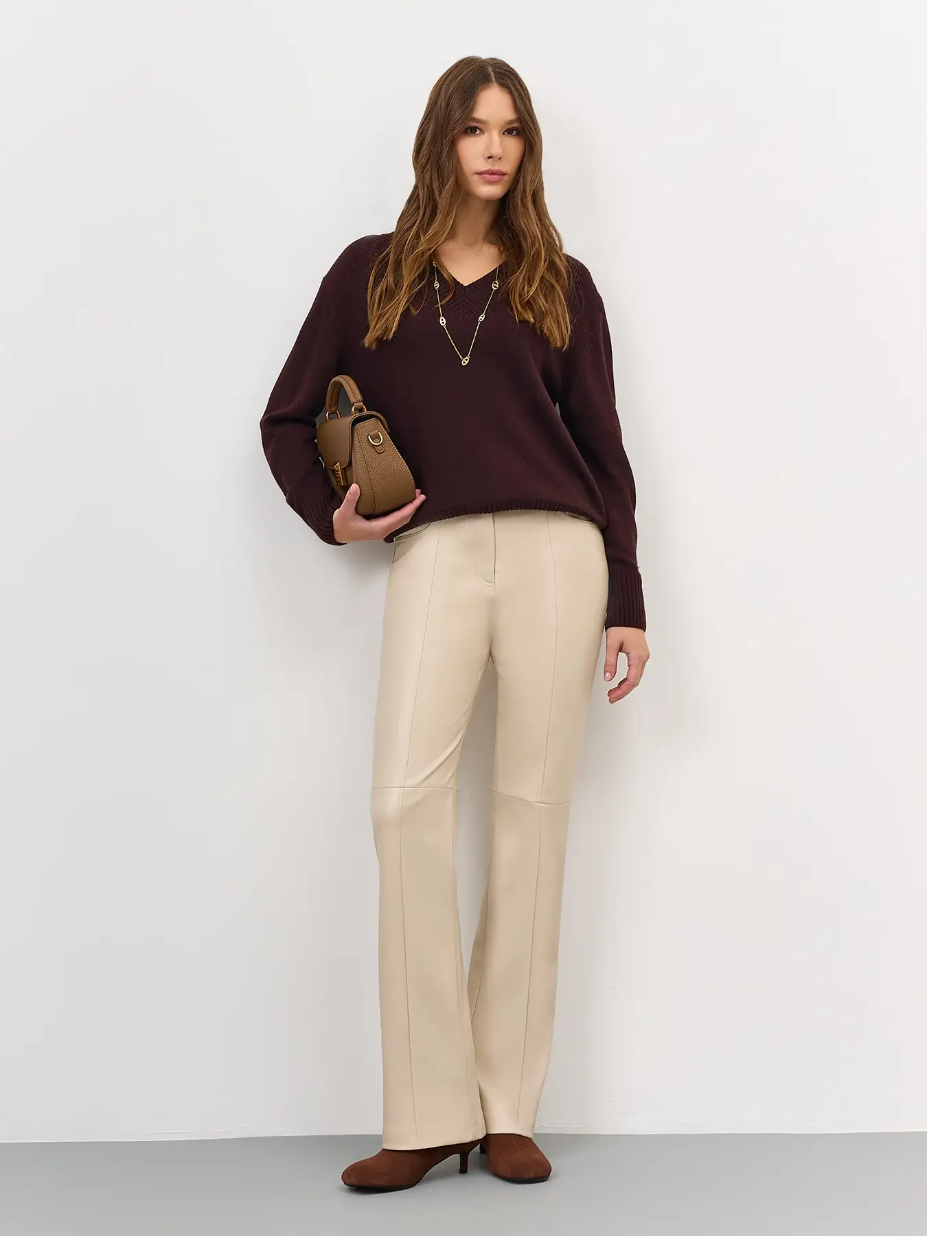 Базовый джемпер с V-образным вырезом и ангорой в составе. Свободный силуэт. Спущенная линия плеч. Широкие манжеты по горловине, низу рукавов и изделия.