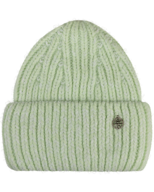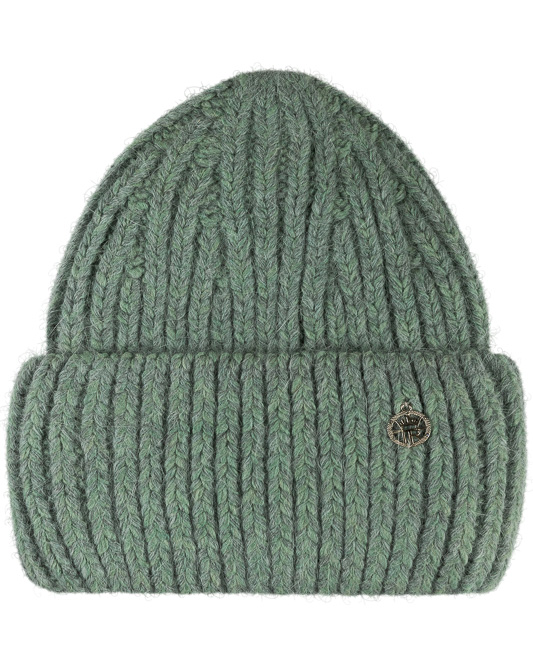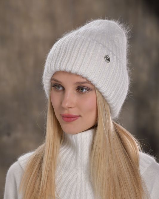 Шапка объёмной вязки, формы бини и с широким отворотом, декорирована металлическим лейблом.